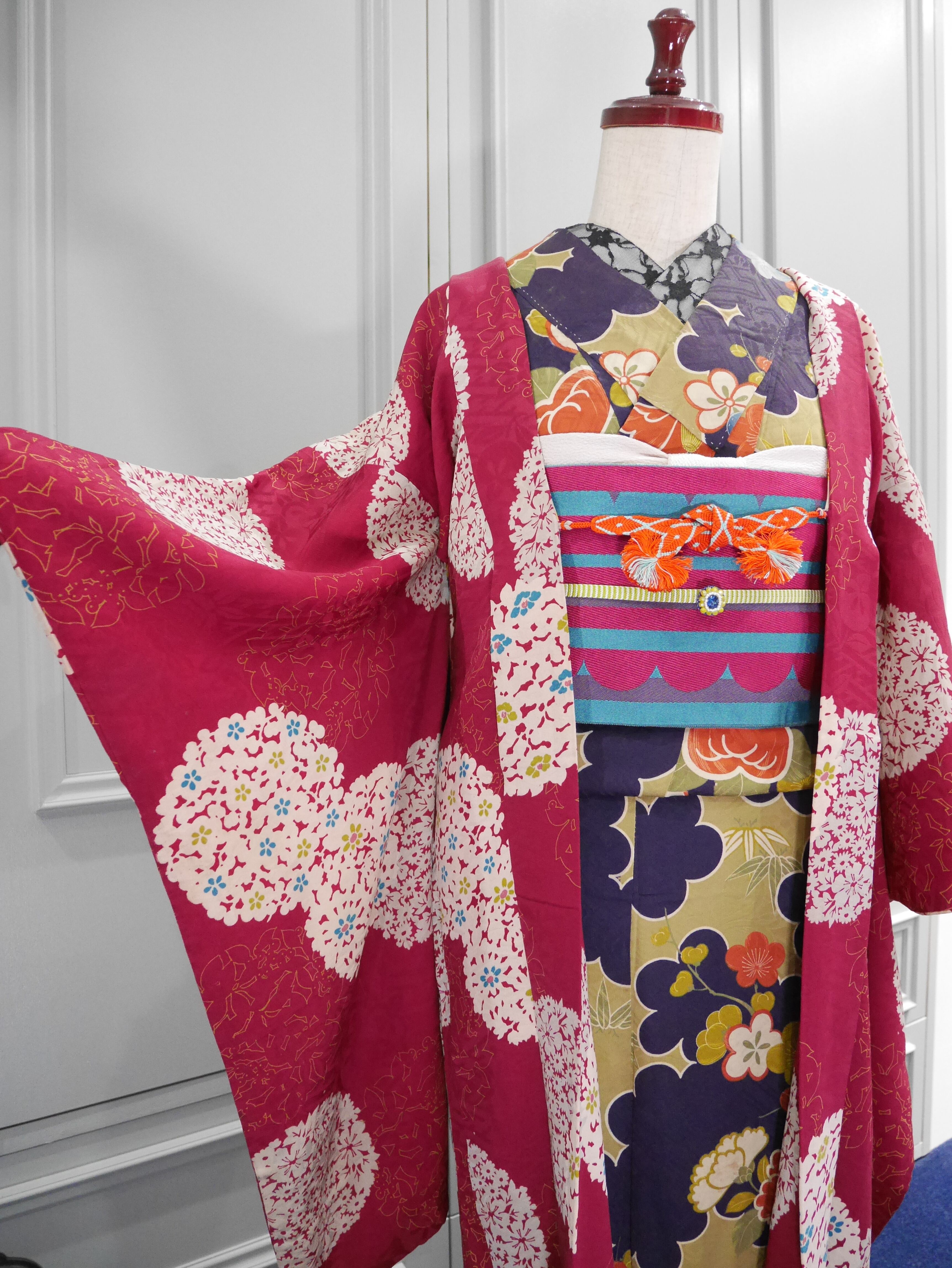 ローズレッドにまあるいお花模様がモダンなアンティーク長羽織です。