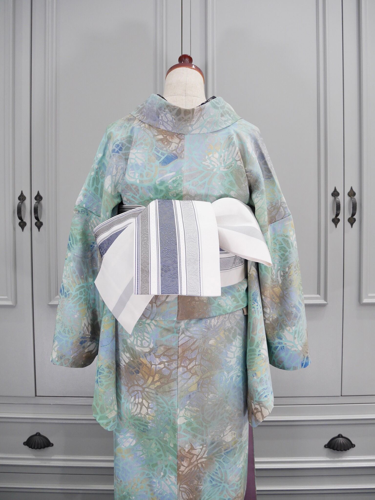 アクアグリーンに独特な模様が美しいリサイクル小紋着物です。