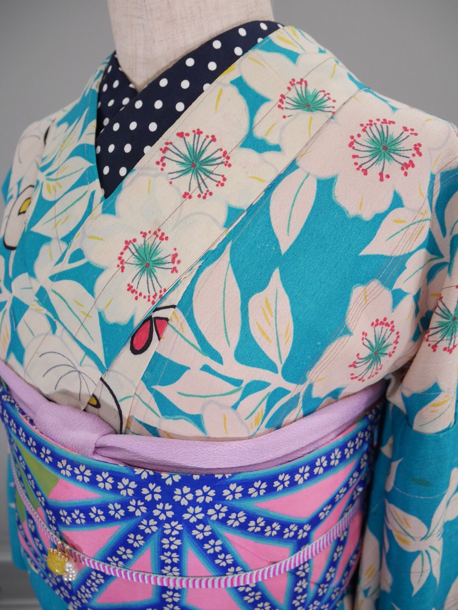 スカイブルーに桜と橘の模様が爽やかなアンティーク小紋着物です。