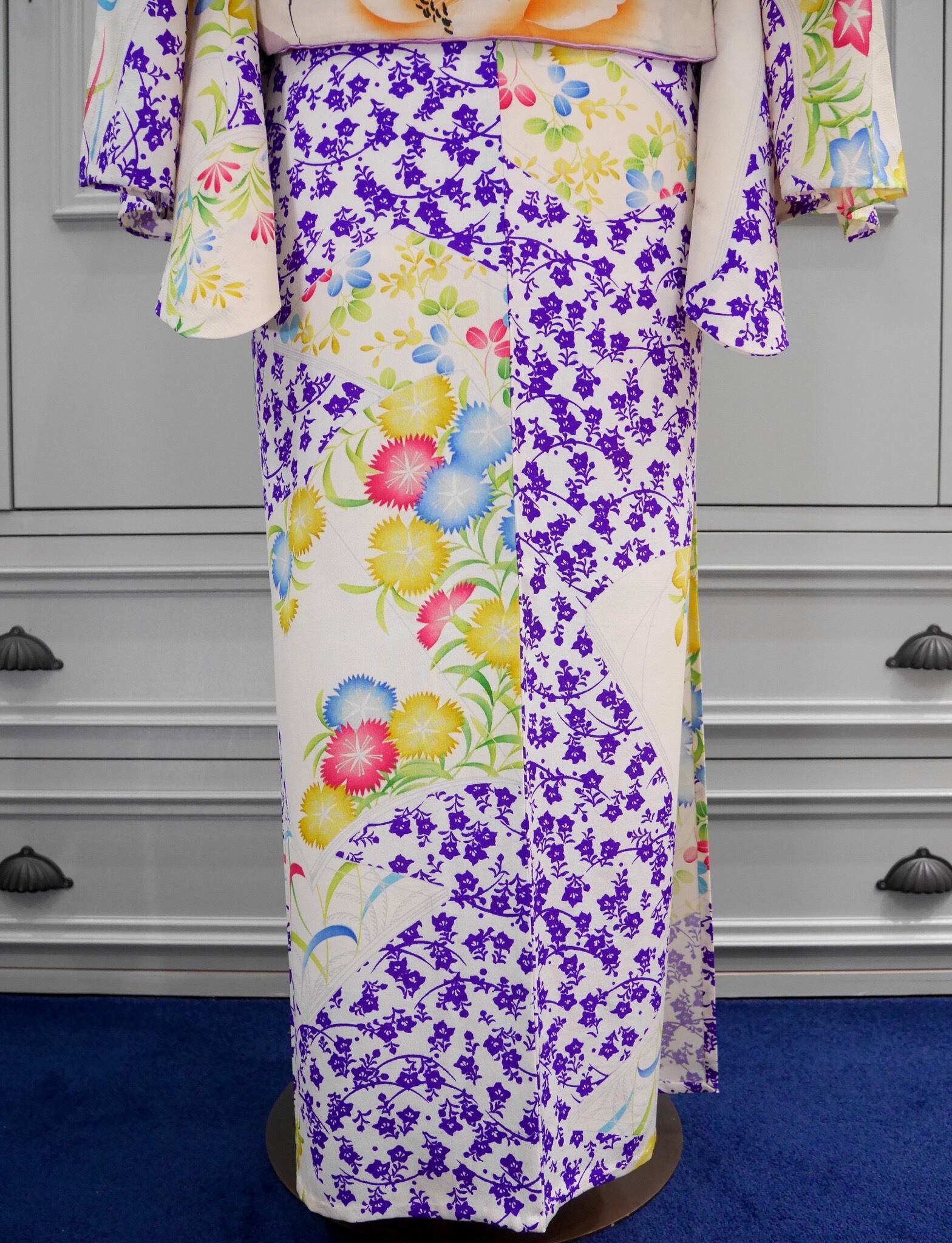 爽やかな地色のアイボリーと鮮やかな紫の小花柄のコントラストがアンティークならではの色使いで、目を惹かれます!