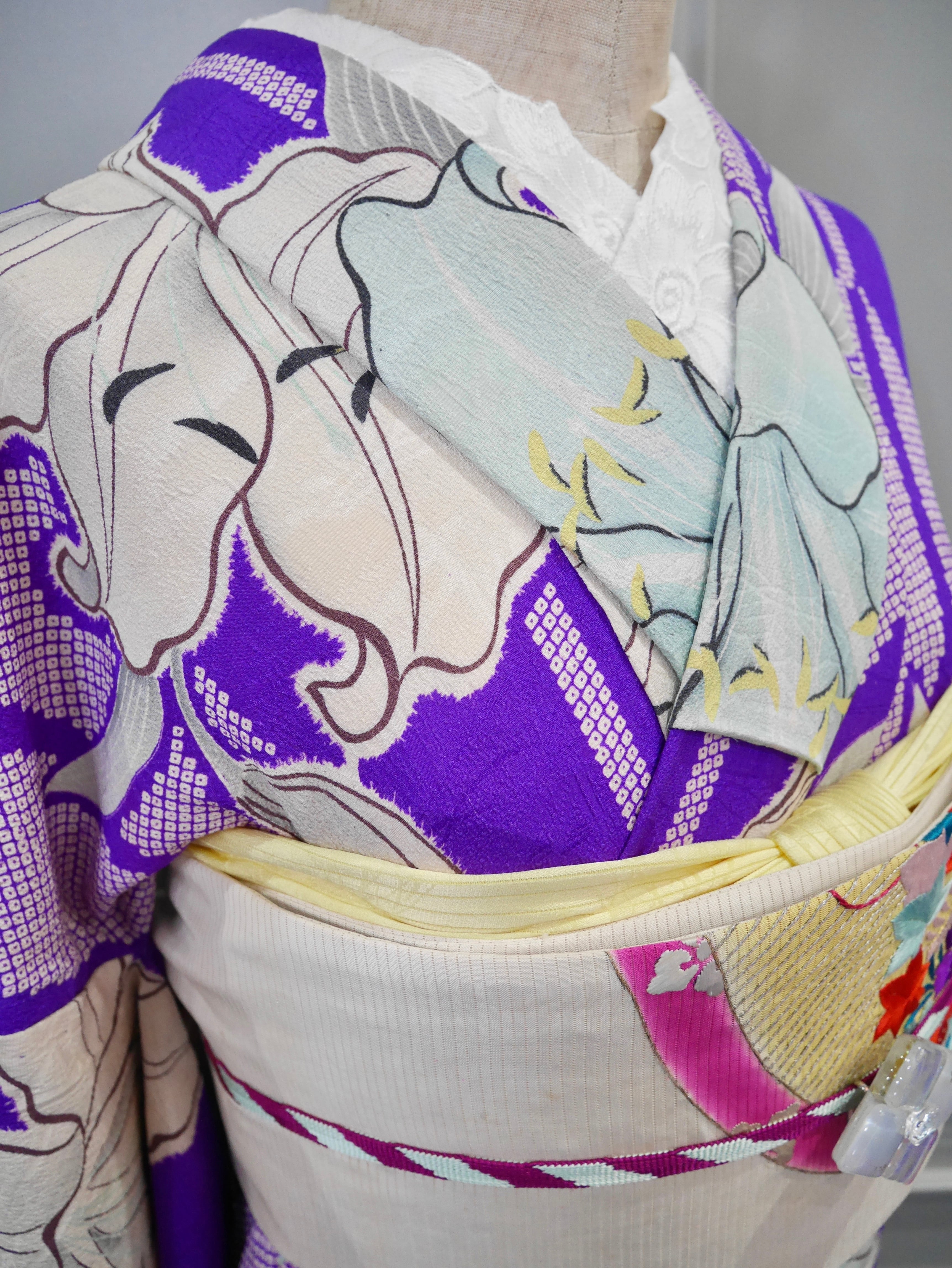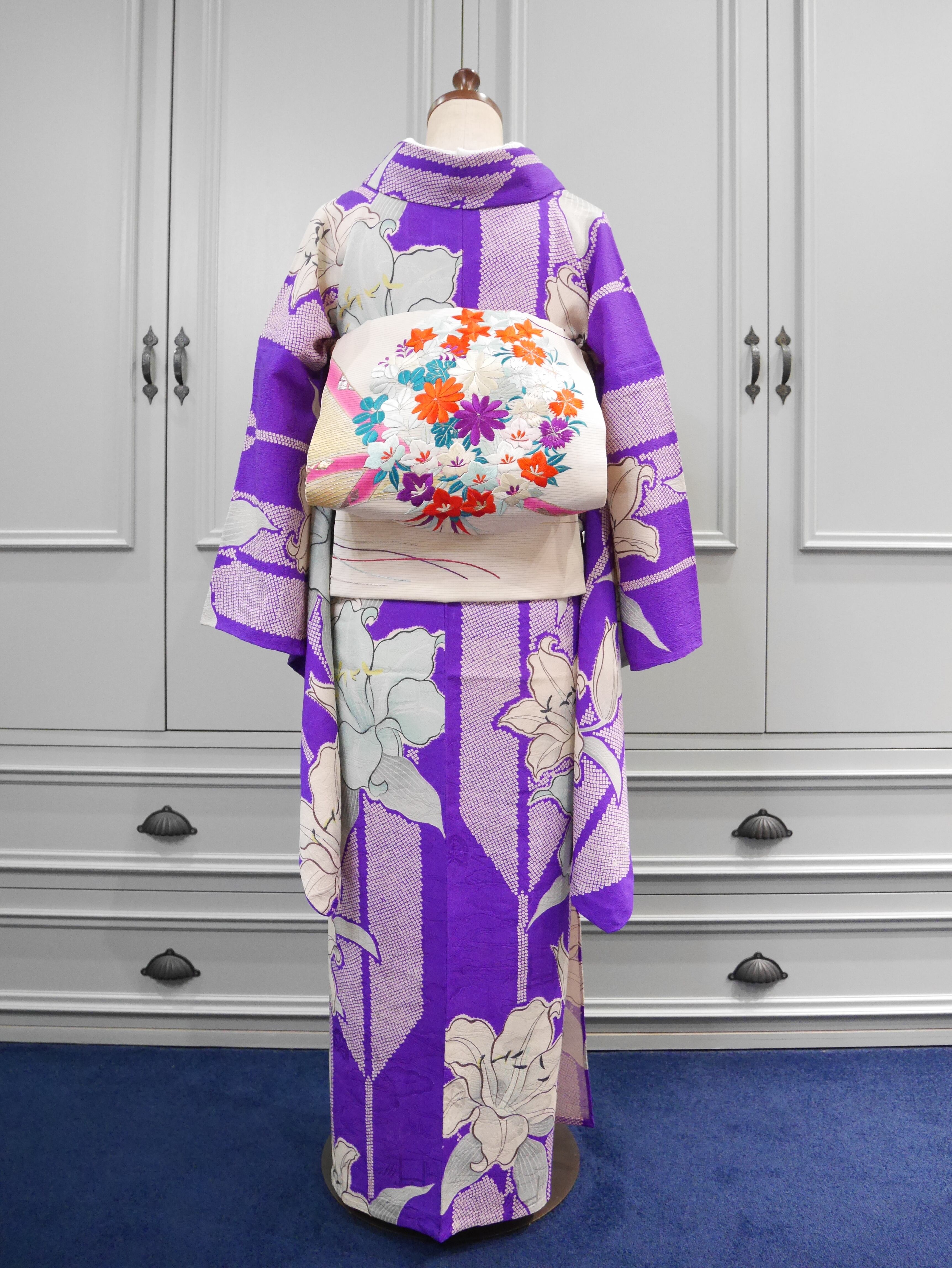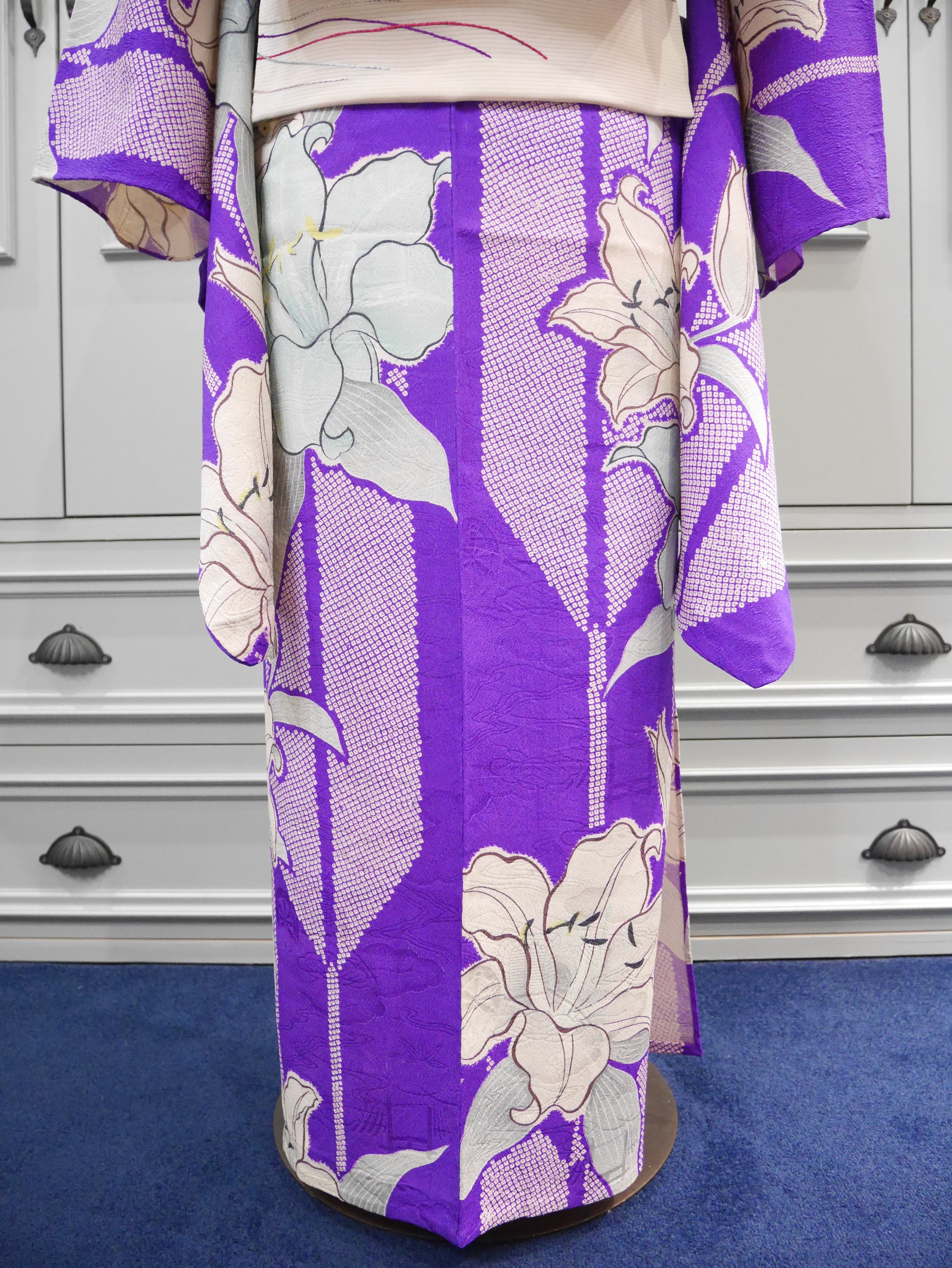 単衣*パープル 百合×矢羽根柄 アンティーク小紋キモノ 0298