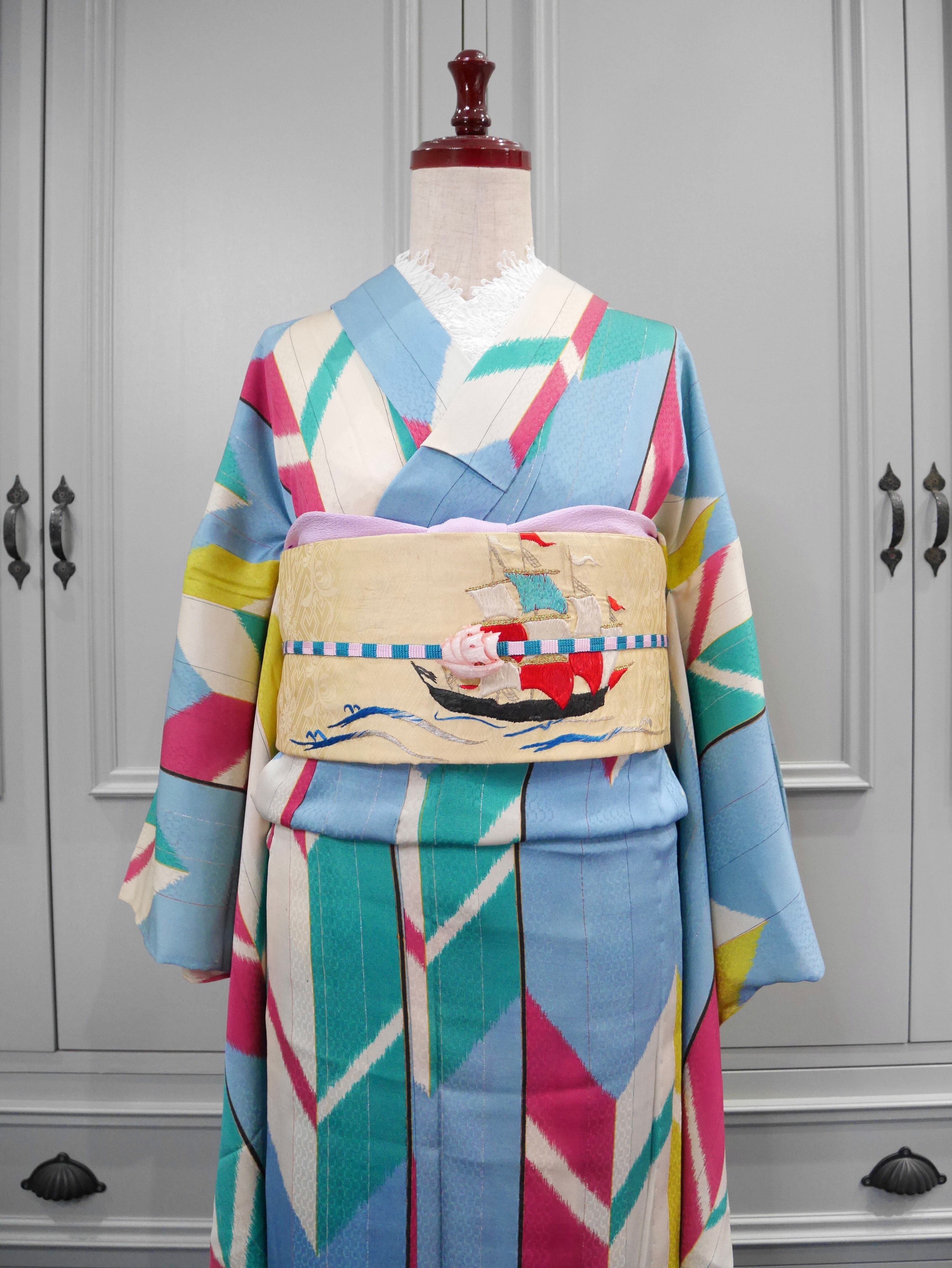 やさしい空色にマリンカラーな矢羽根柄が可愛いアンティーク単衣着物です!