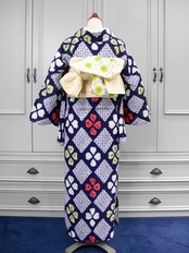 紺地にダイヤとクローバー柄のレトロなデザインが可愛い有松鳴海絞り浴衣です!