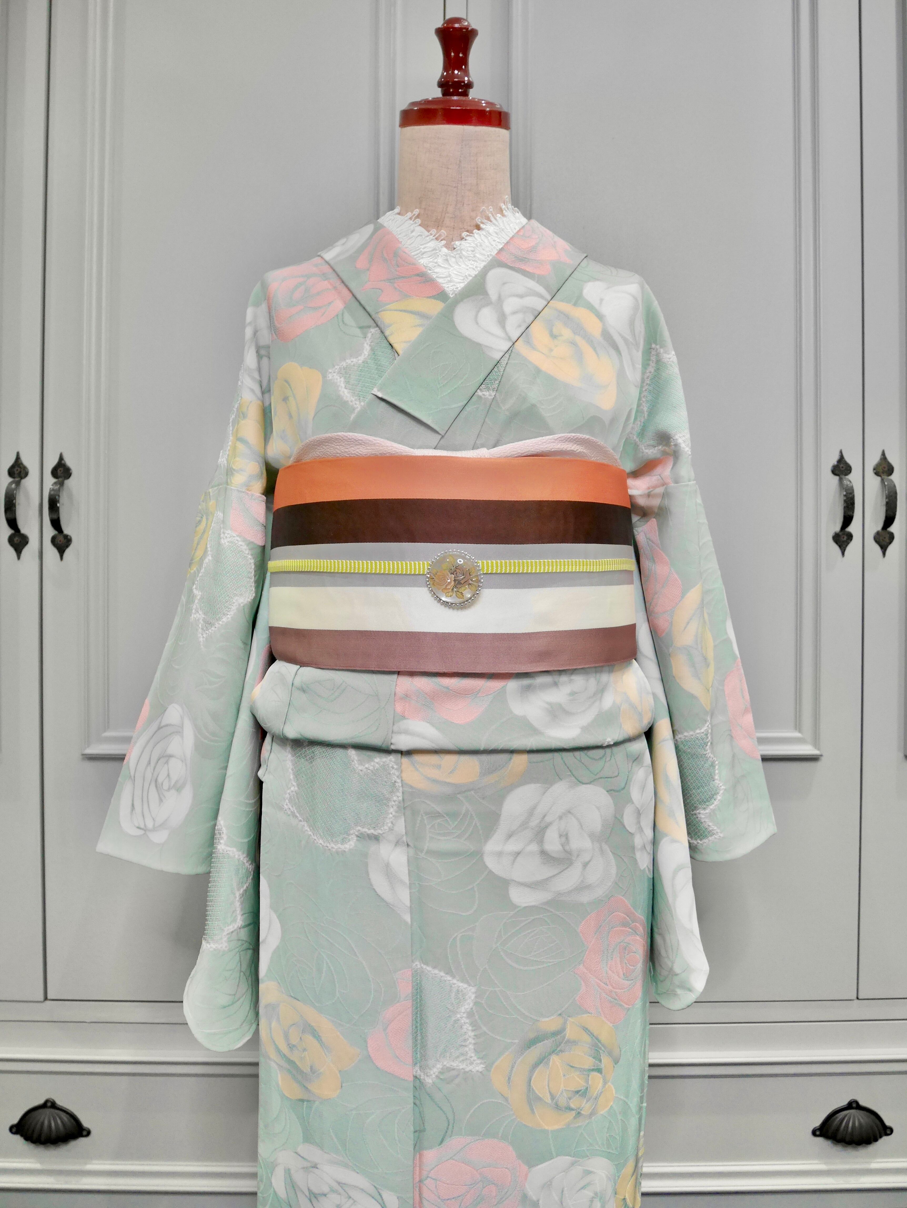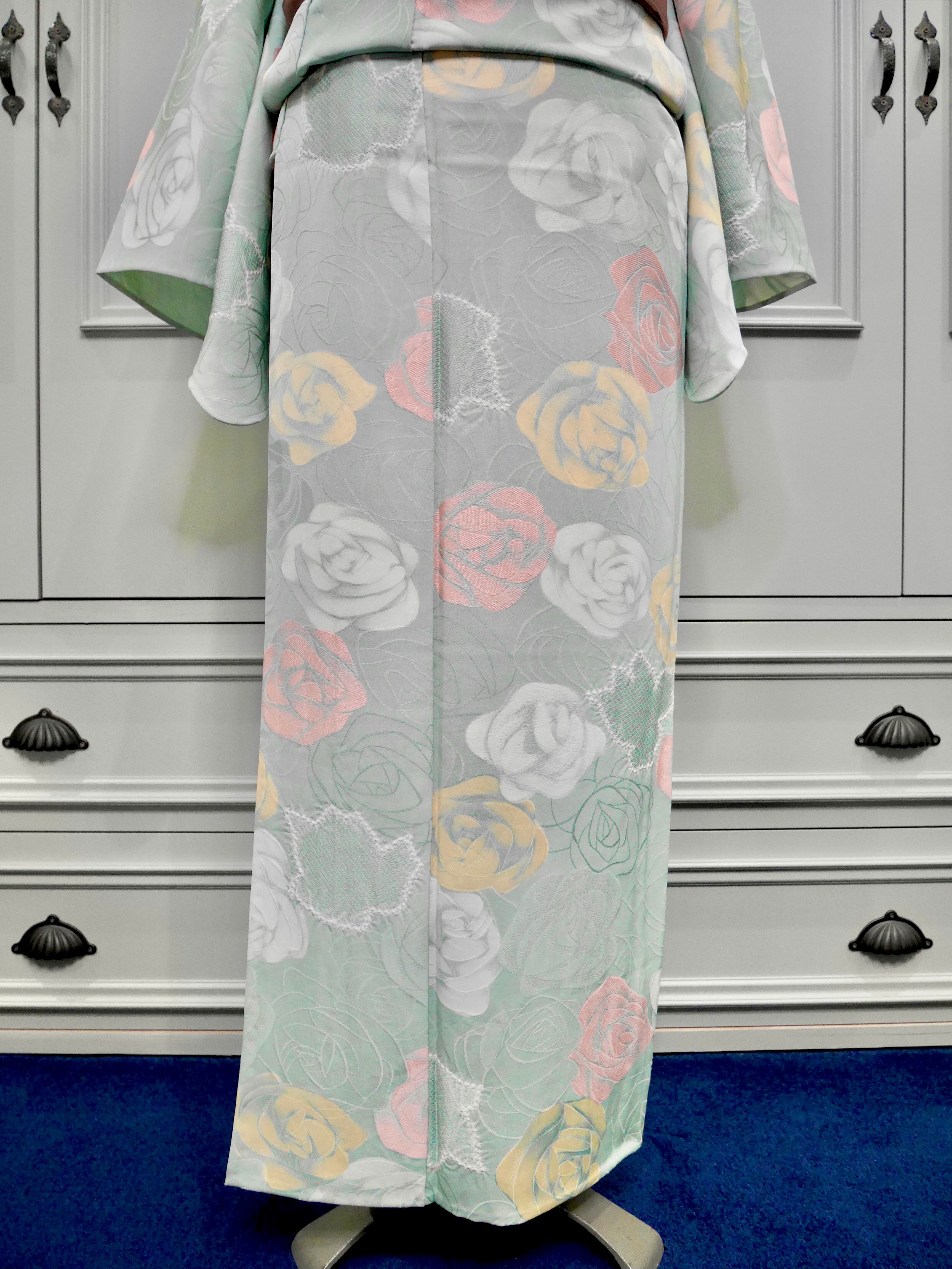 ダスティなミントグリーンに薔薇柄が美しいリサイクルの小紋単衣着物です!