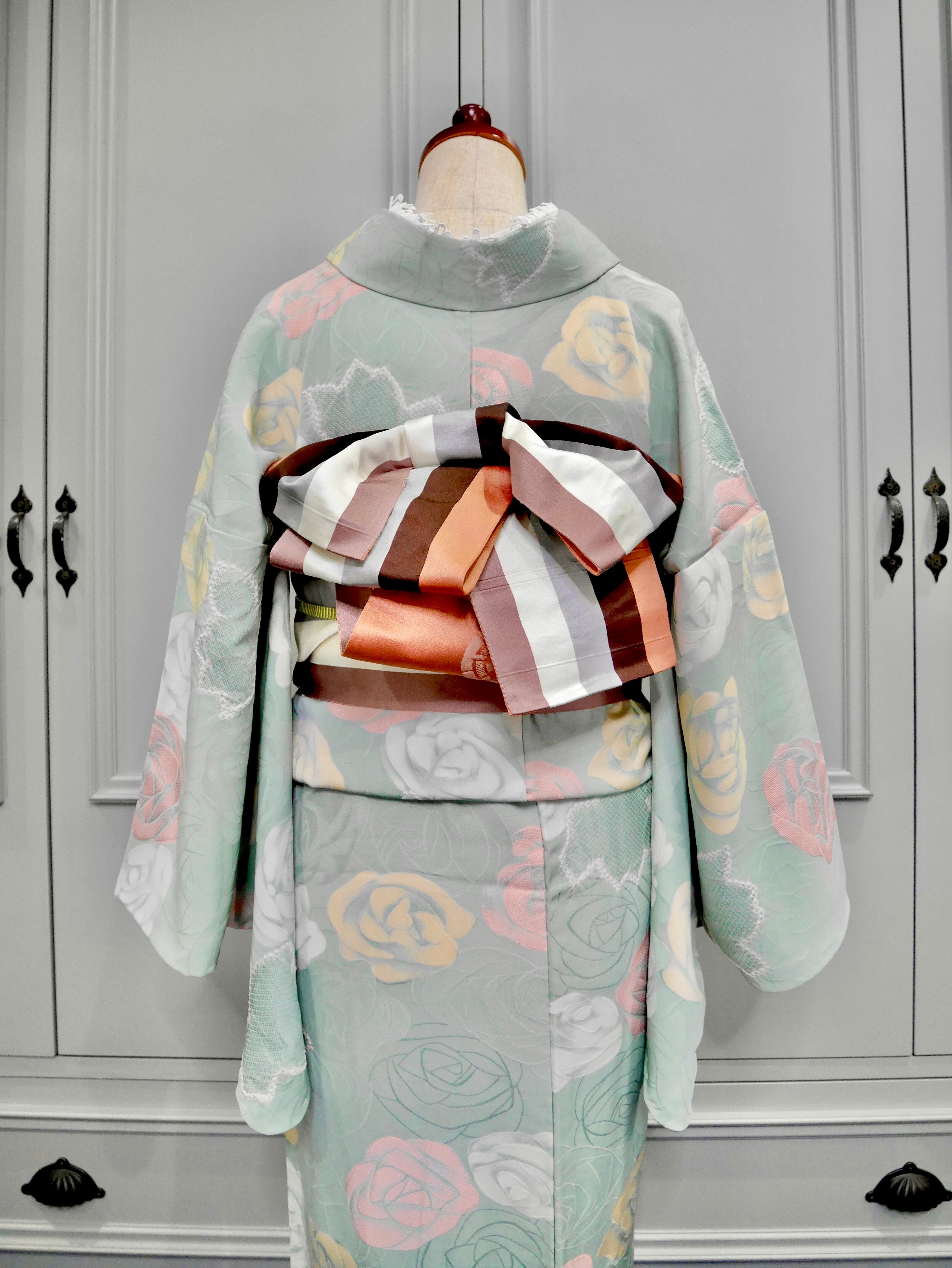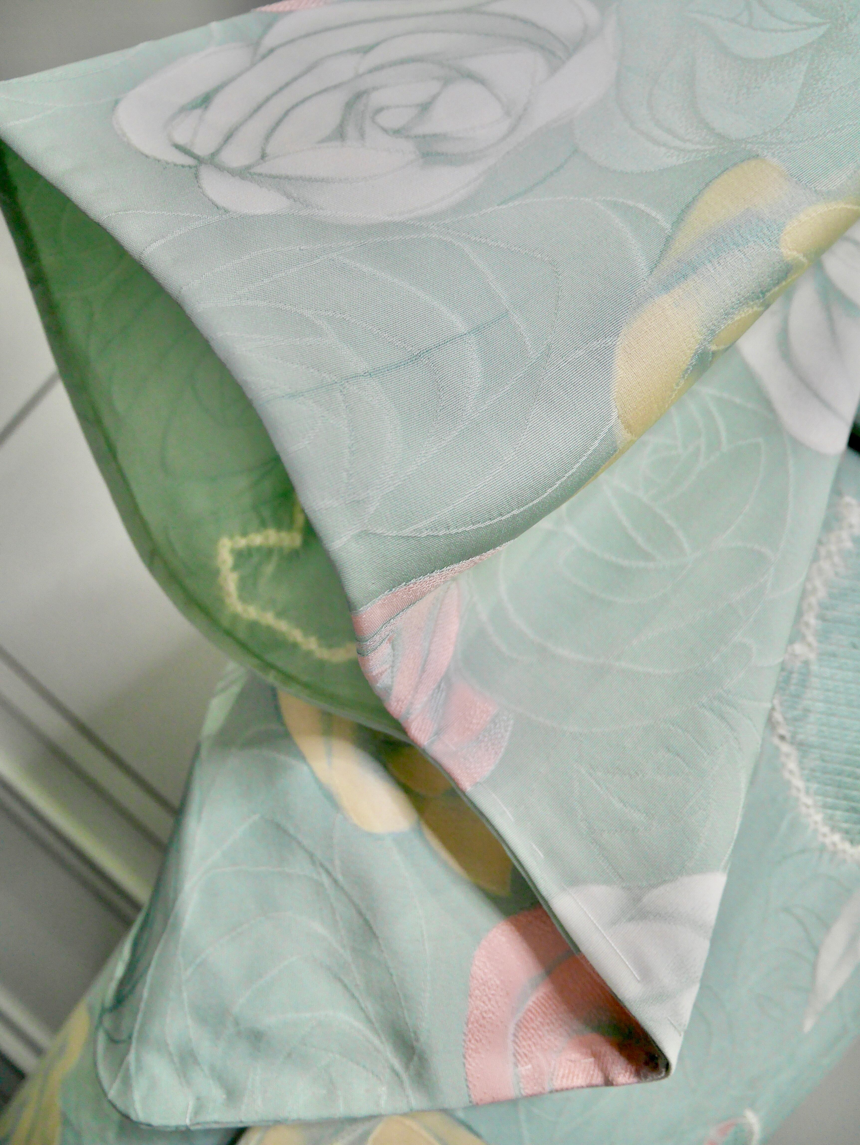 よく見ると、葉っぱの模様は絞りになっていて、地模様も薔薇柄で薔薇好きさんにはたまらないですね♡