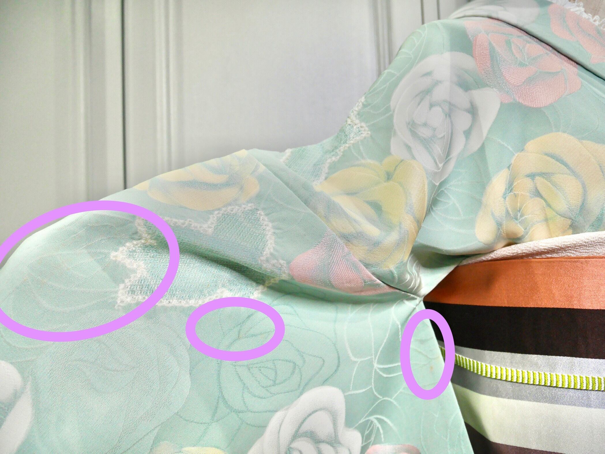 (シミなどの箇所を○で示していますので写真にてご確認ください。)