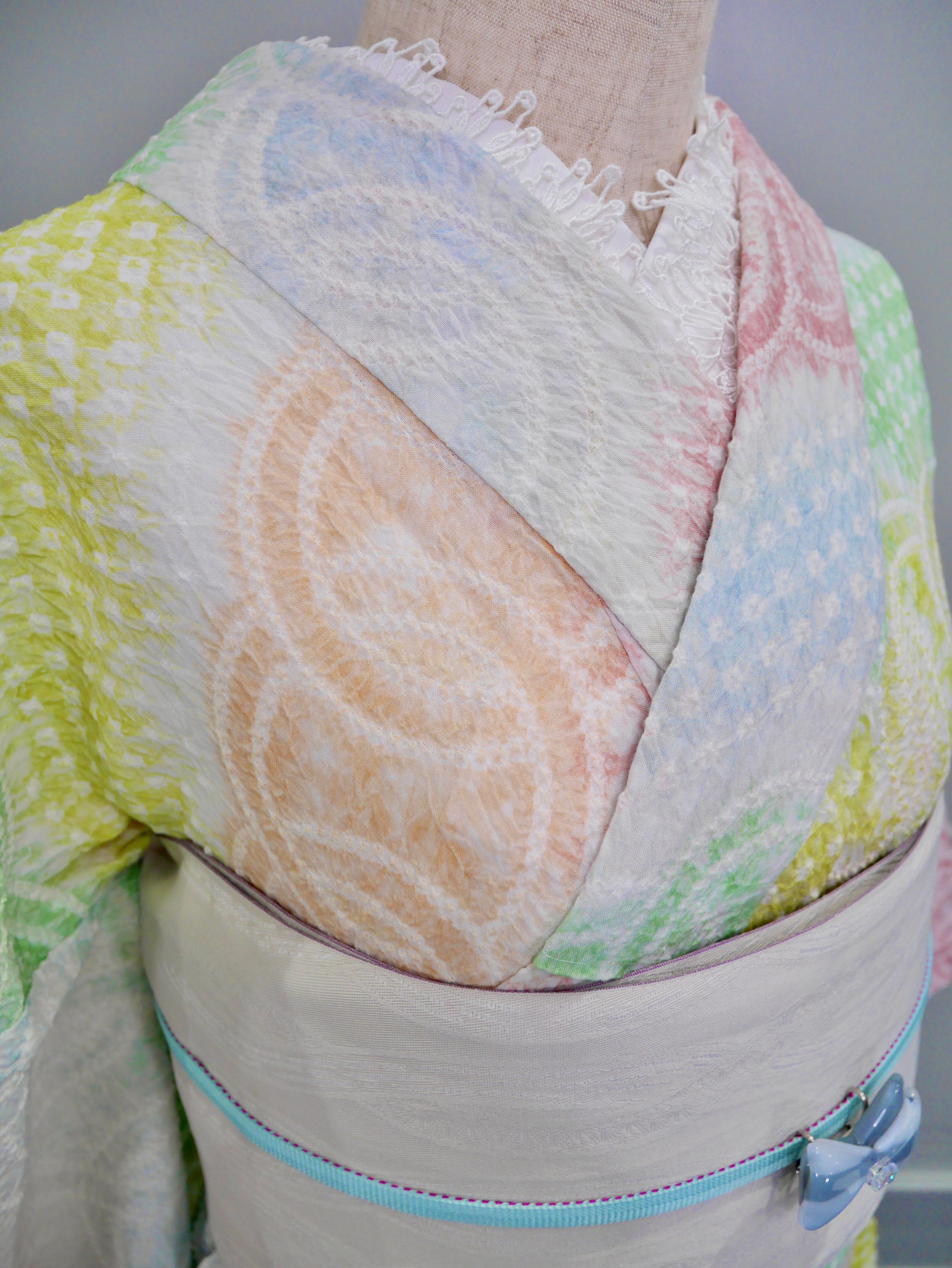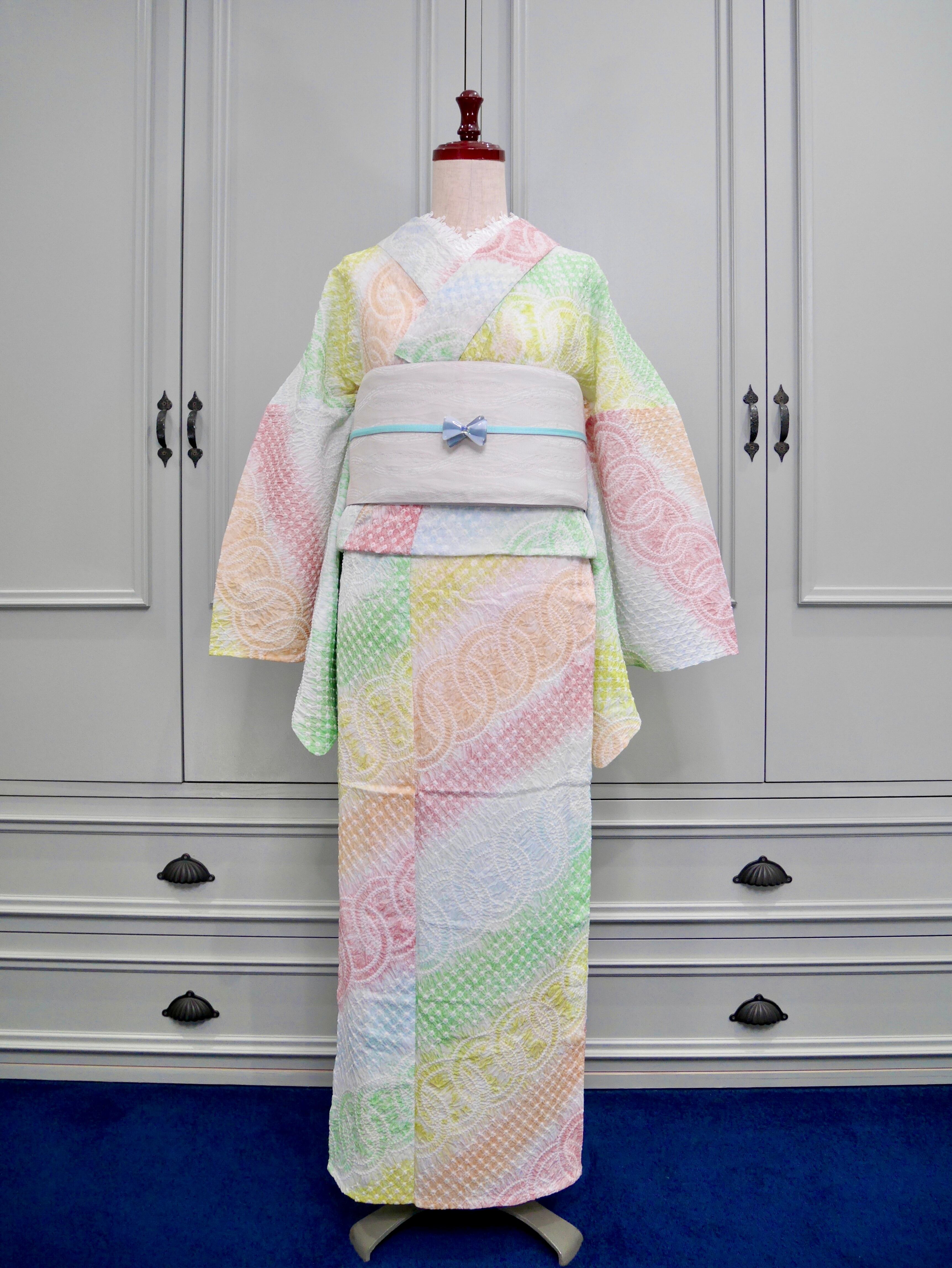 パステルカラーの虹色グラデーションがドリーミーで可愛らしい有松鳴海絞り浴衣です!
