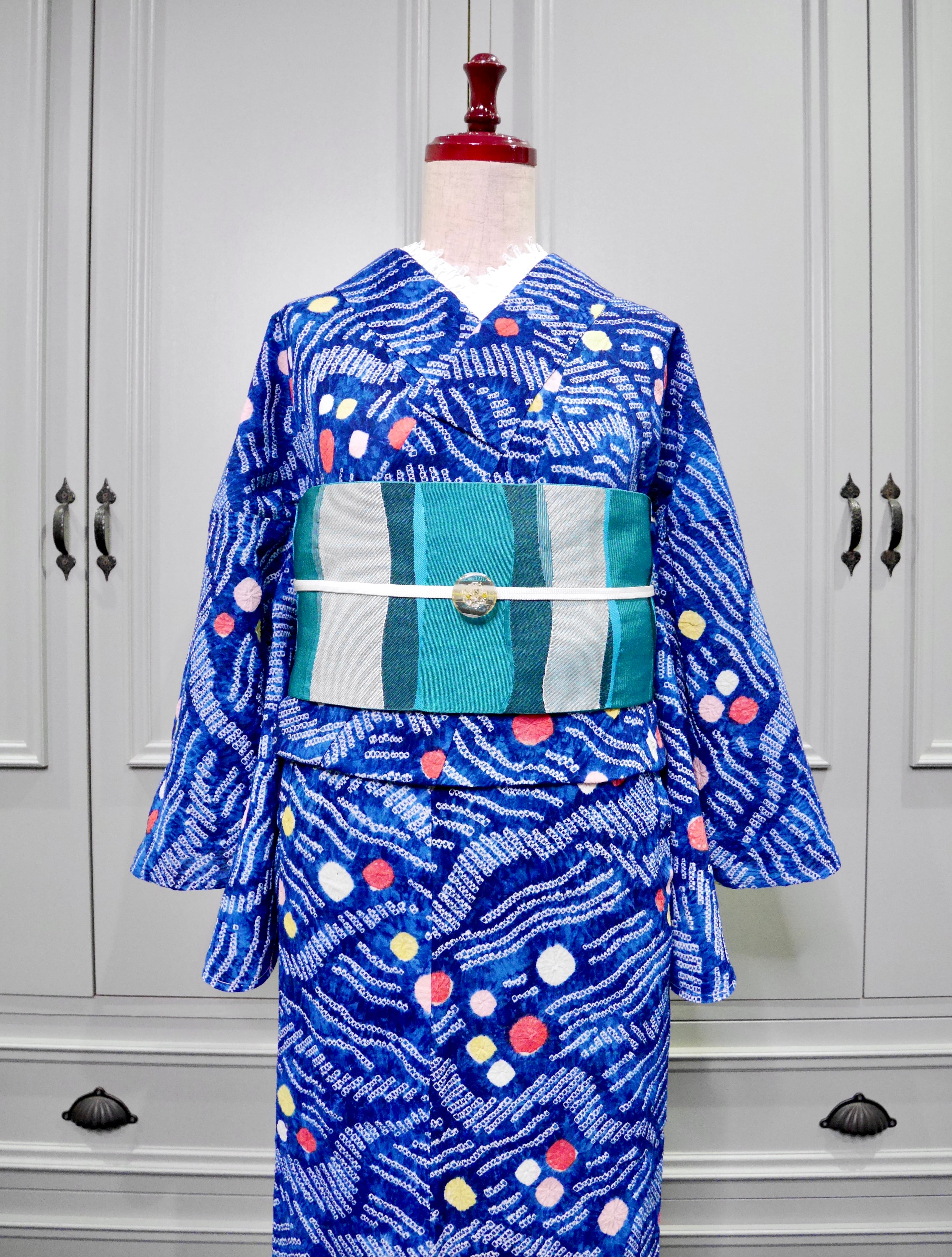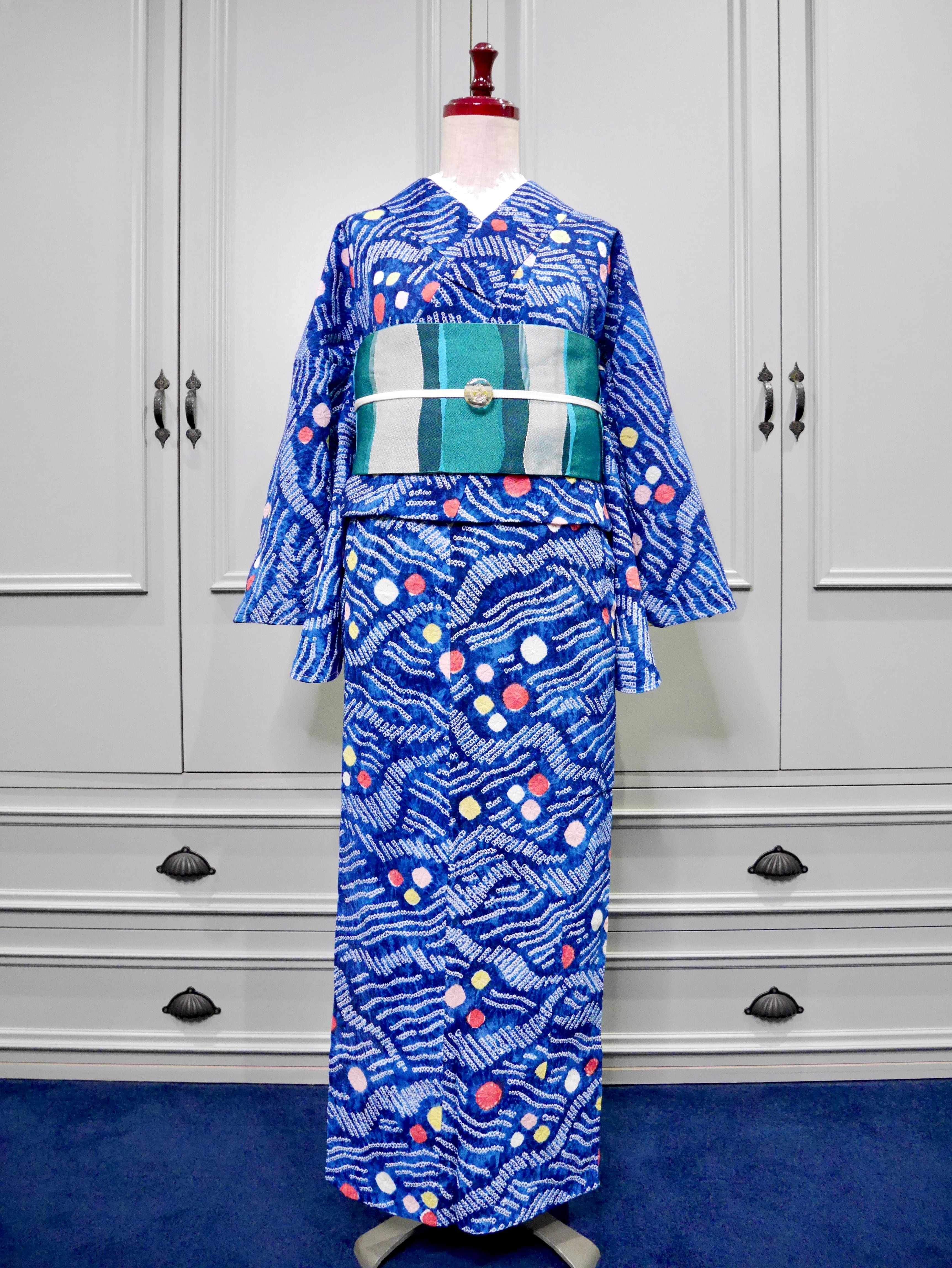 鮮やかなマリンブルーに蛍のネオンのようなドット柄が綺麗な有松鳴海絞り浴衣です!