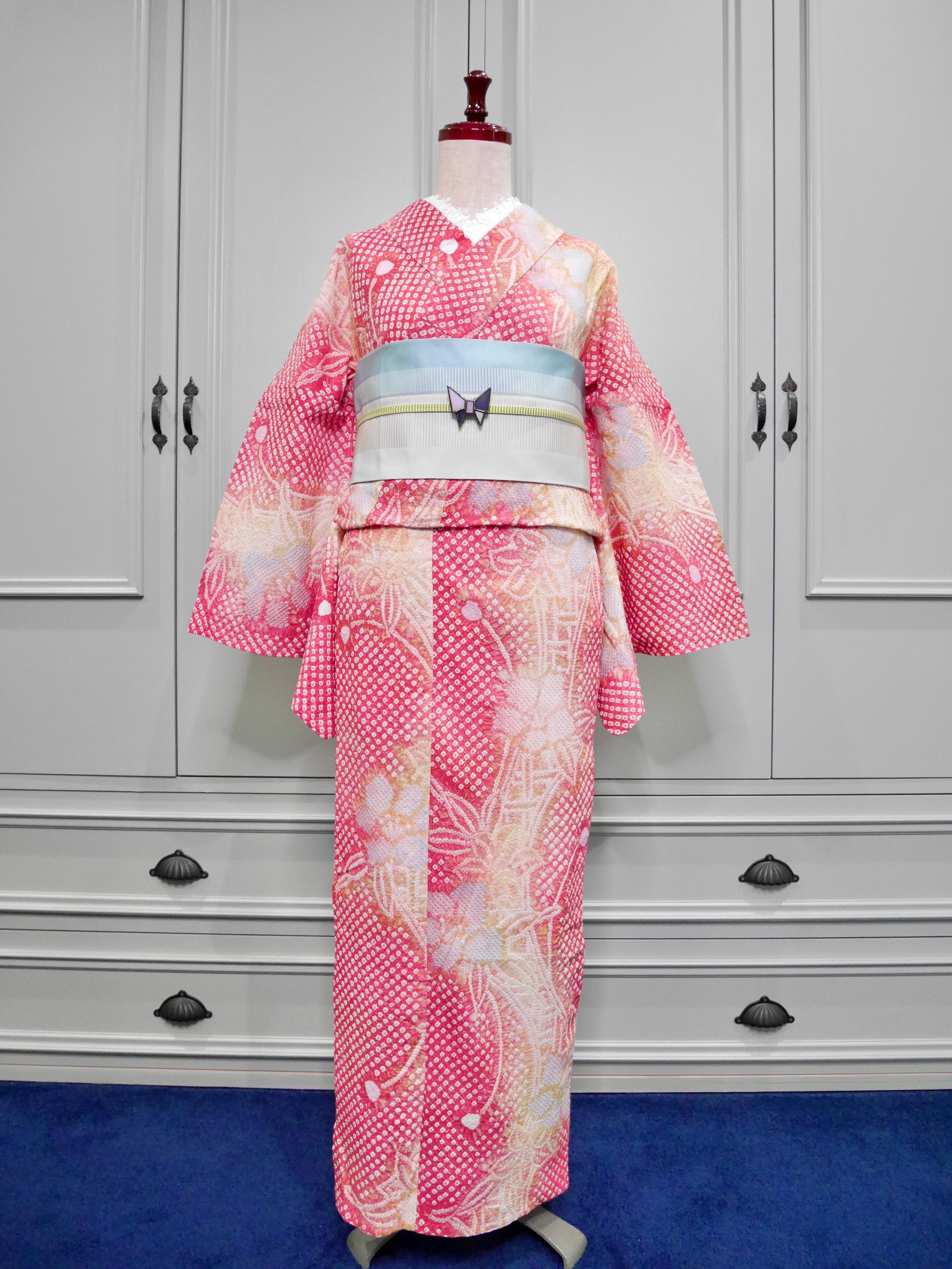 コーラルピンクにやさしい色合いの百合柄が綺麗な有松鳴海絞り浴衣です!