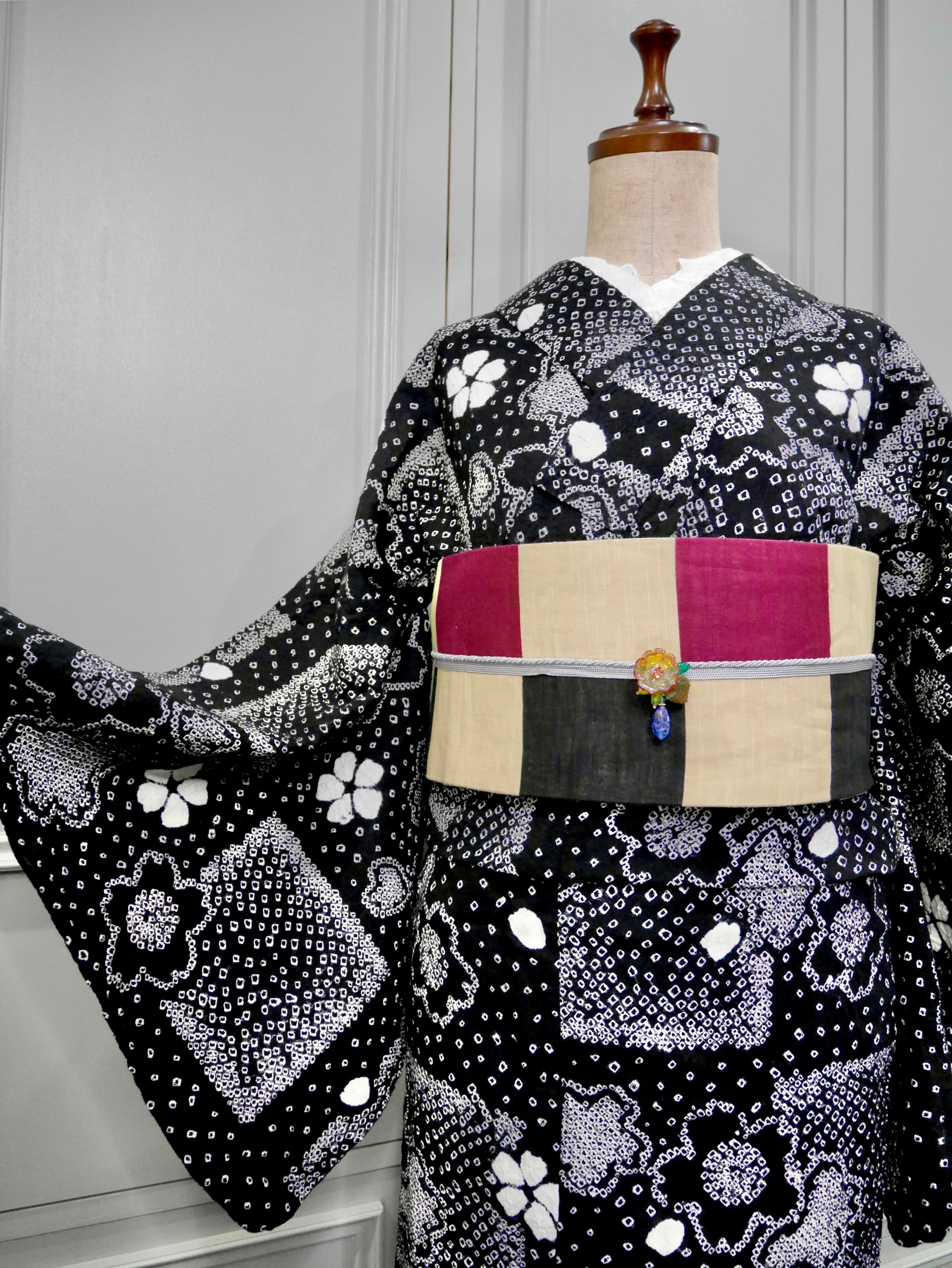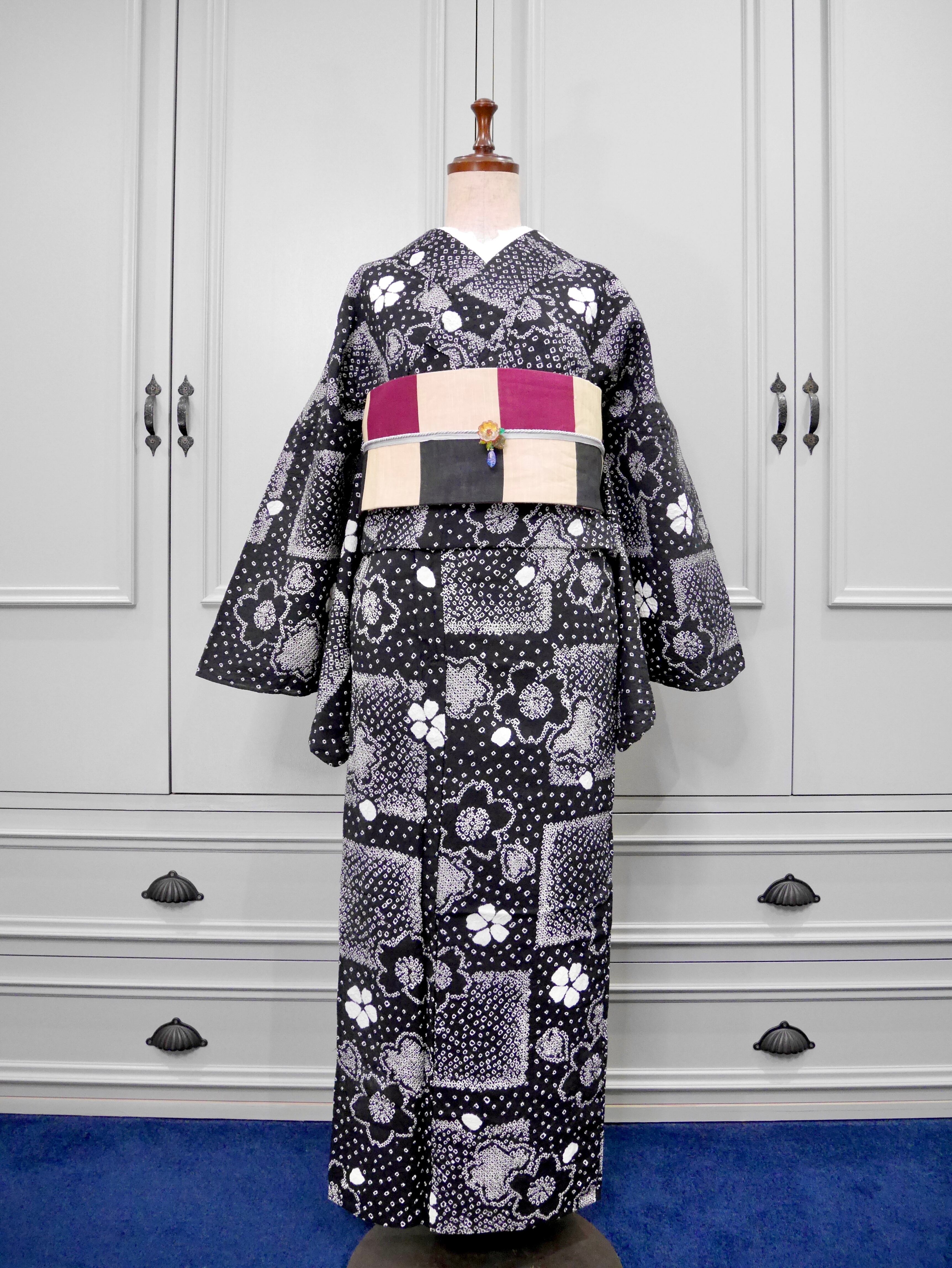 黒地に桜と市松模様で、粋な上品さが美しい有松鳴海絞り浴衣です!