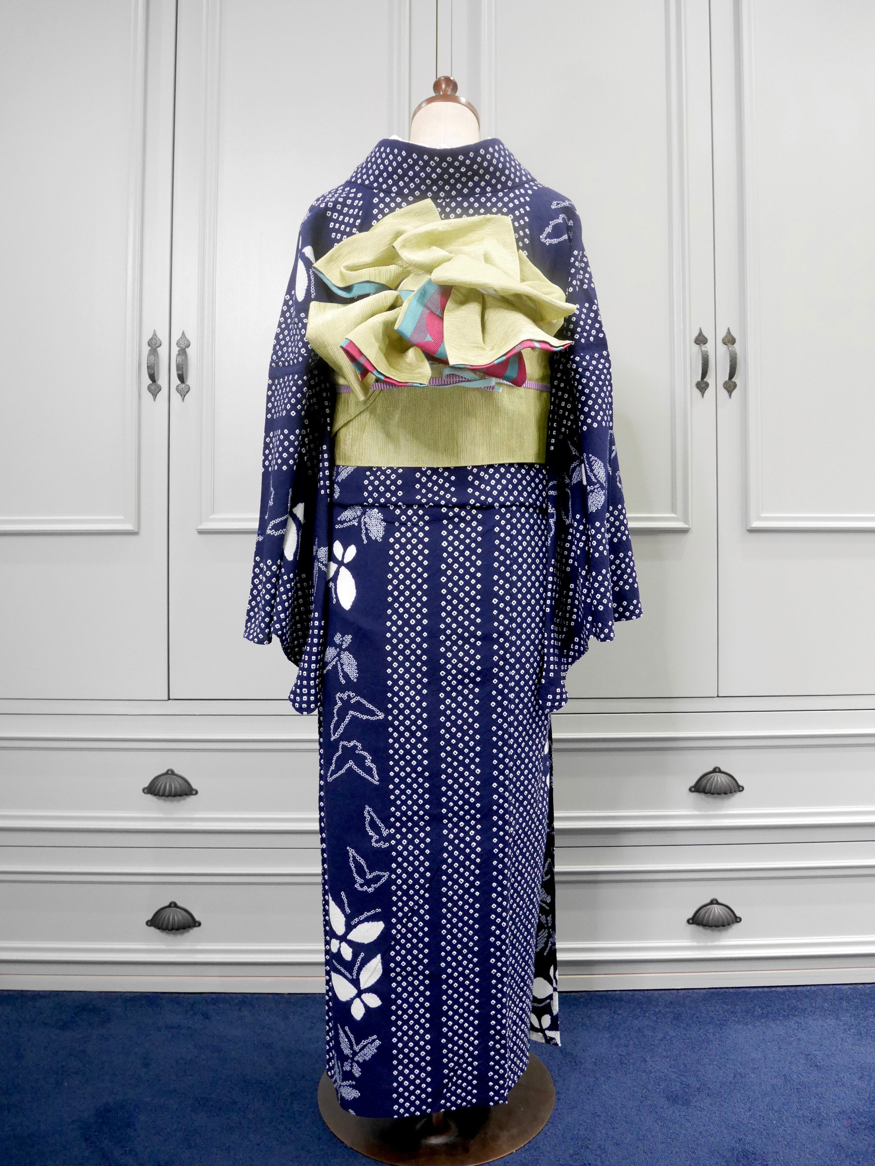 ロング*有松鳴海絞り浴衣*藍色×白色 レトロ蝶々ライン 0341