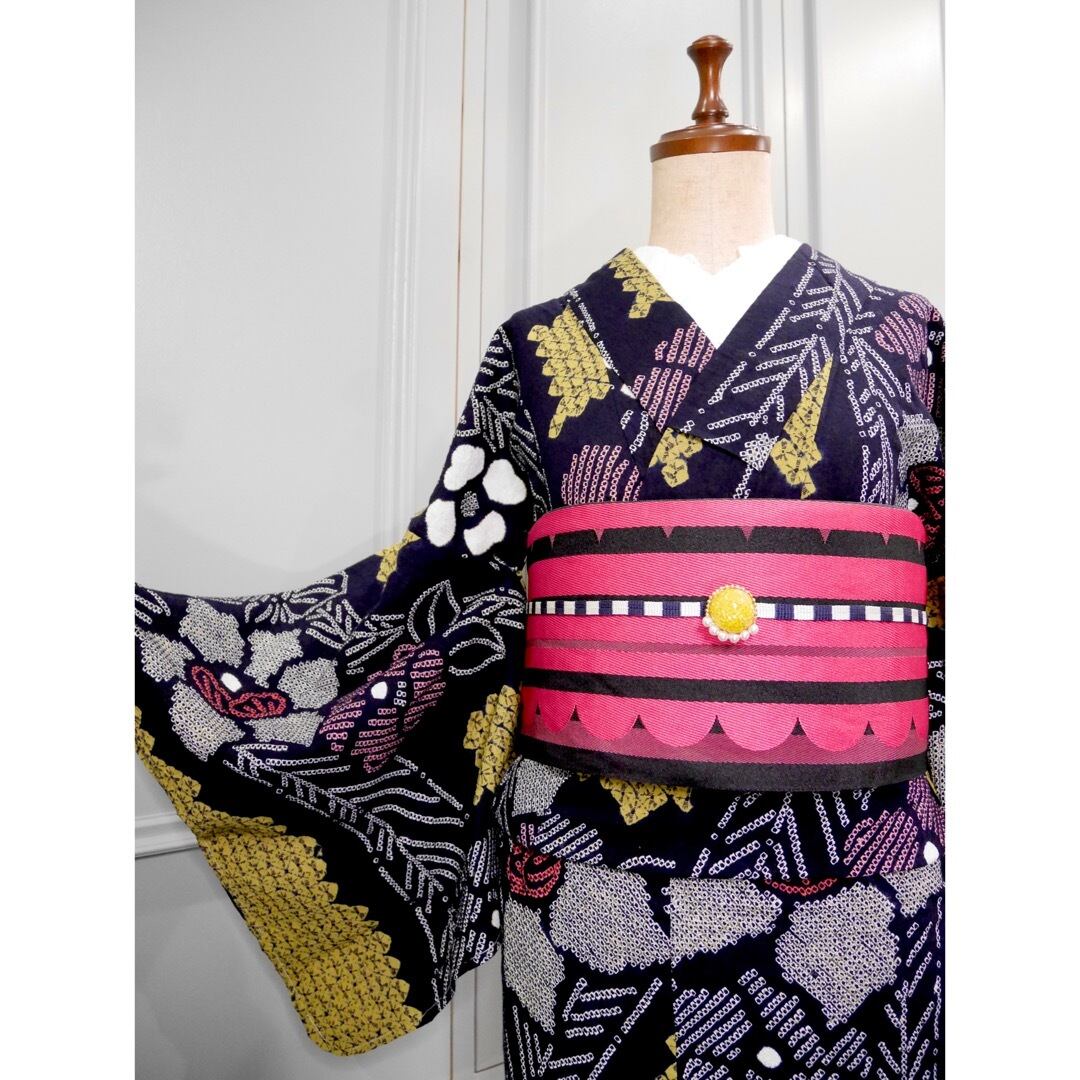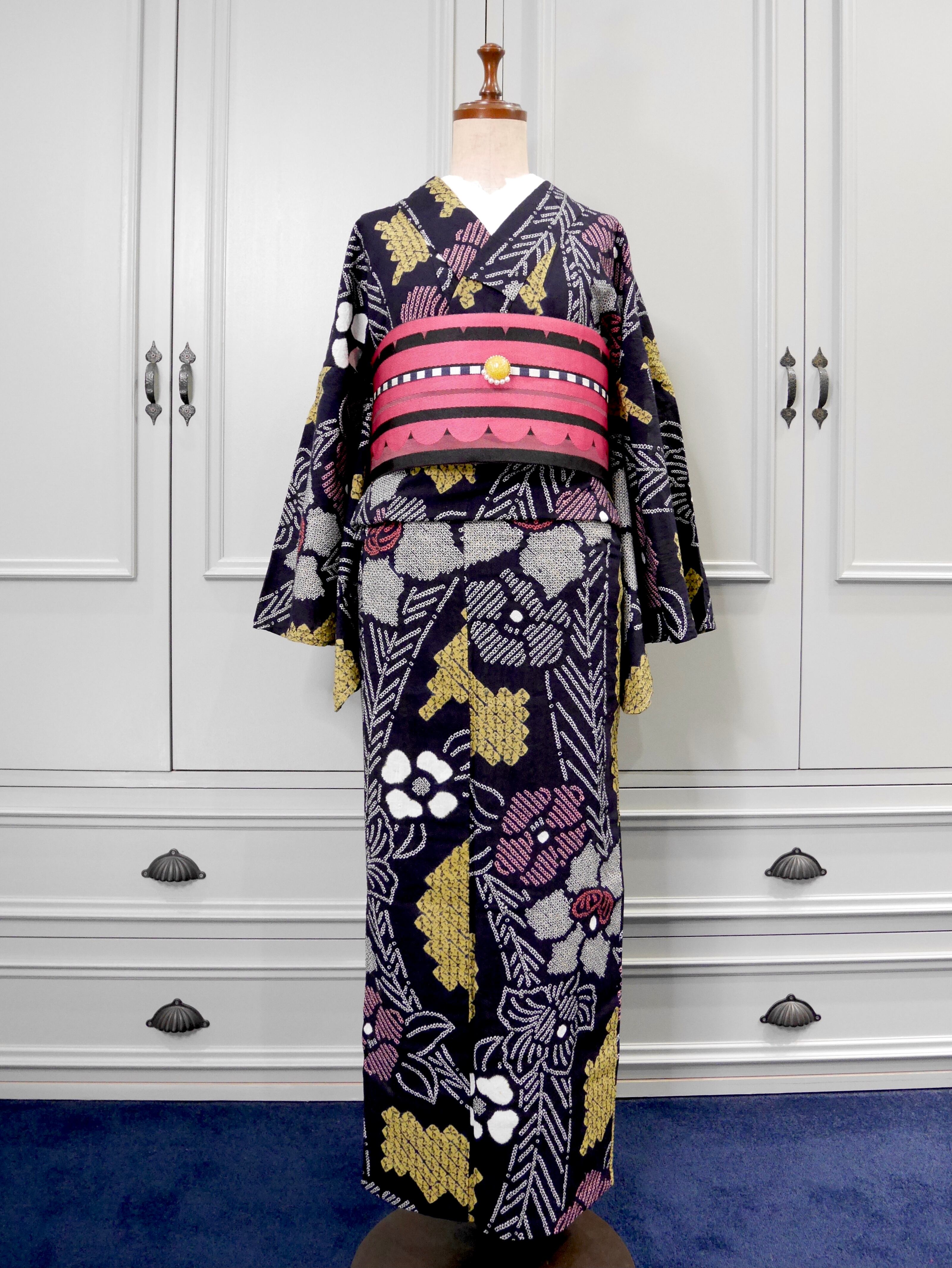 黒の地色に和モダンなお花たちが華やかに描かれている有松鳴海絞り浴衣です!