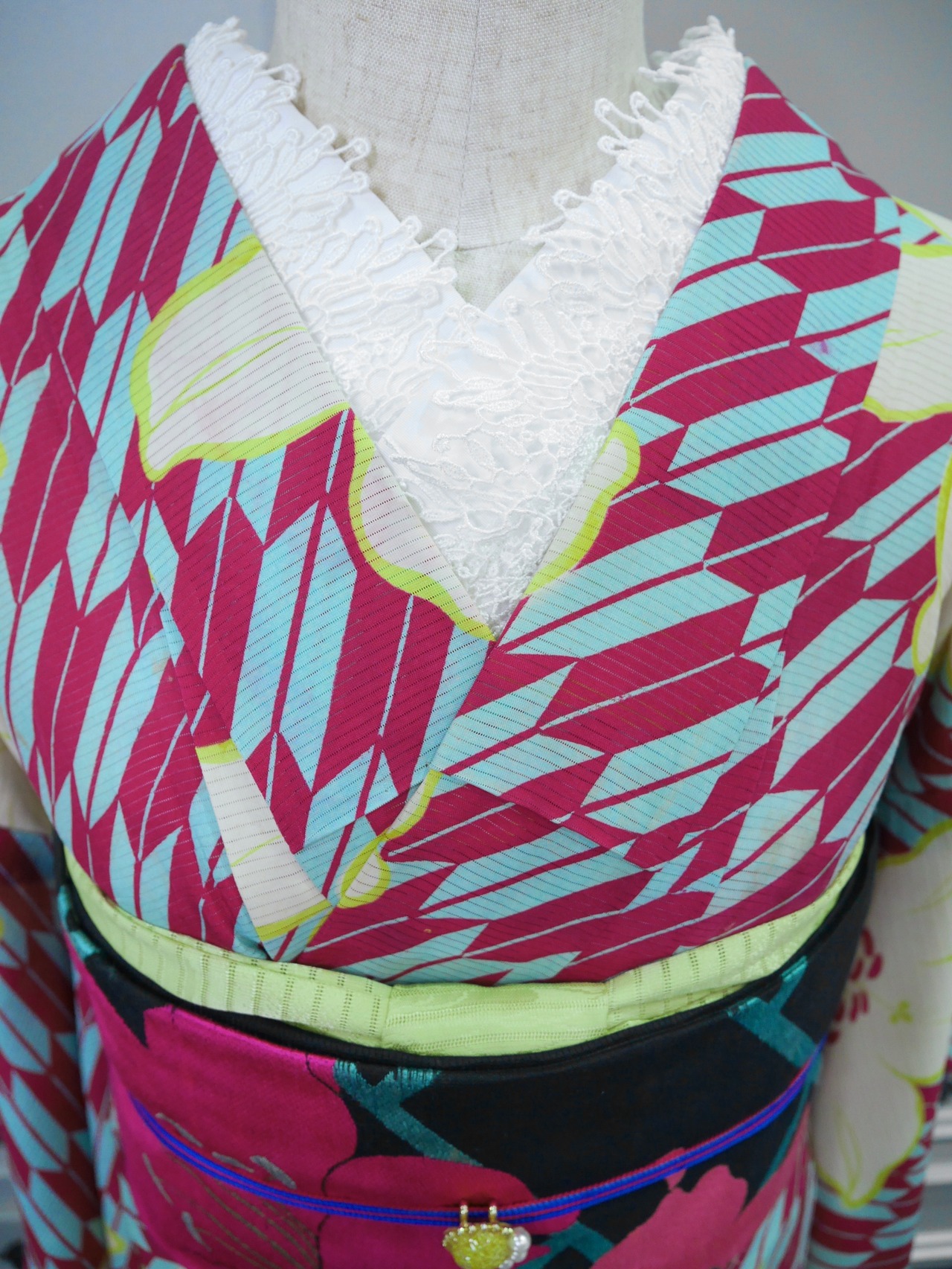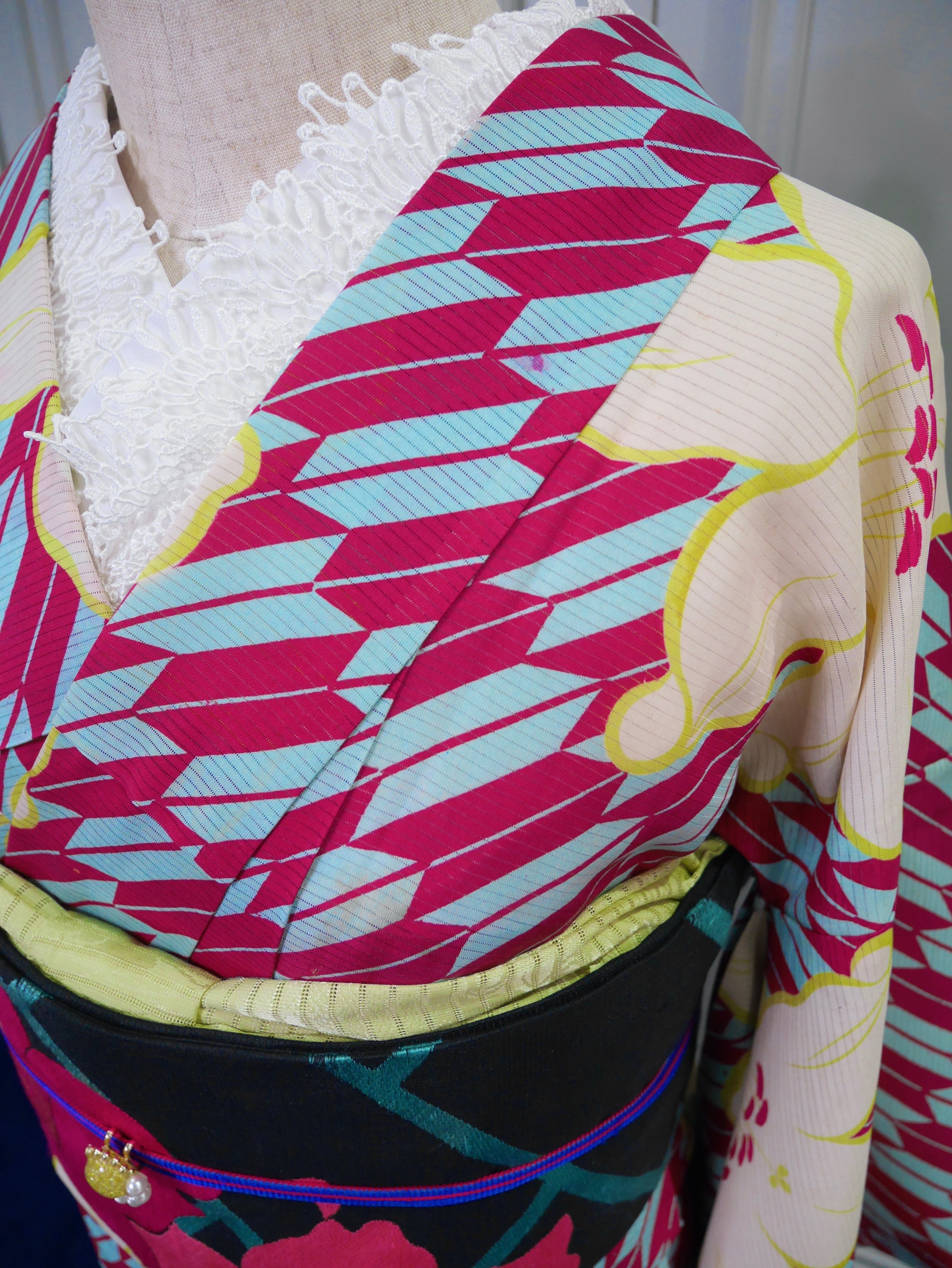 身丈長め*夏キモノ*絽*浅葱色×赤 矢羽根柄に百合 アンティーク小紋キモノ 0350