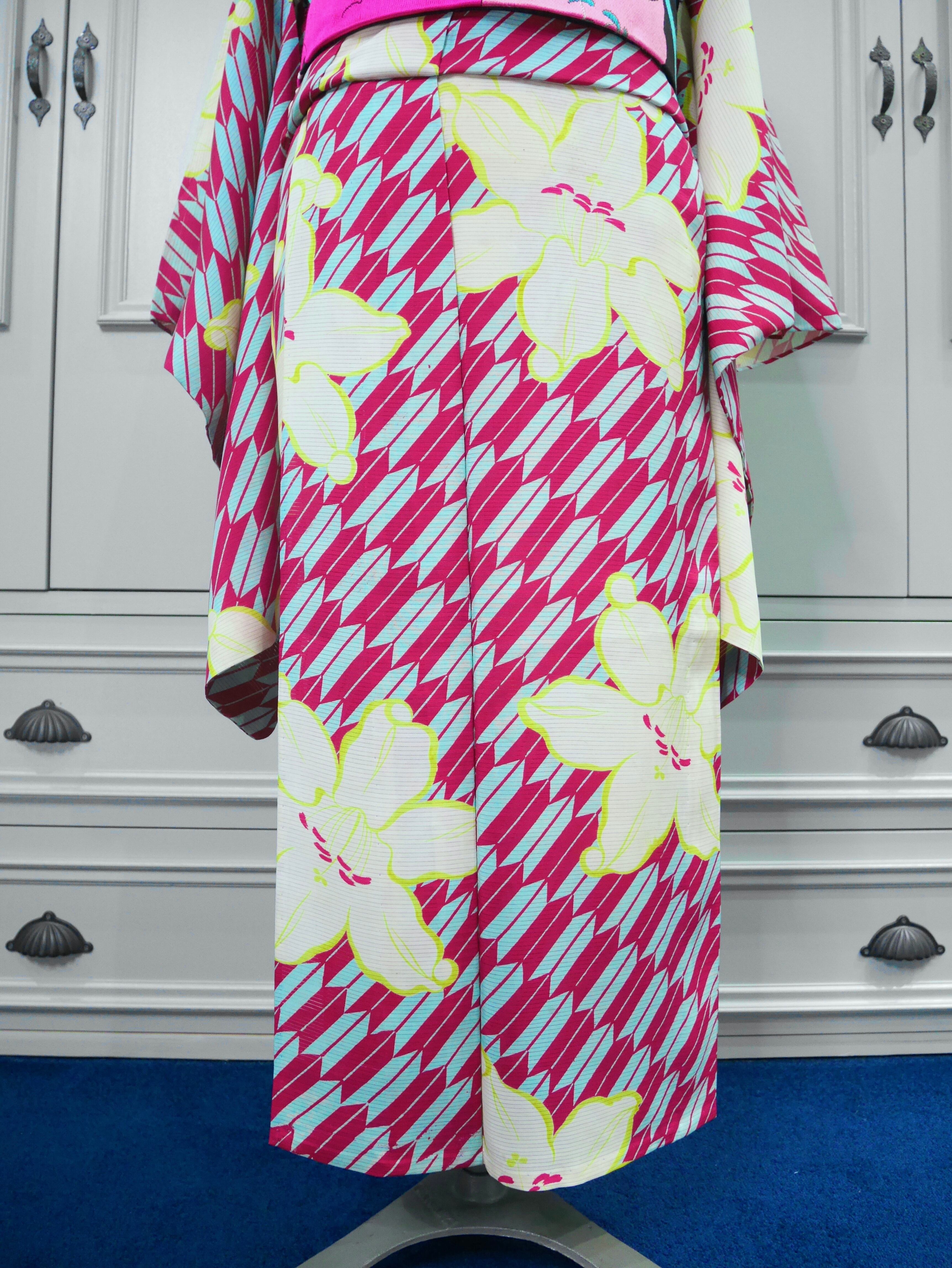 ブルーとレッドの矢羽根柄に、大きく描かれた百合がパッと目を引くアンティーク夏キモノです♪