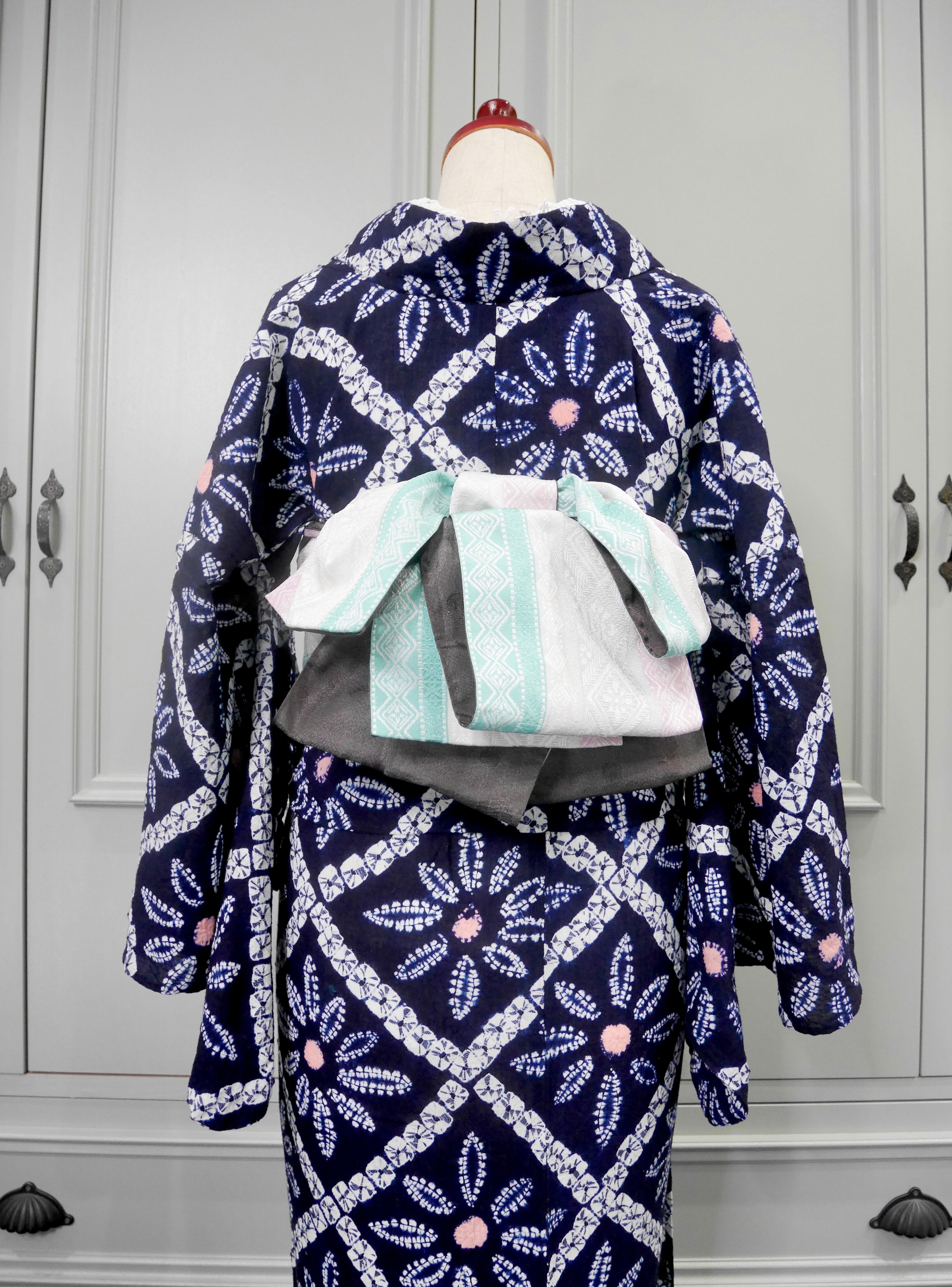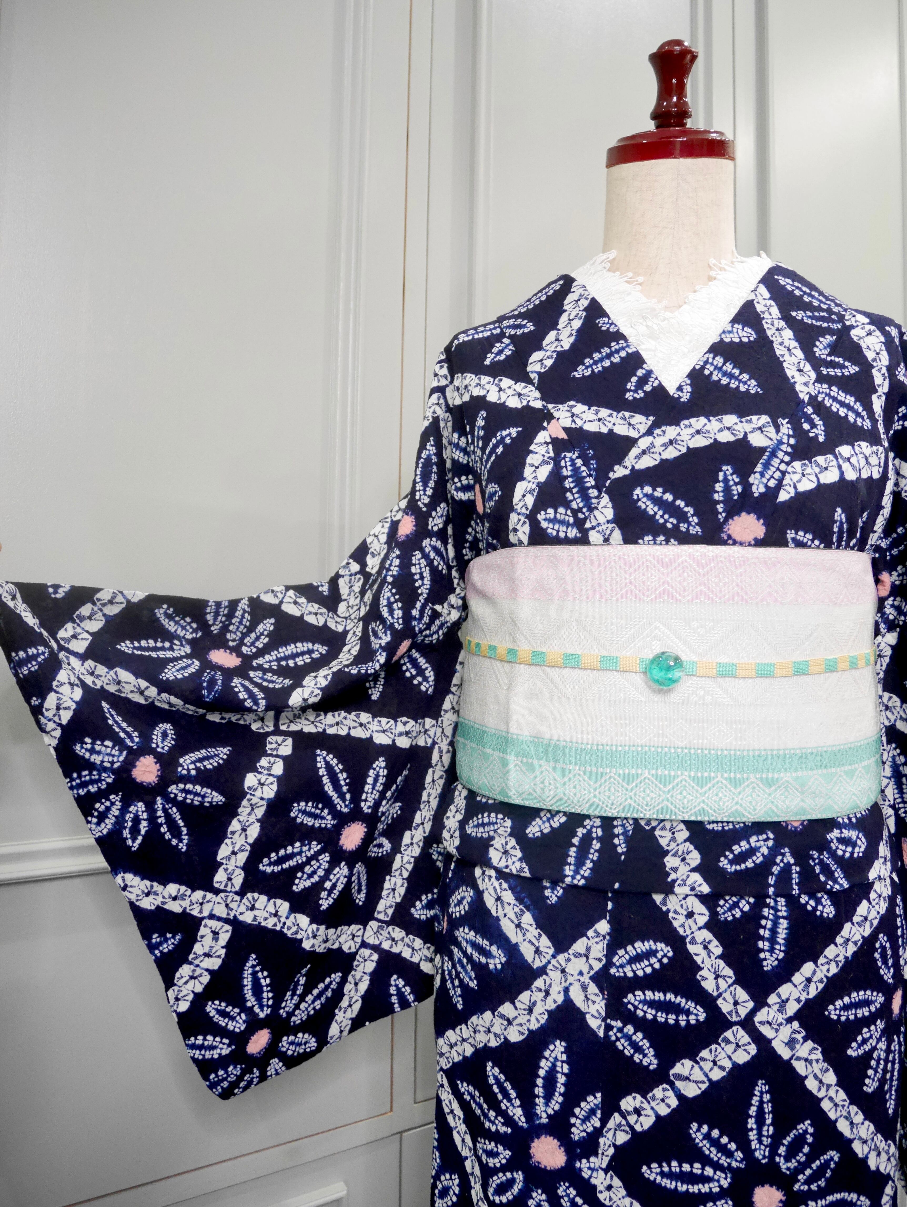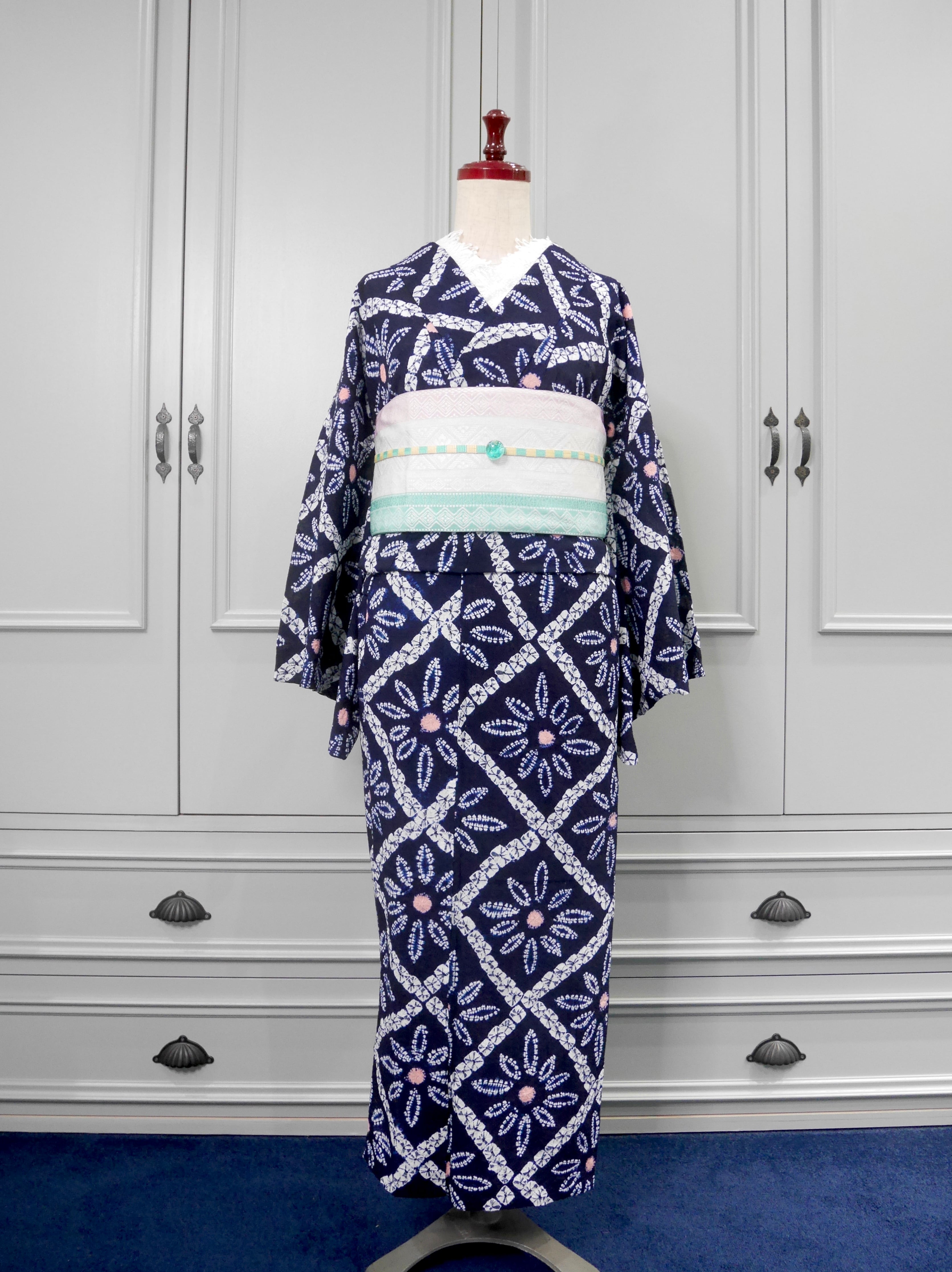 深い藍色と白がベースのダイヤの中に花が咲いた有松鳴海絞り浴衣です!