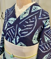昔ながらの深い藍色に、ミントブルーの葉模様が素敵な有松鳴海絞り浴衣です!
