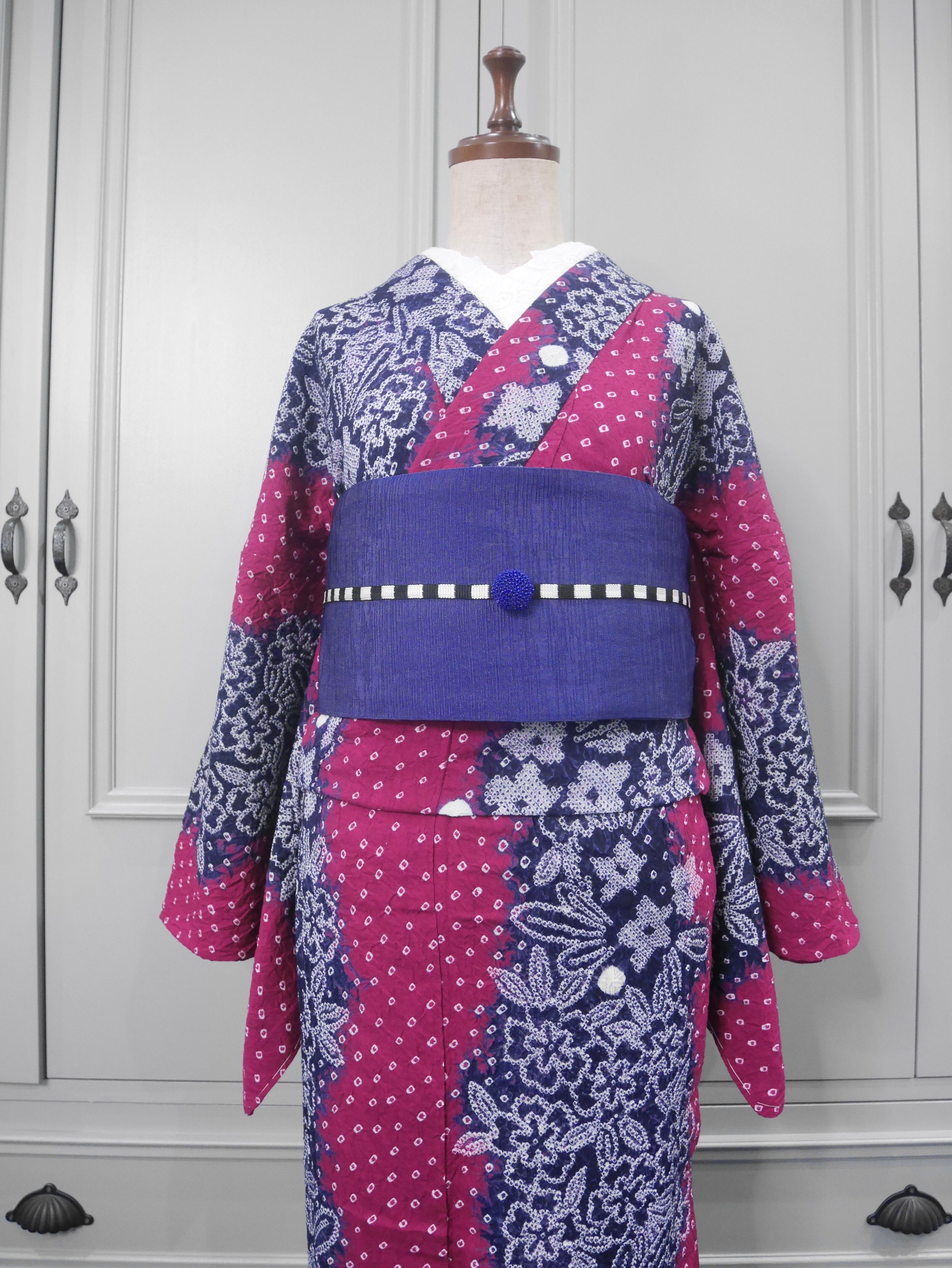 目にも鮮やかなカシスカラーに、ブルーベリーカラーのお花たちがデザインされた有松鳴海絞り浴衣です!