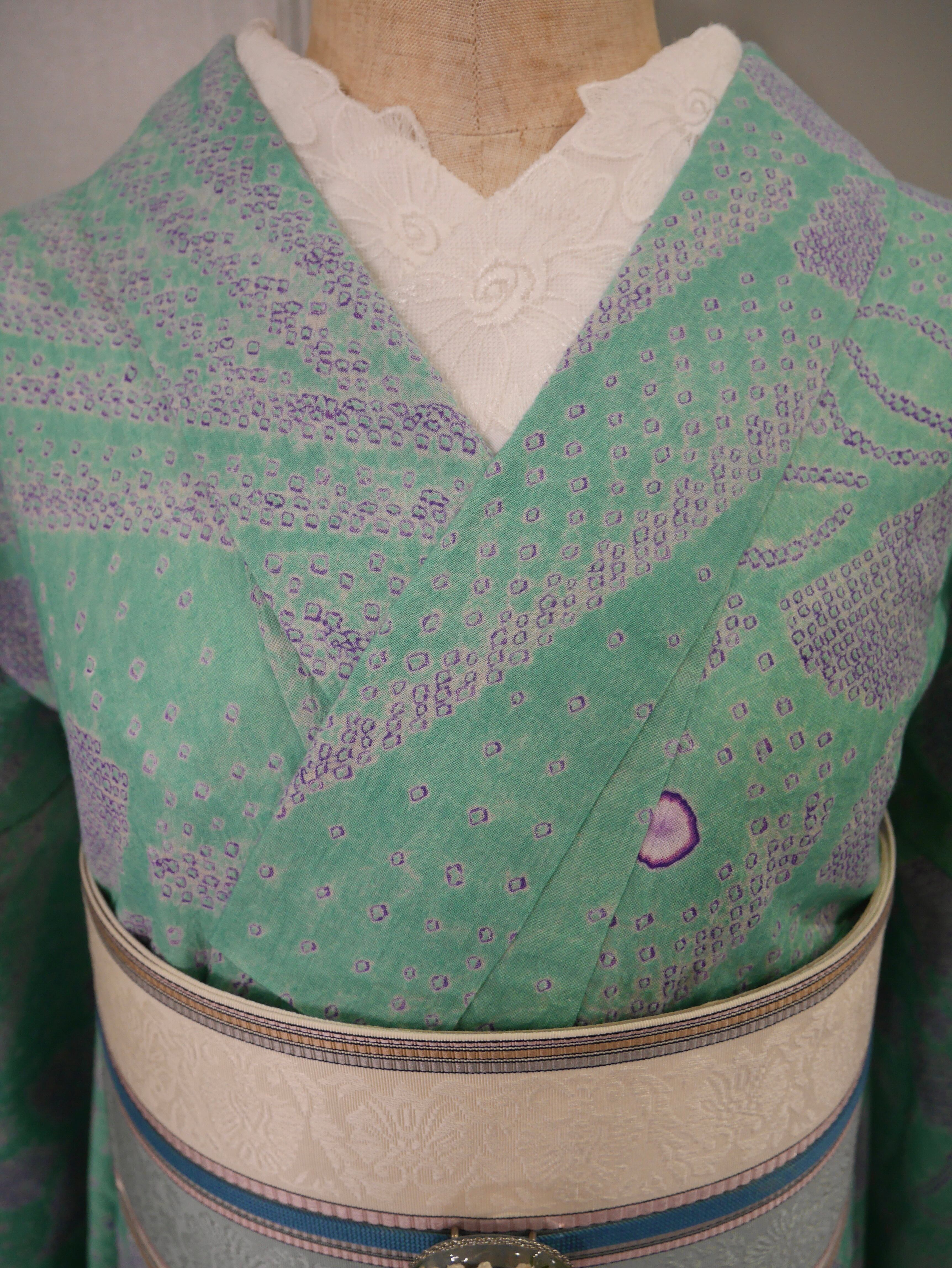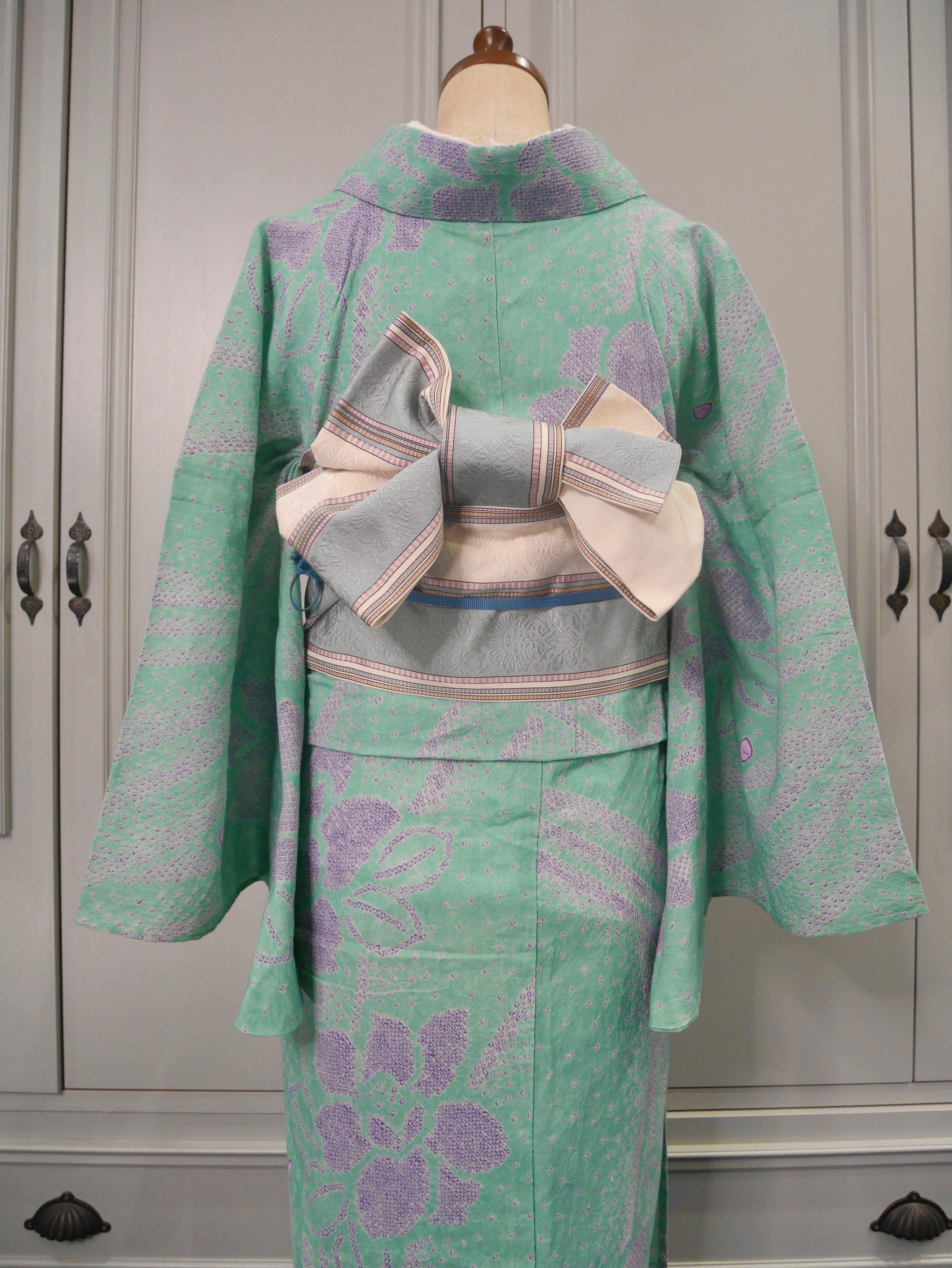 ロング*有松鳴海絞り浴衣*フレッシュクールミント×パープルフラワー 0382