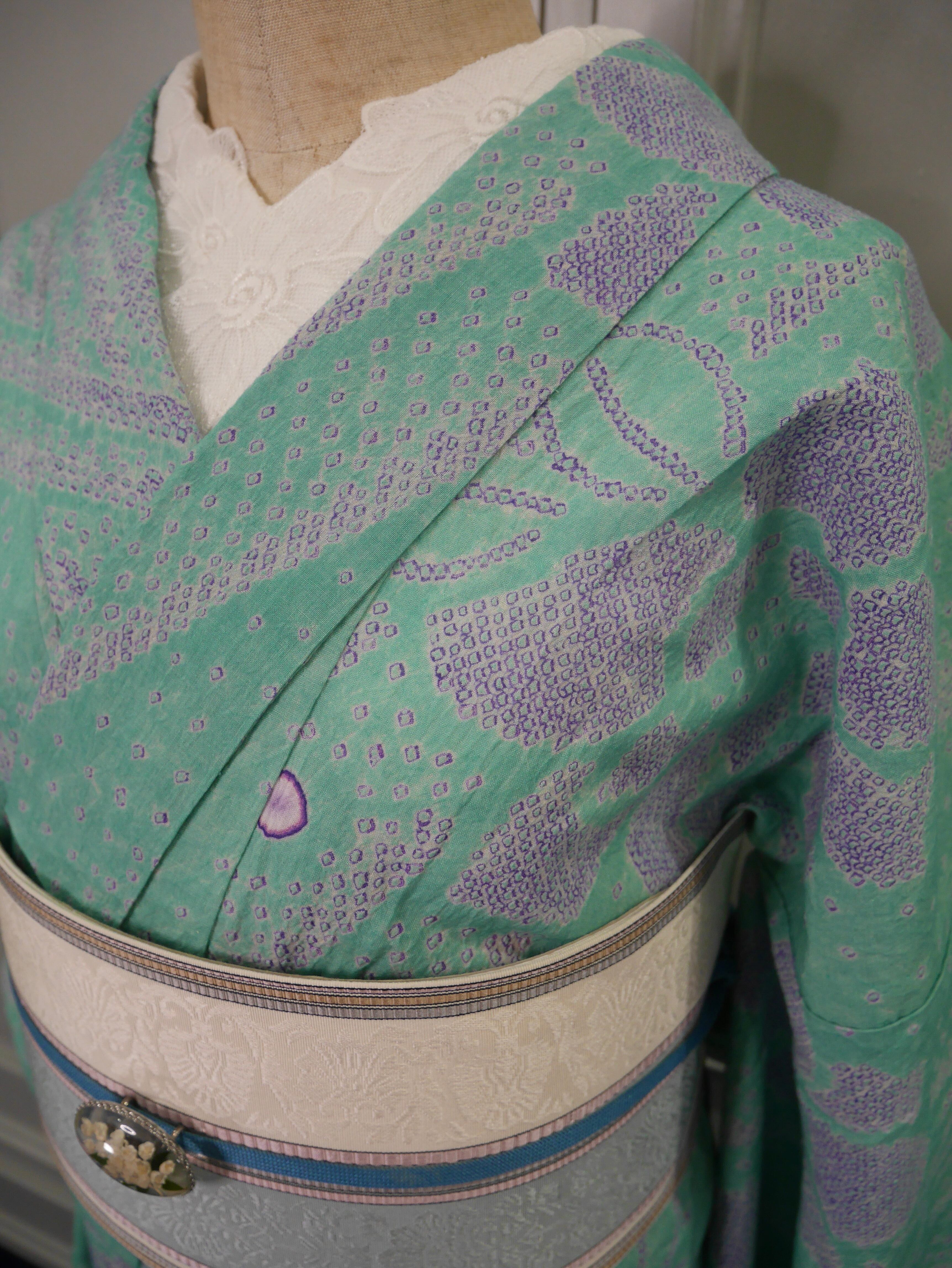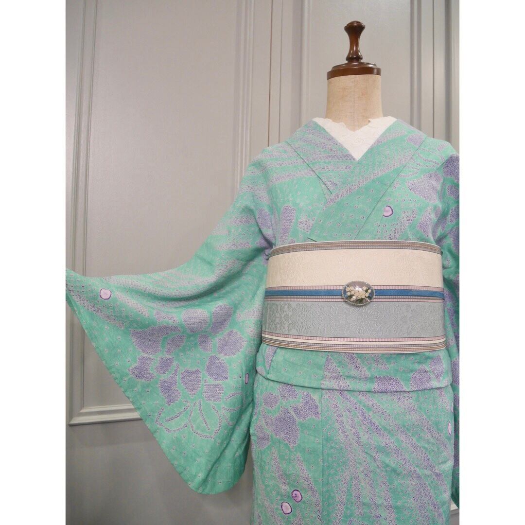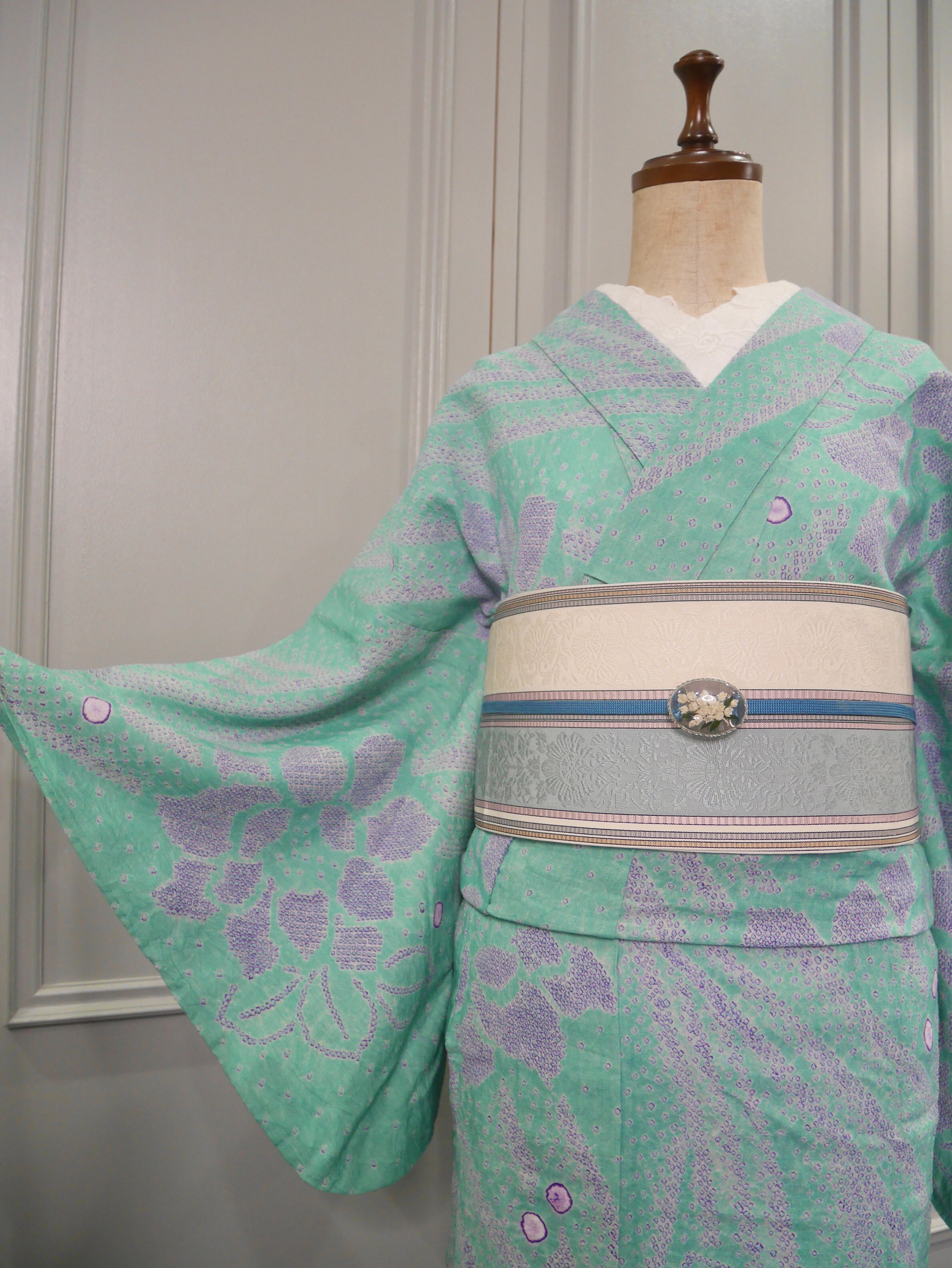 鮮やかなミントグリーンに、青紫系のお花がデザインされた有松鳴海絞り浴衣です!