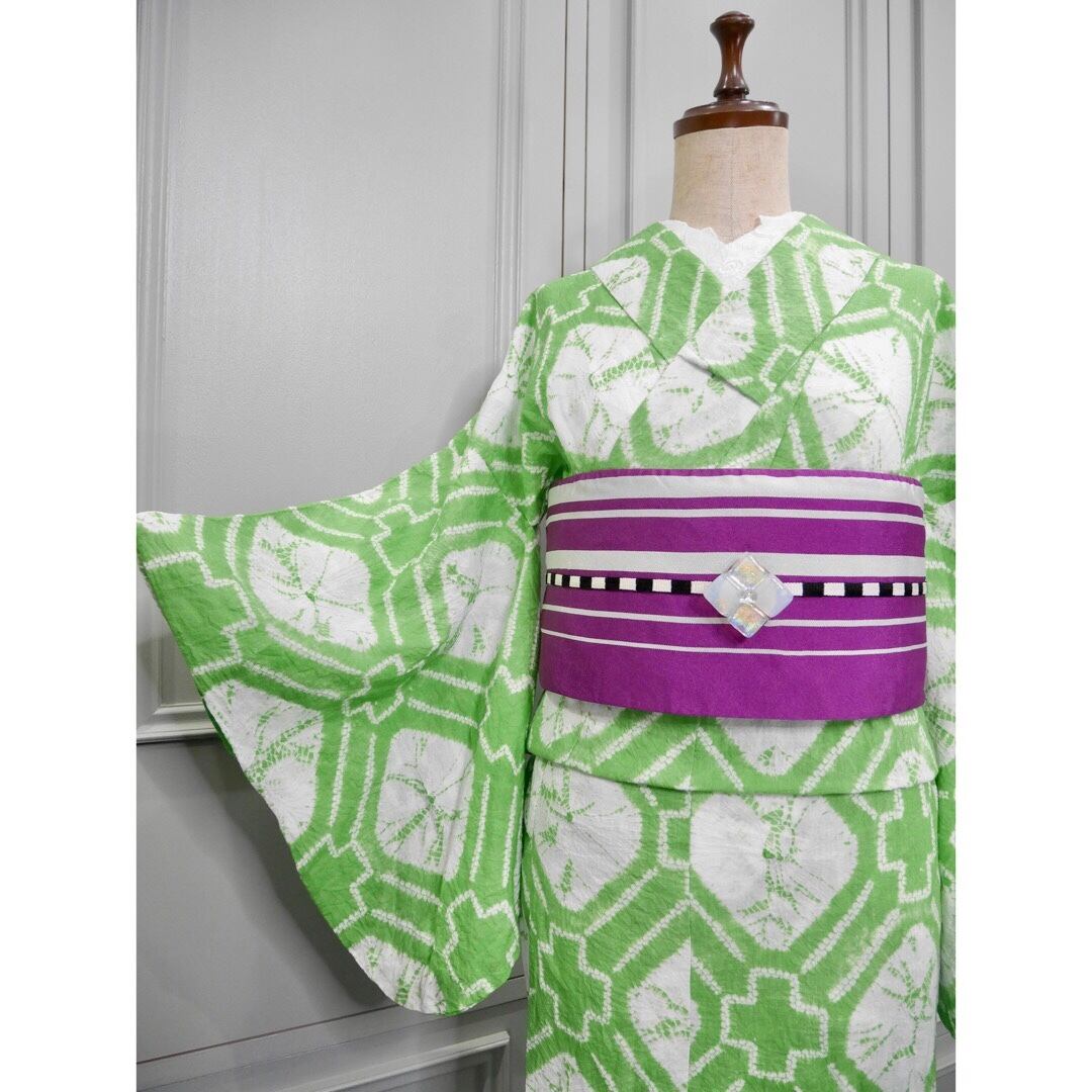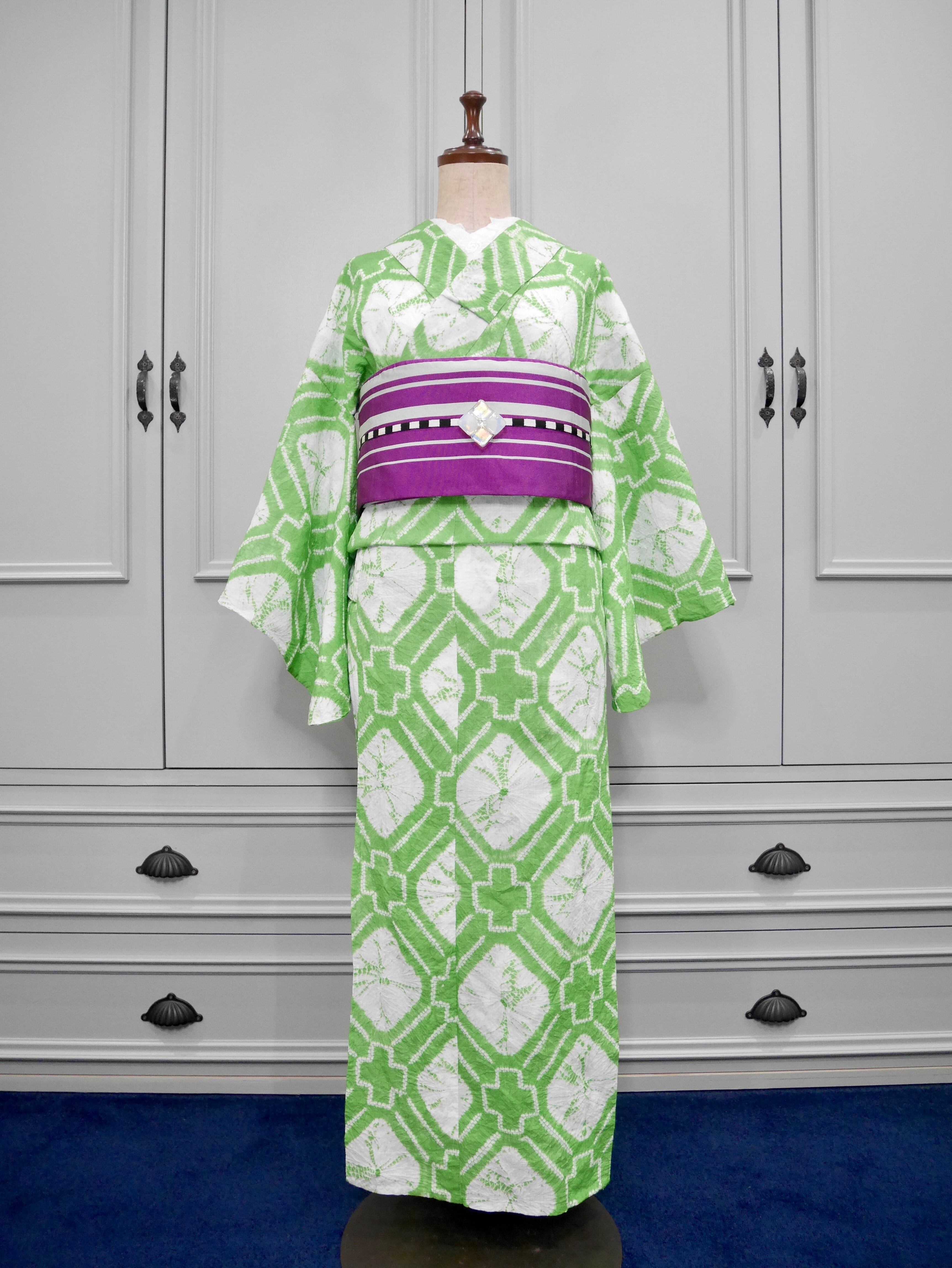 爽やかなシトラスグリーンにモロッカン調のダイヤ柄がお洒落な有松鳴海絞り浴衣です!