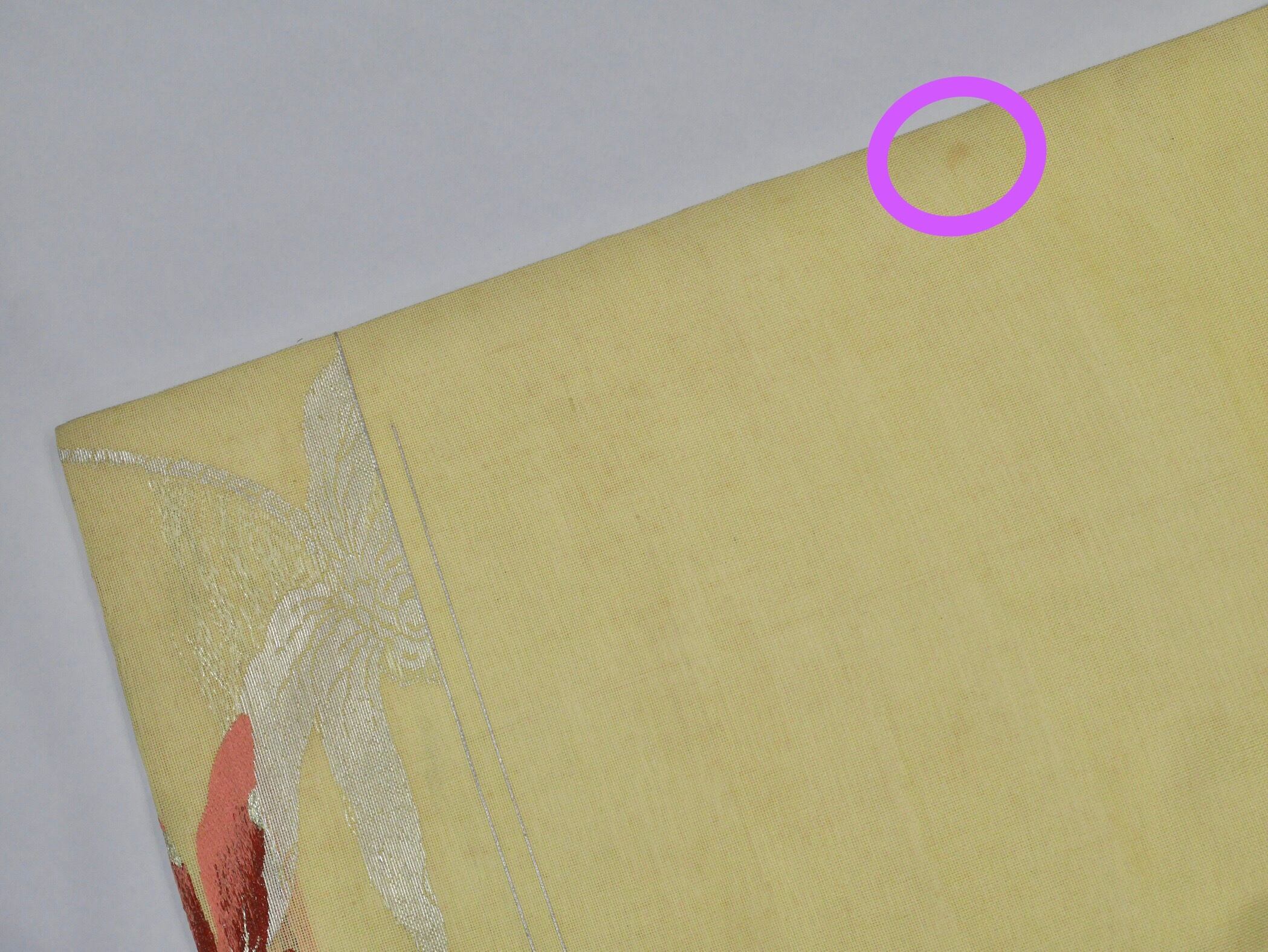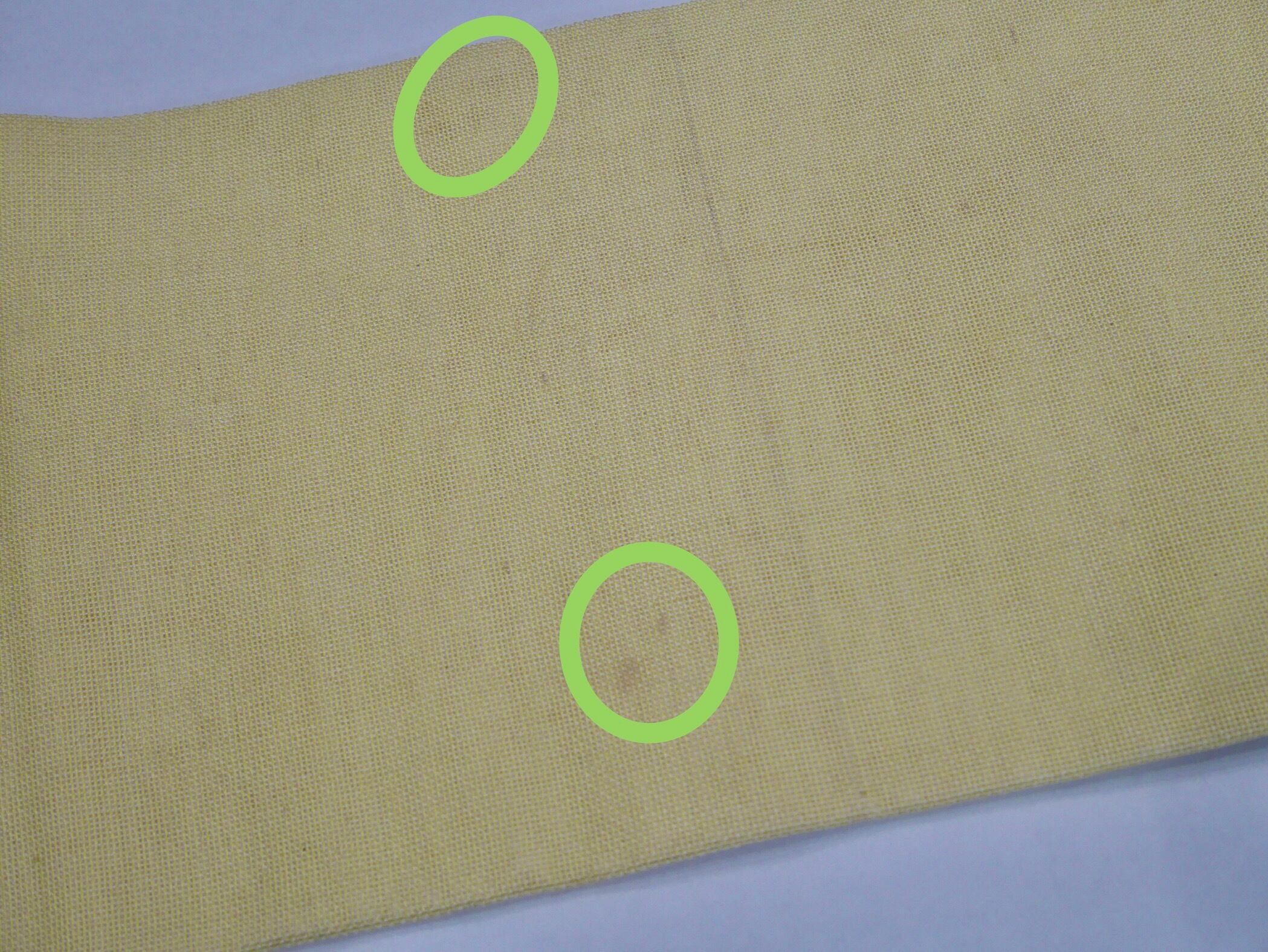 胴回り(締めると隠れるあたりになります)にうっすらですが、シミ有り。