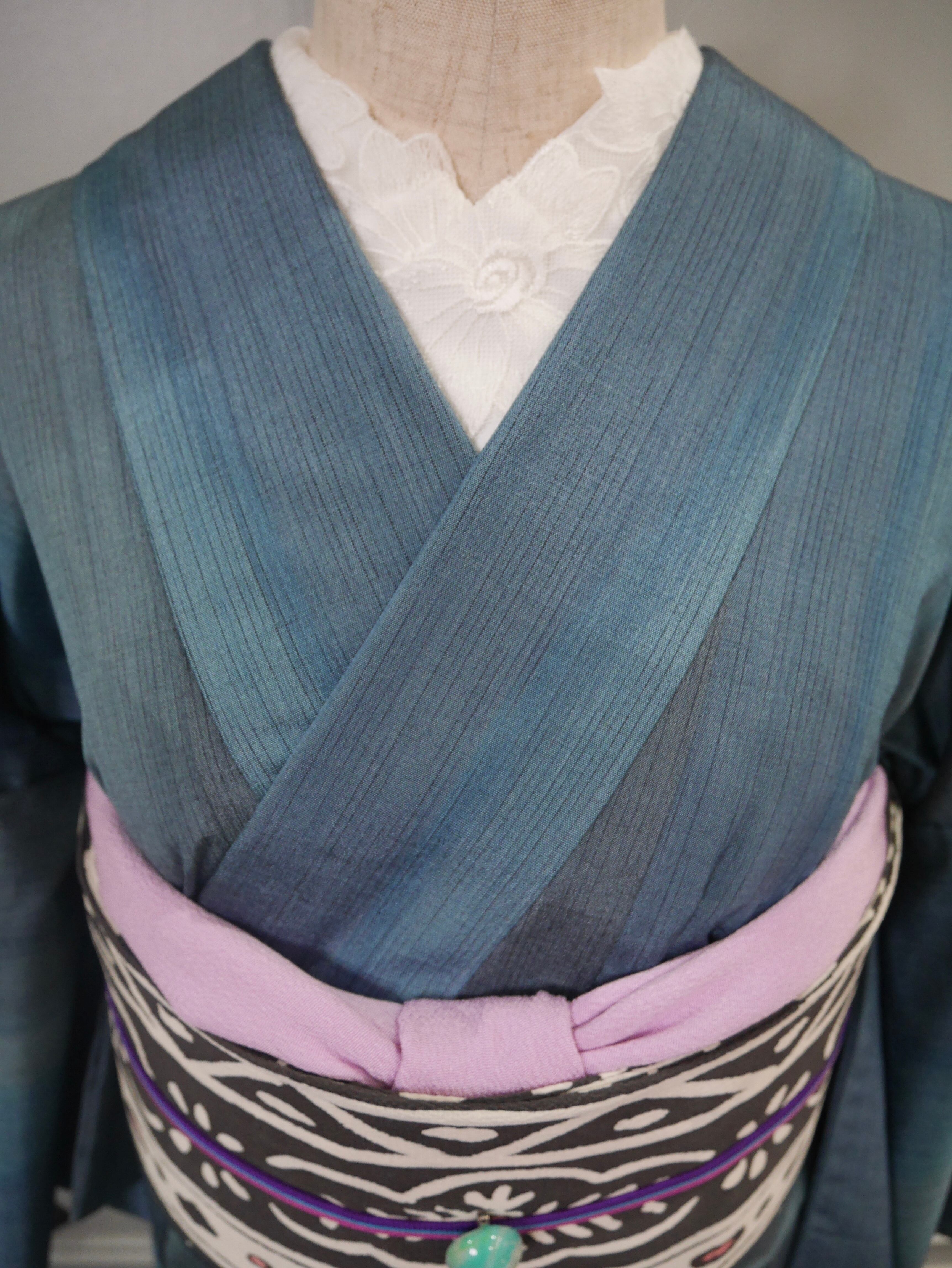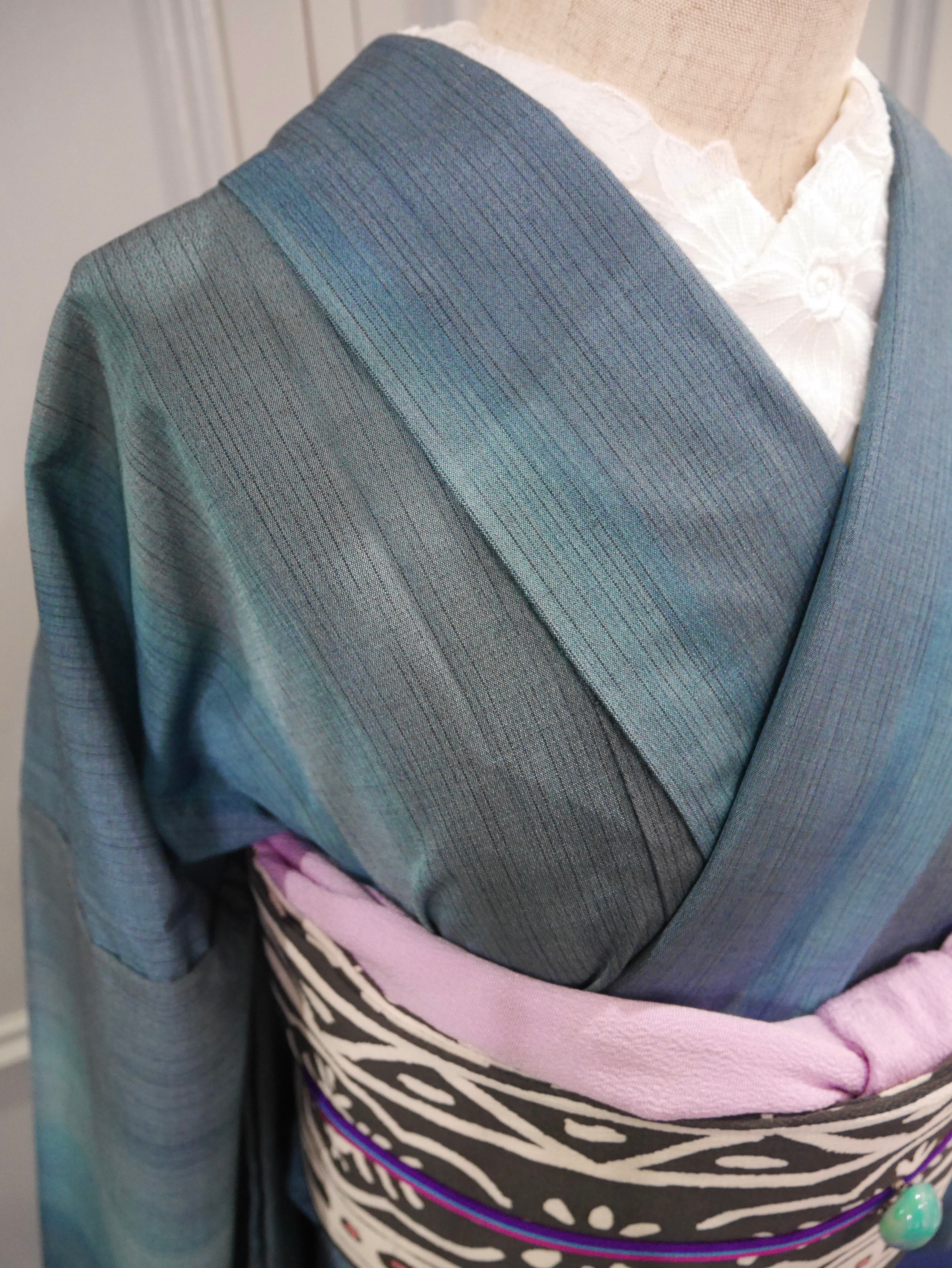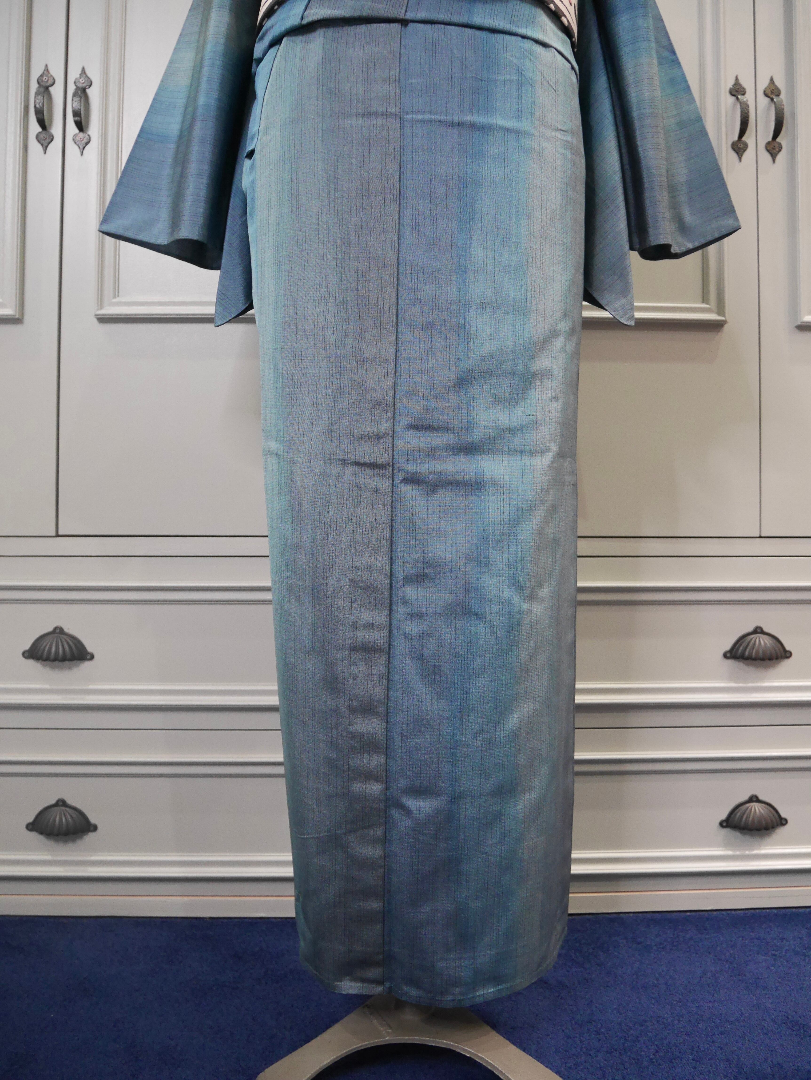 綺麗なブルーのグラデーションが美しい、お召の単衣着物です。