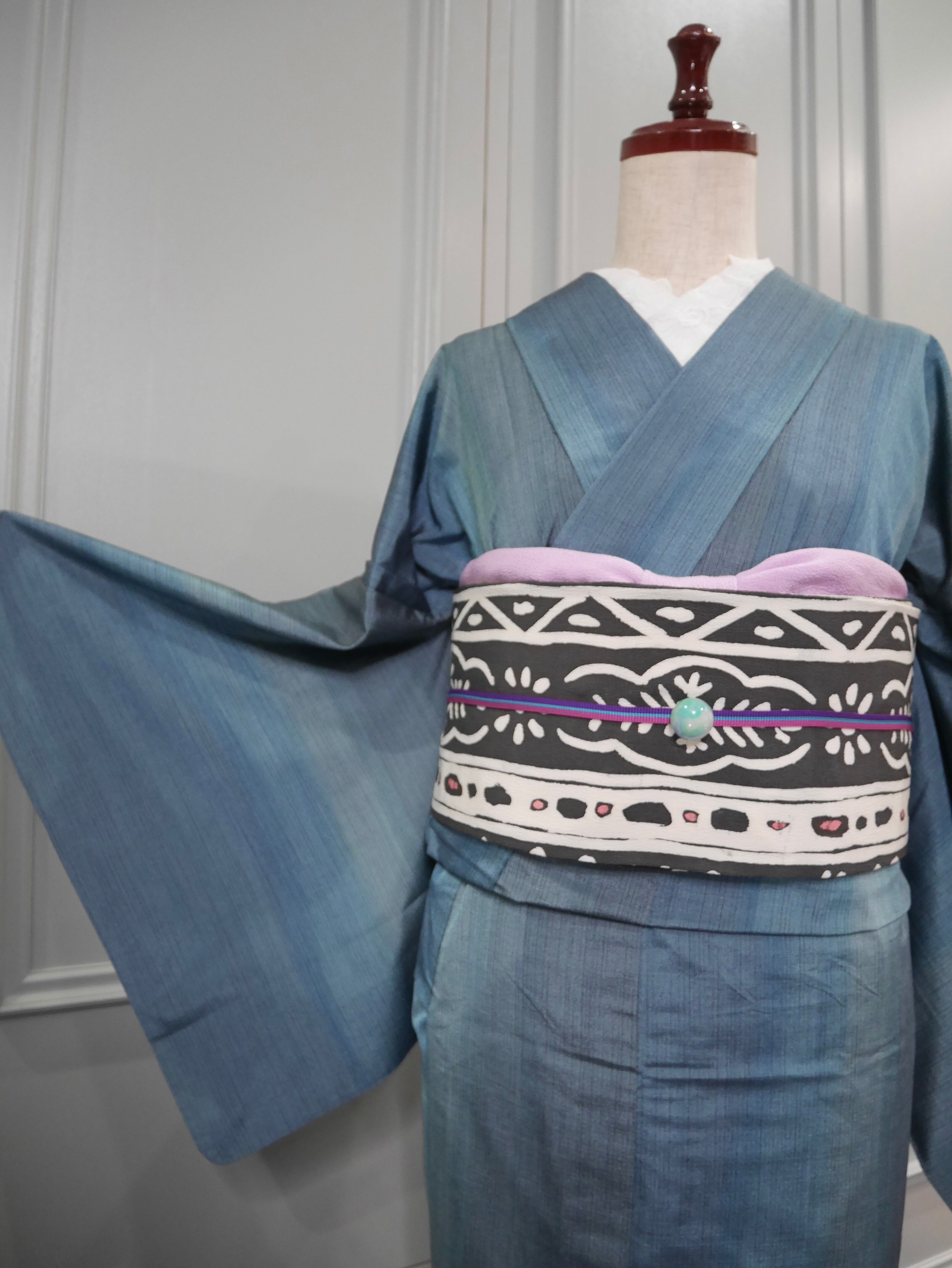 こちらはデザインがシンプルな為、シンプルなものから個性派さんまで、様々なデザインの帯を合わせていただきやすく、幅広く楽しめる一着かと思います^^