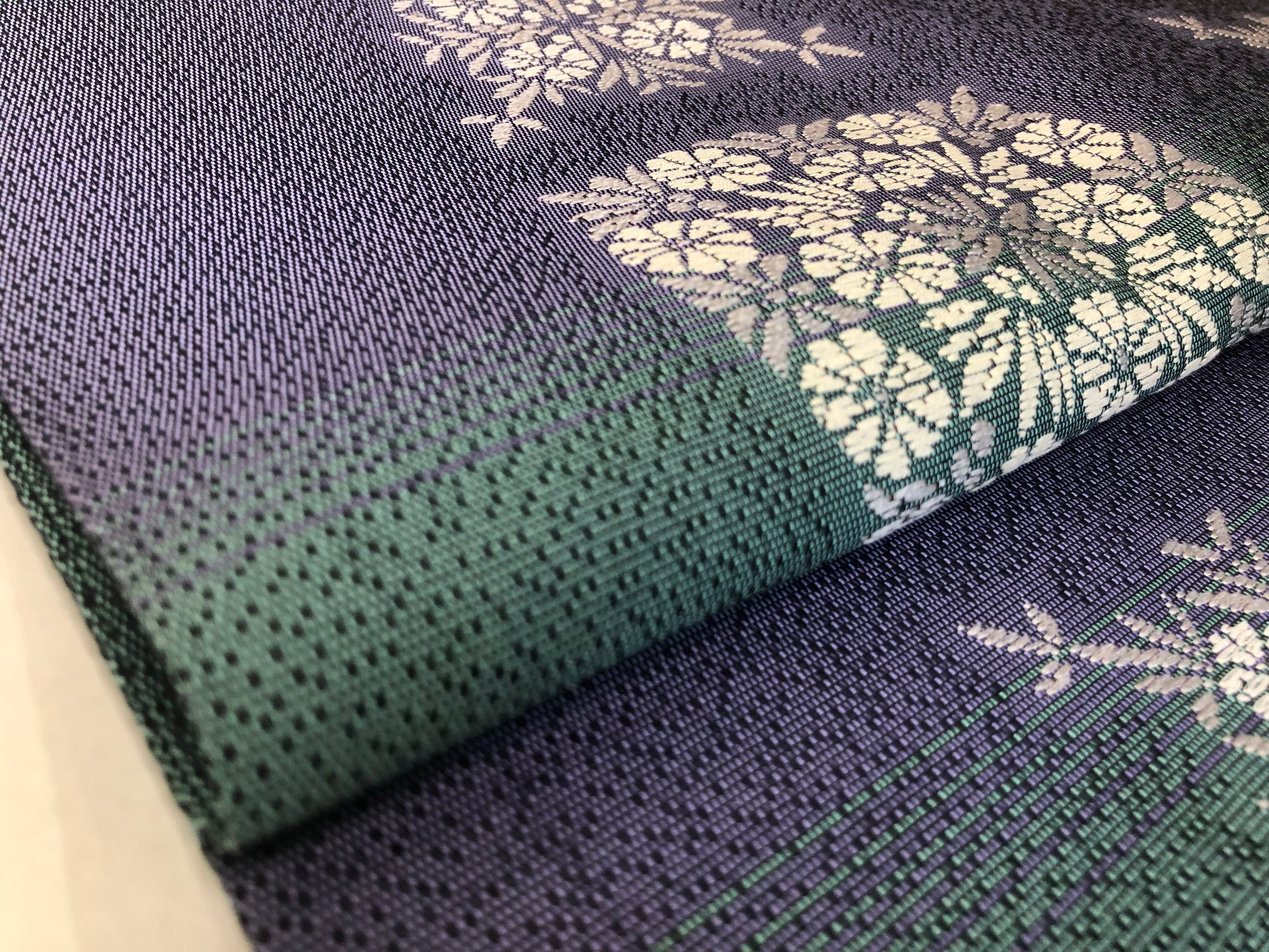寒色系のカラーに、細かくデザインされた花模様が素敵な名古屋帯です。