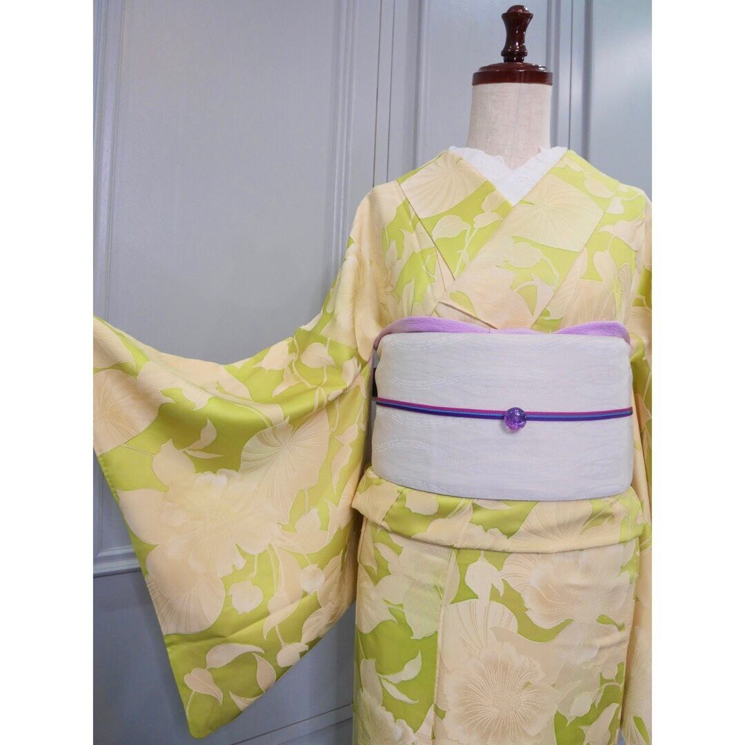 イエローグリーンの地色に、大輪の花たちが描かれた、小紋着物着物です♪