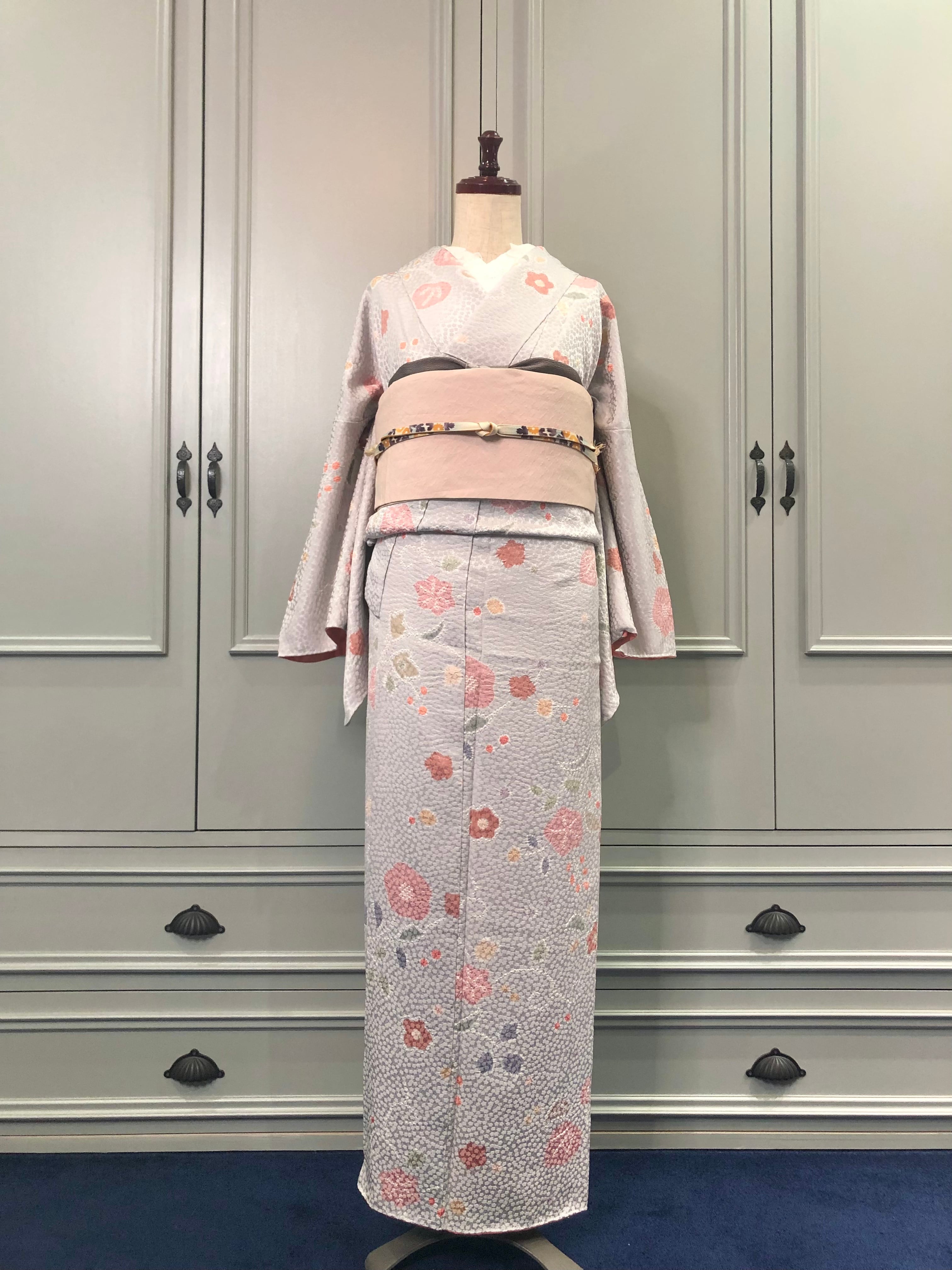 雪のような淡いグレーの地色に、パステルカラーのお花たちがデザインされた小紋着物です♪