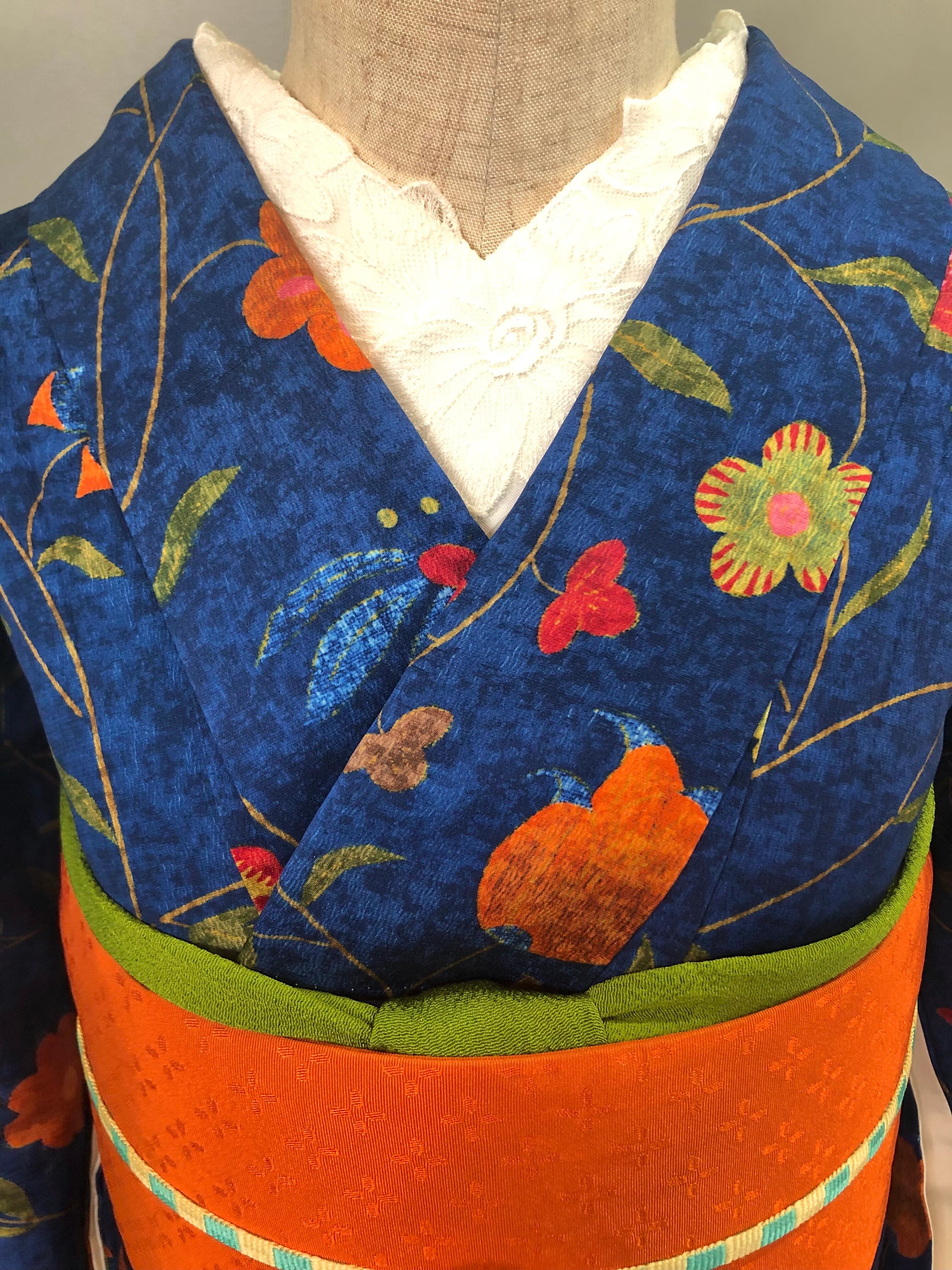 2色のブルーの地色に、モダンフラワーがオシャレな小紋着物です!