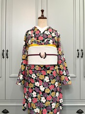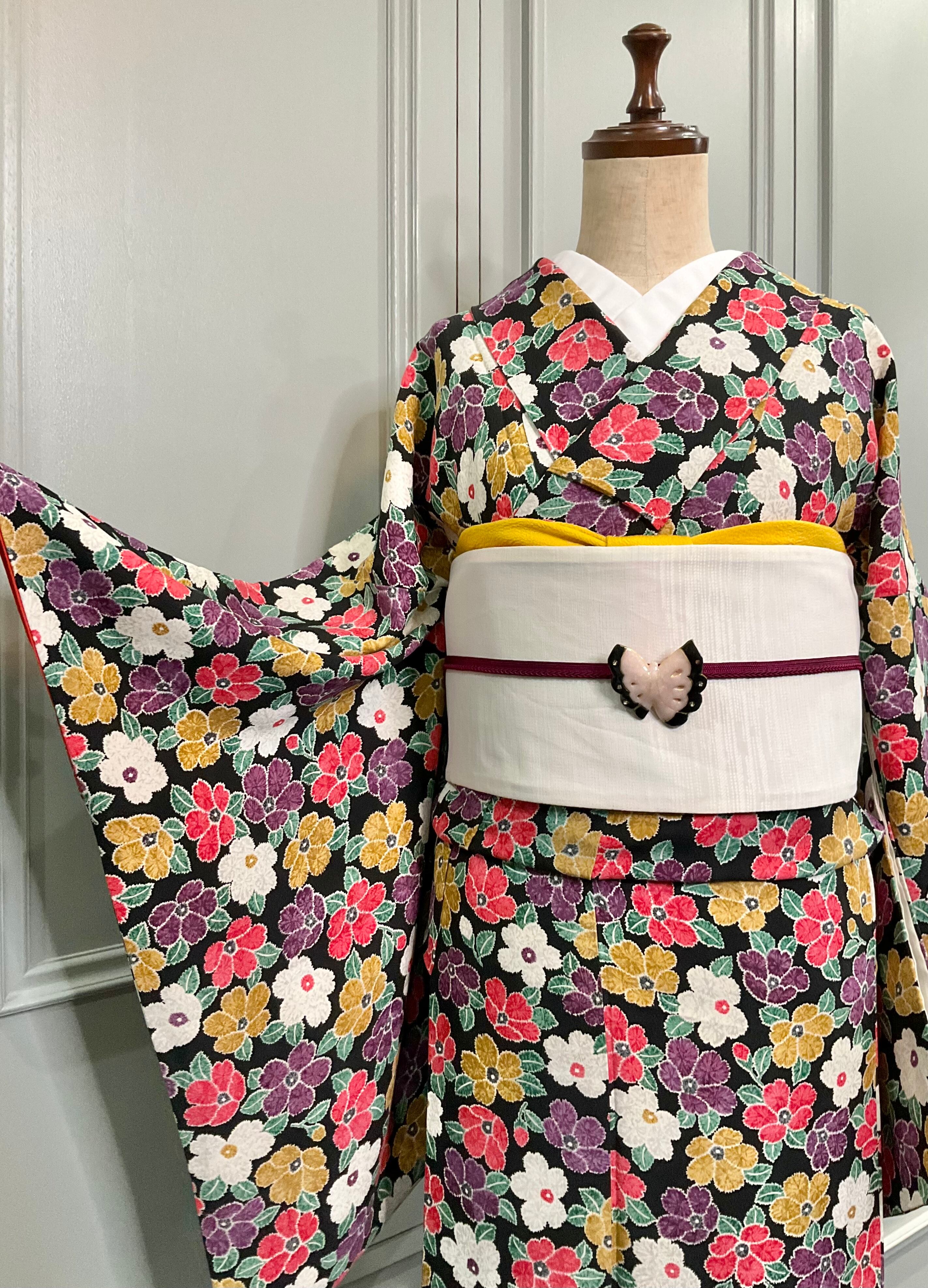ブラックの地色に、たくさんの花模様が描かれた小紋着物です♪