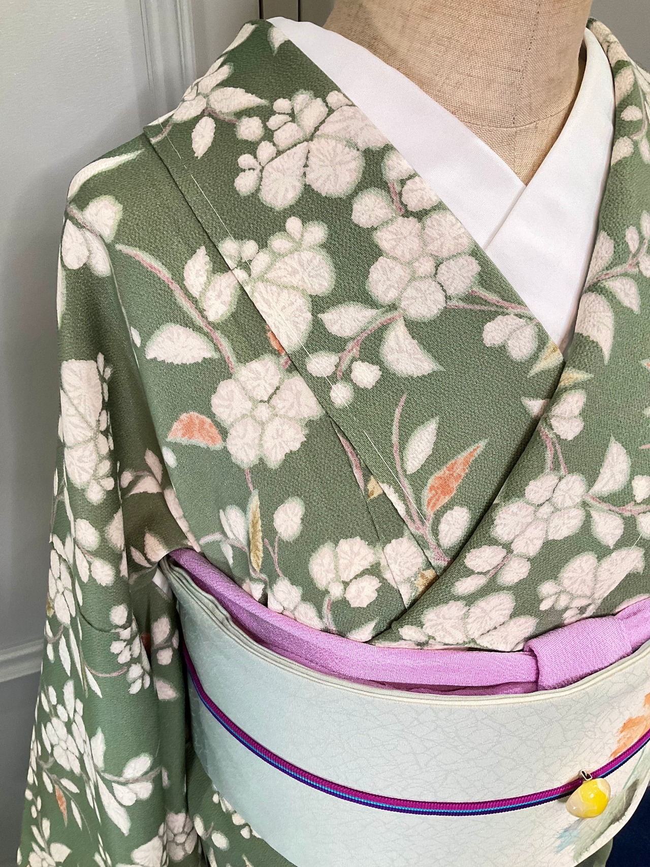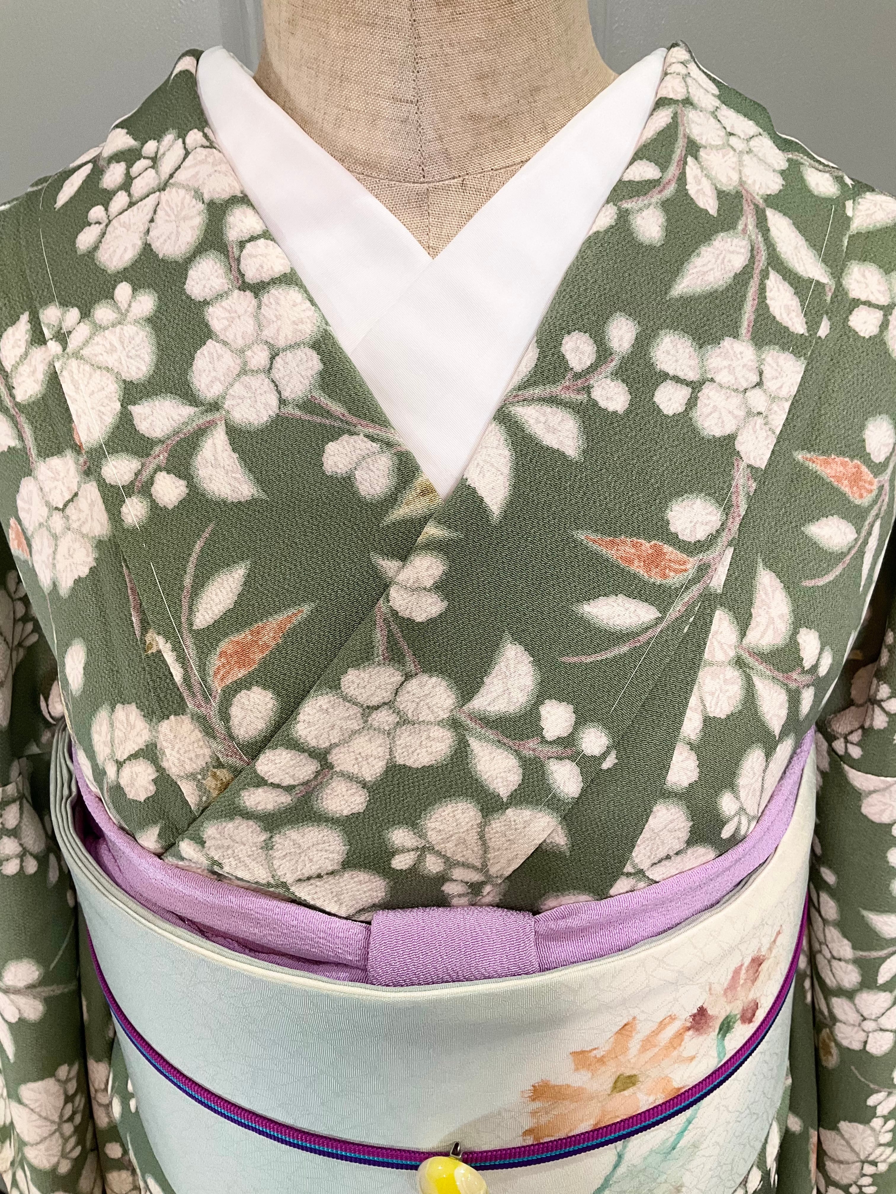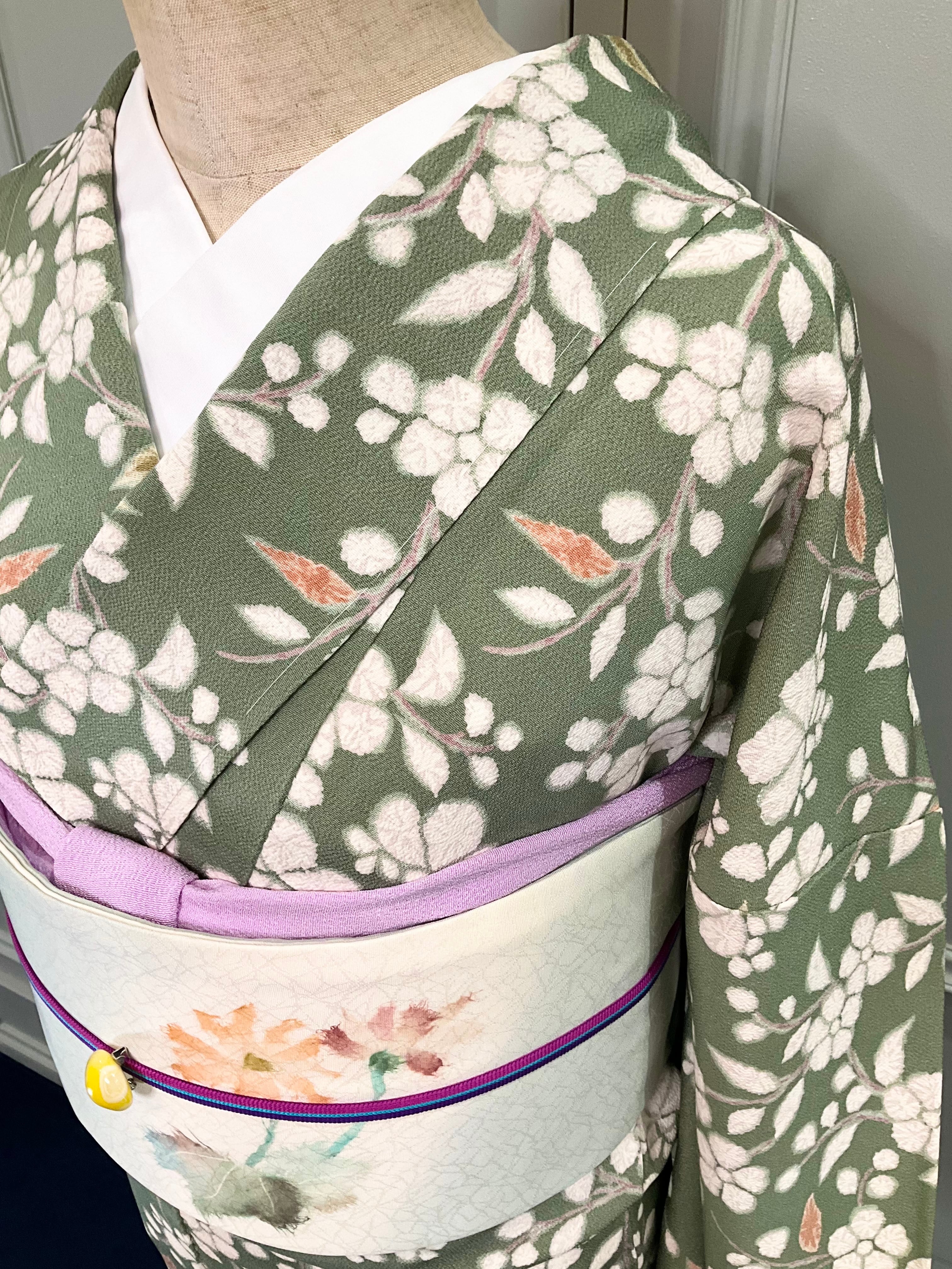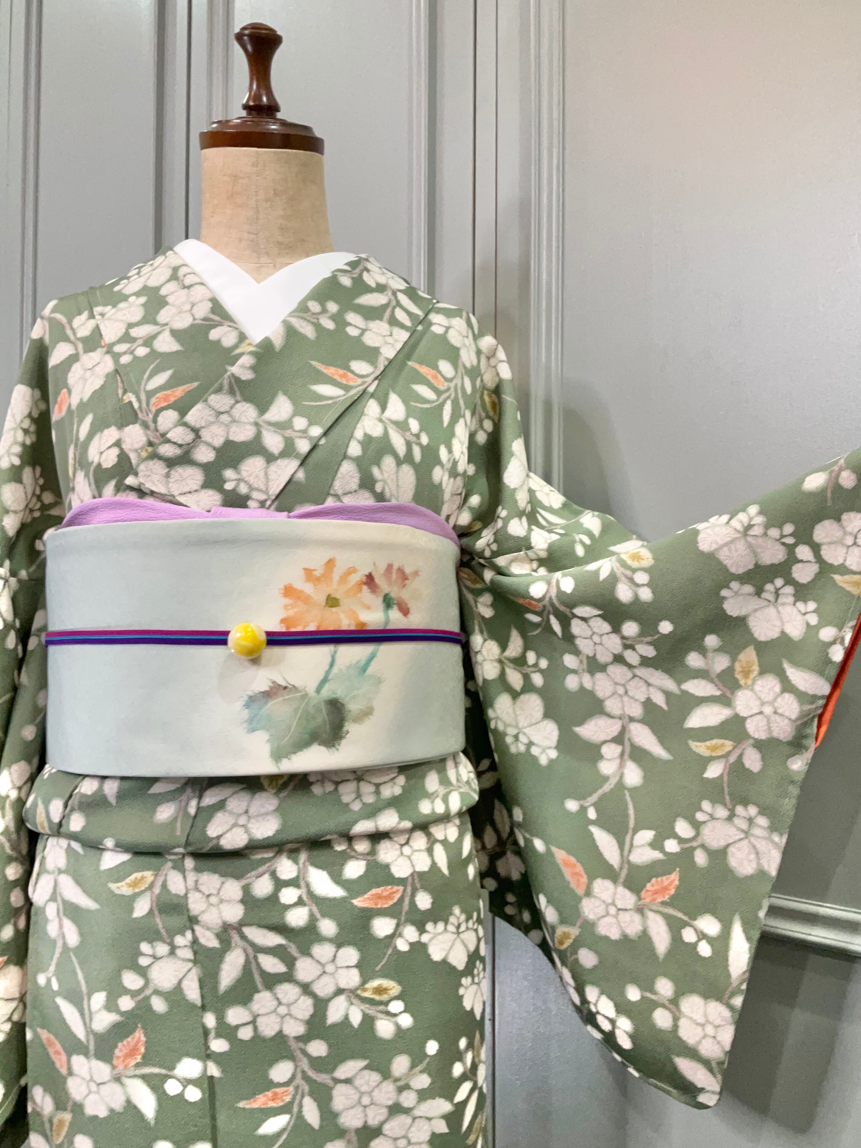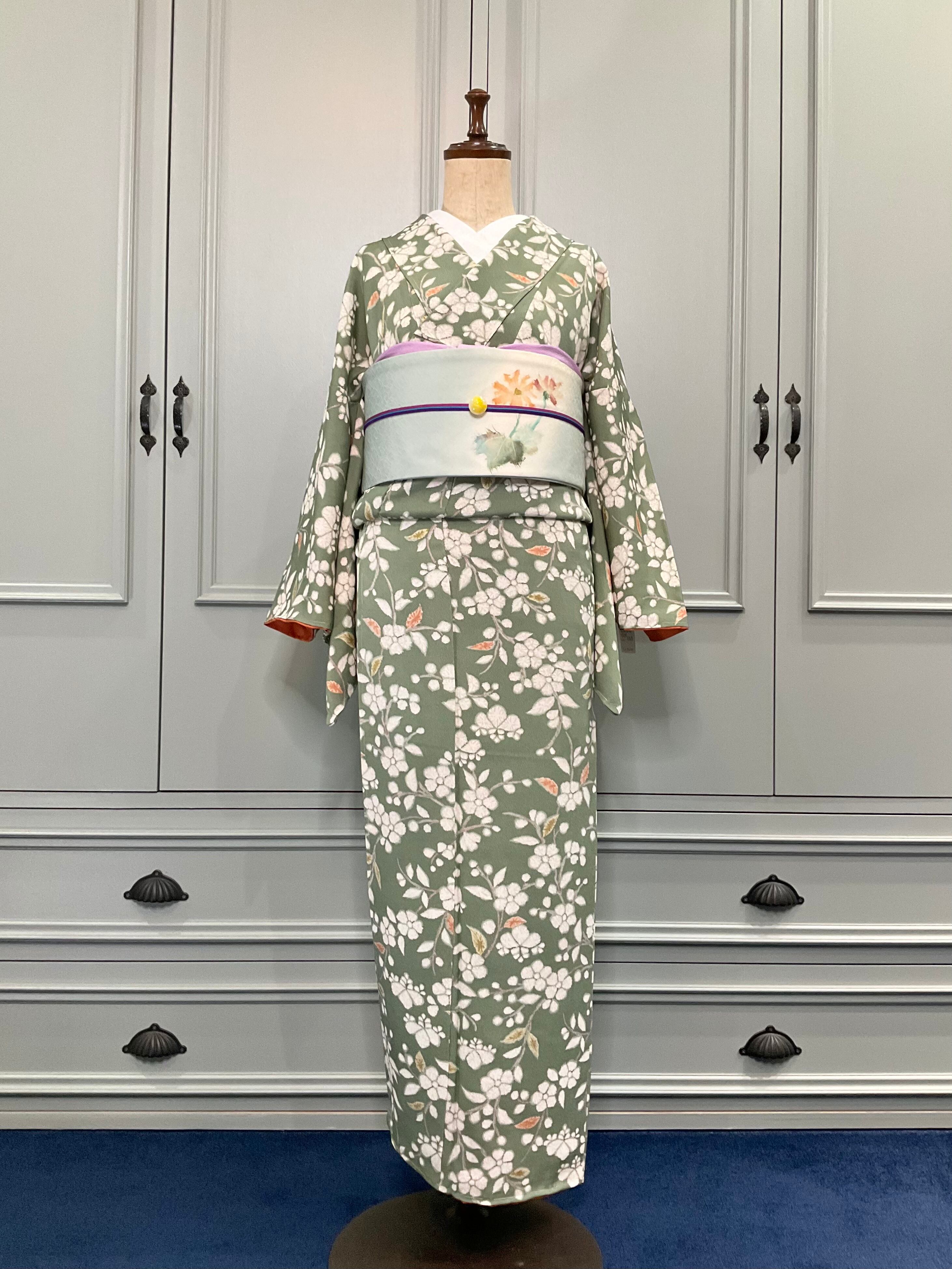 くすみグリーンの地色に、花模様が素敵な小紋着物です♪
