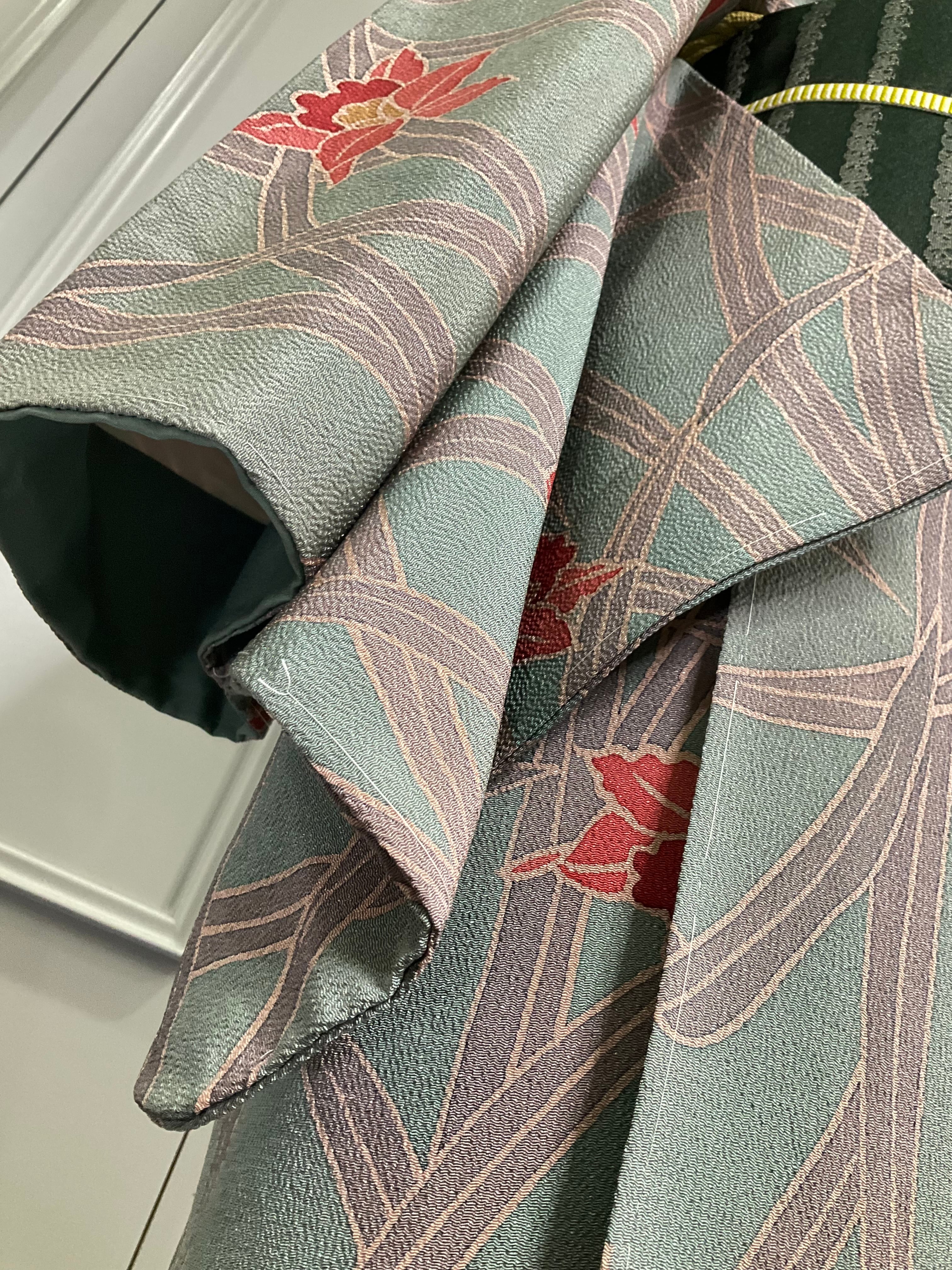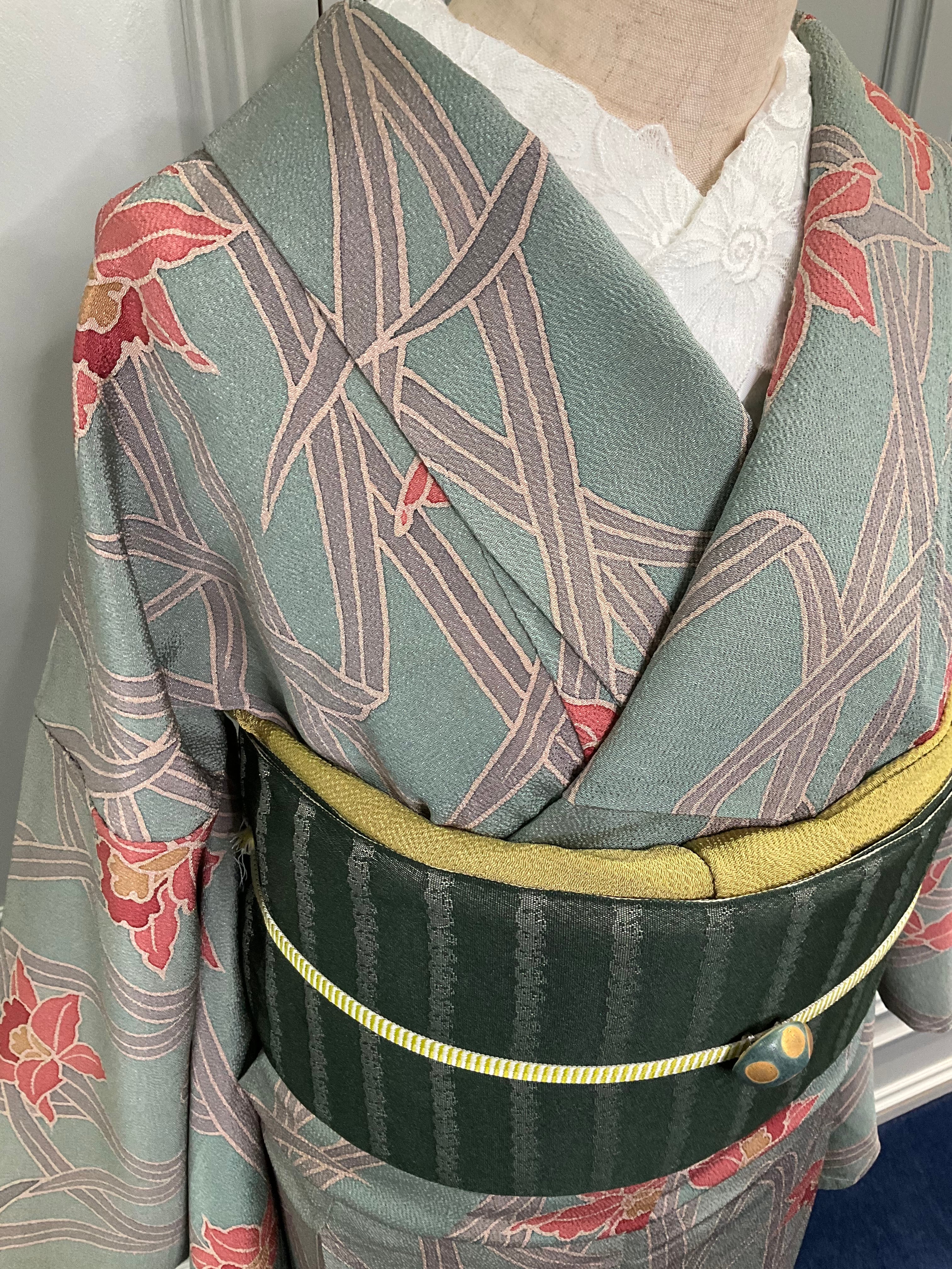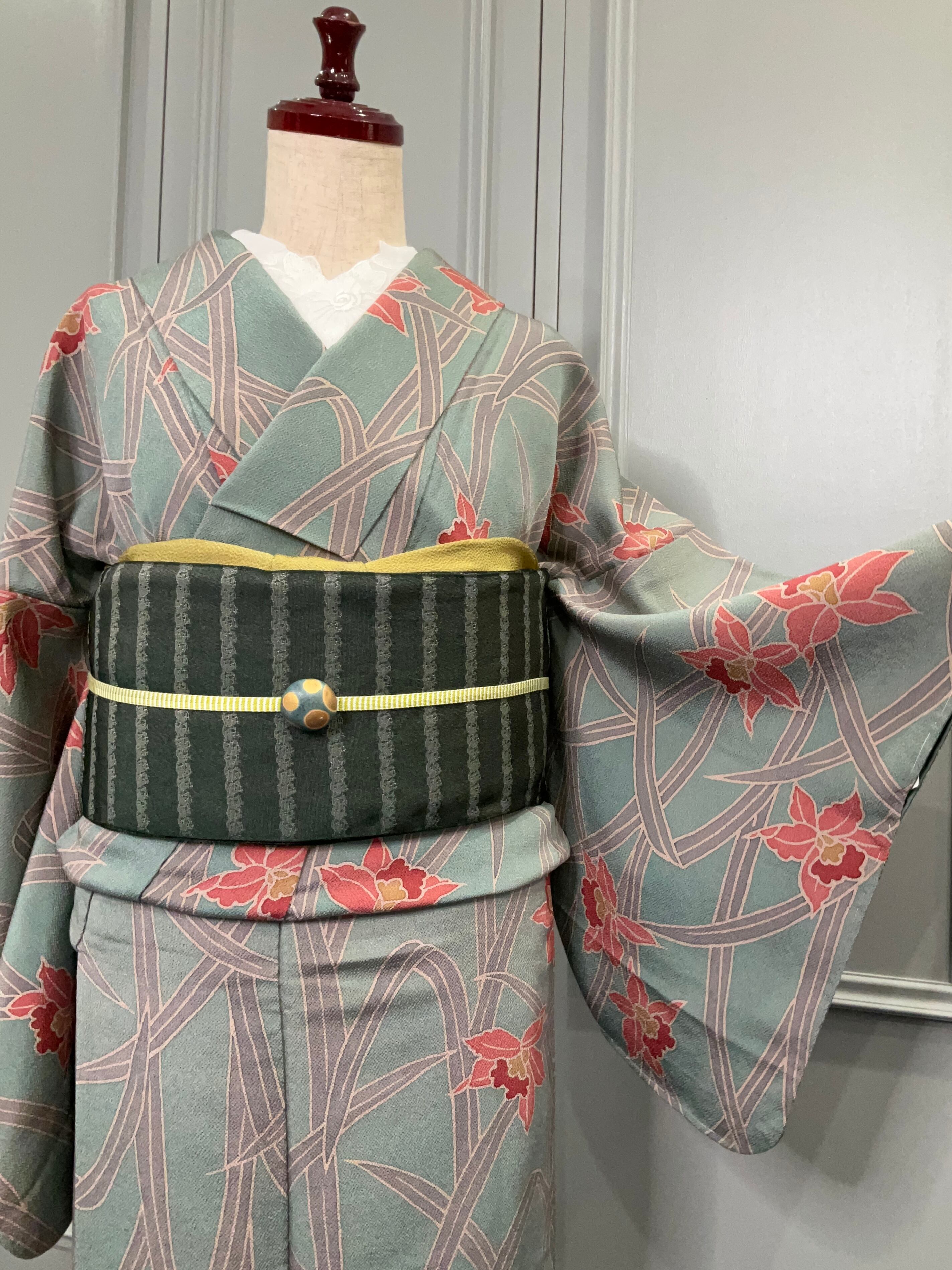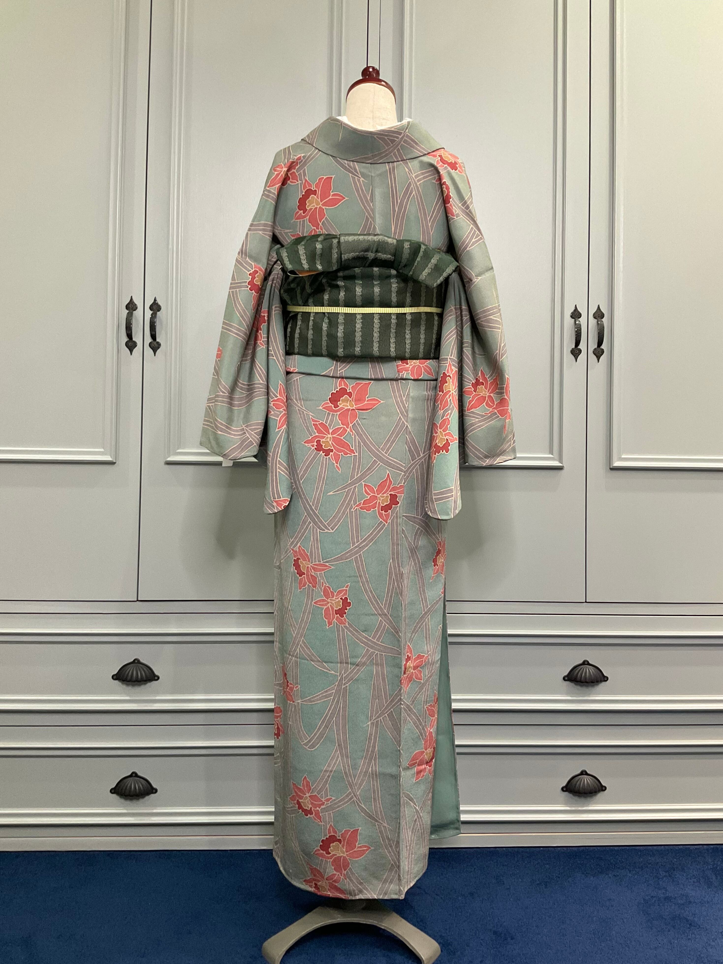 くすみグリーンの地色に、水仙の柄がデザインされた小紋着物です。