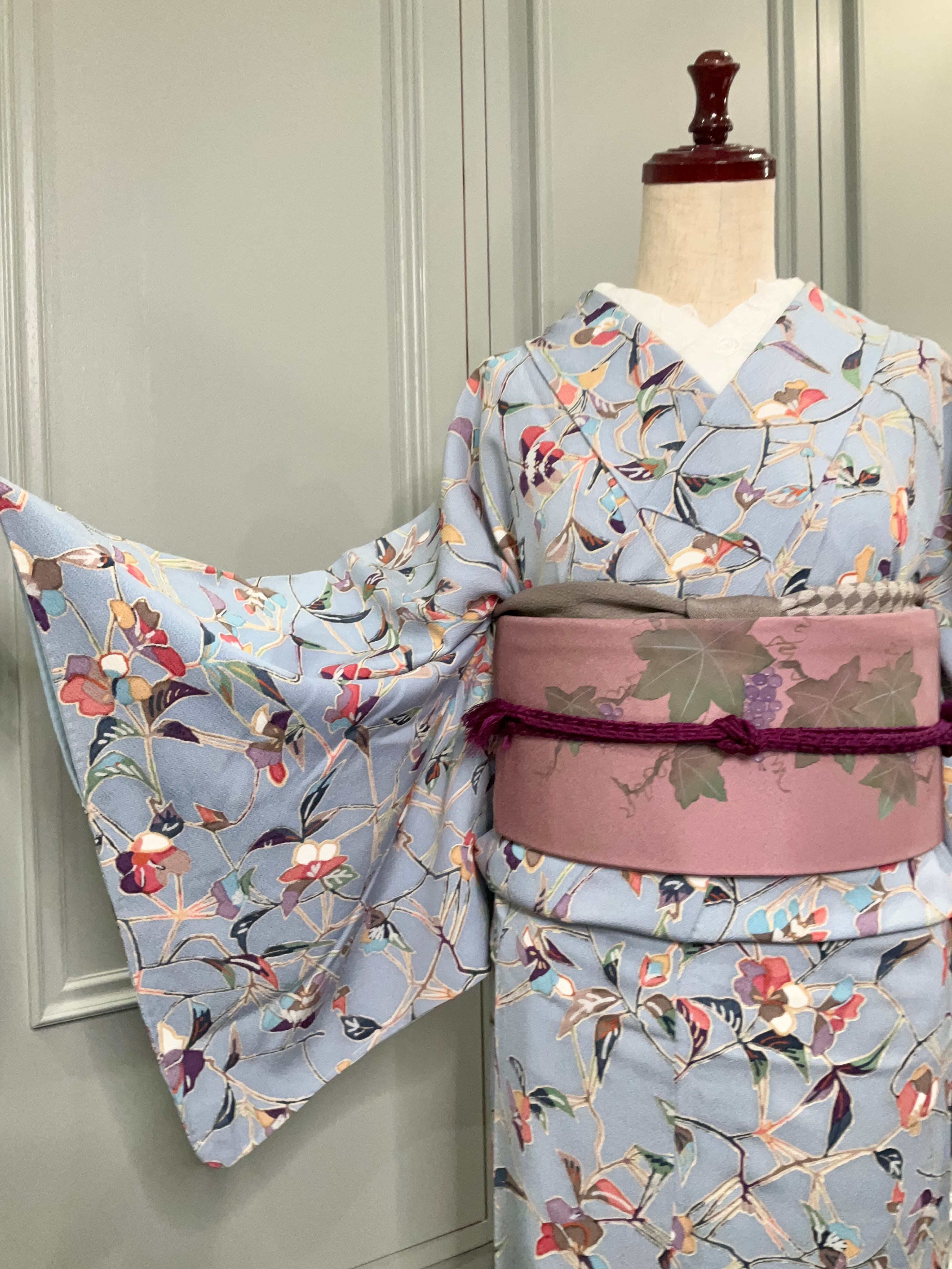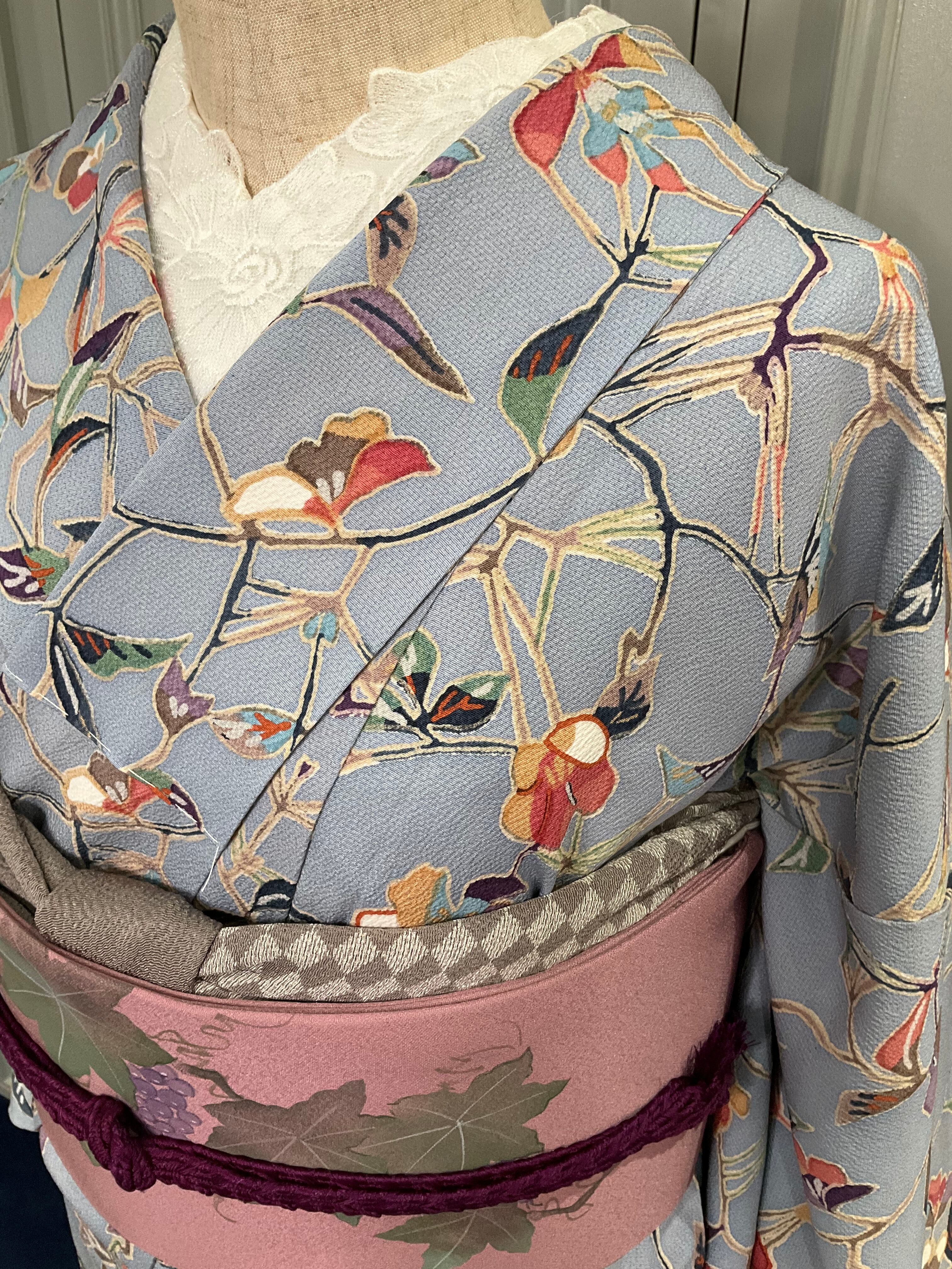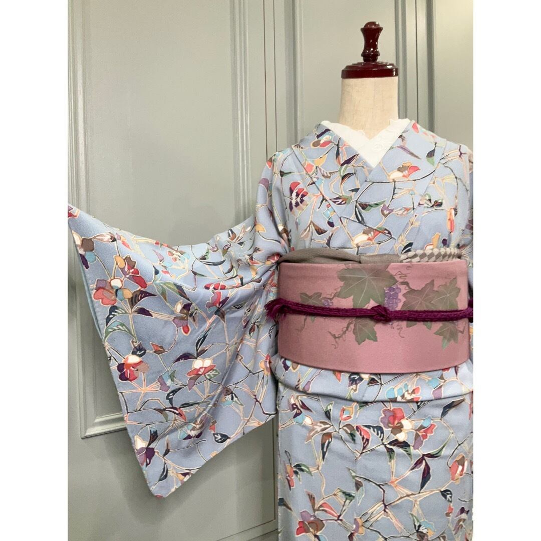 淡いブルーの地色に、たくさんの色が使われた花模様が素敵な小紋着物です♪