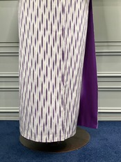 白地に、紫の矢絣がデザインされた小紋着物です。