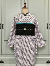 白と紫の2色のみでデザインされたお着物ですが、柄も細めに描かれていることによって、遠くから離れて見ると、細めのストライプ模様のようにも見えます♪