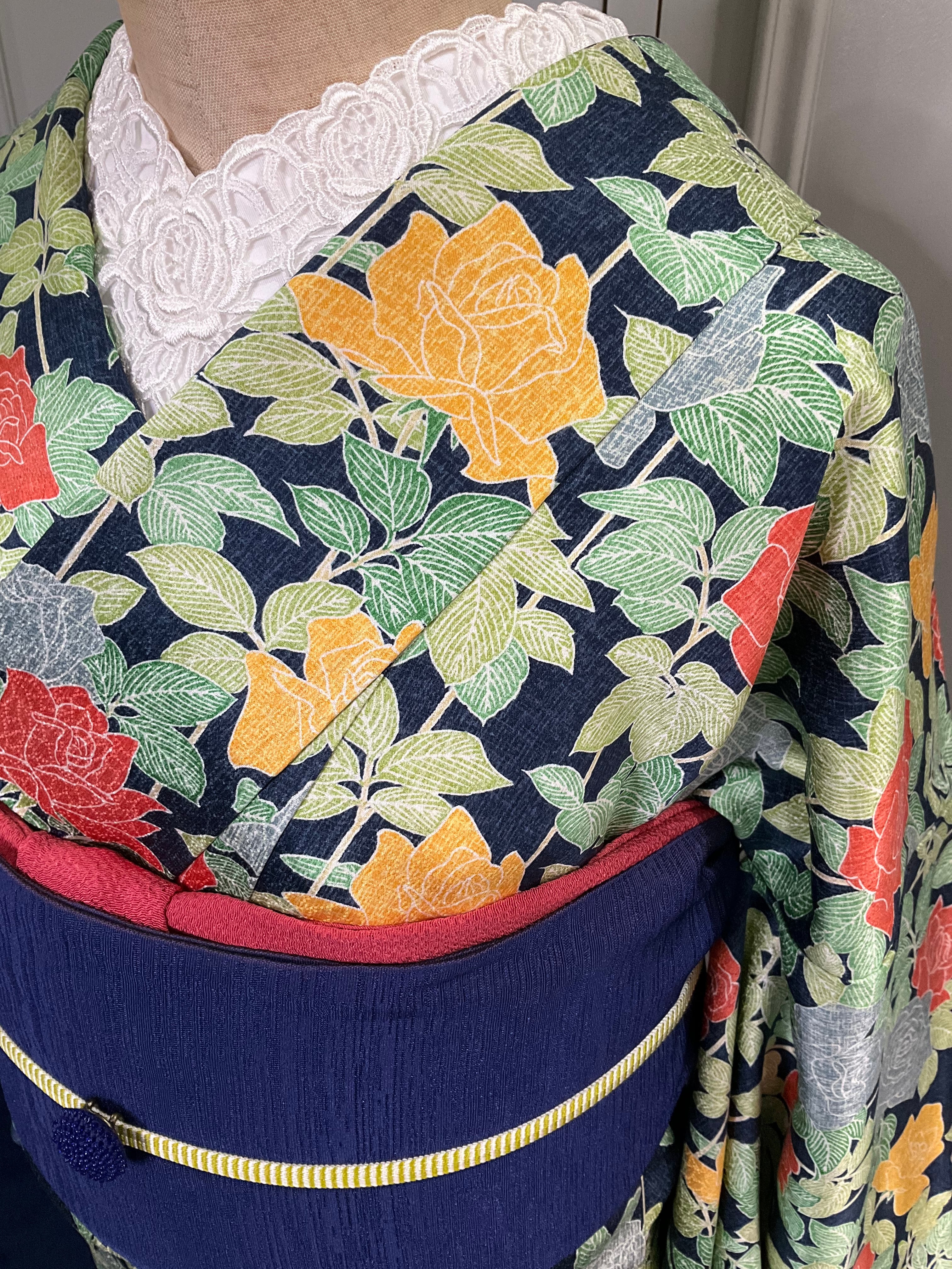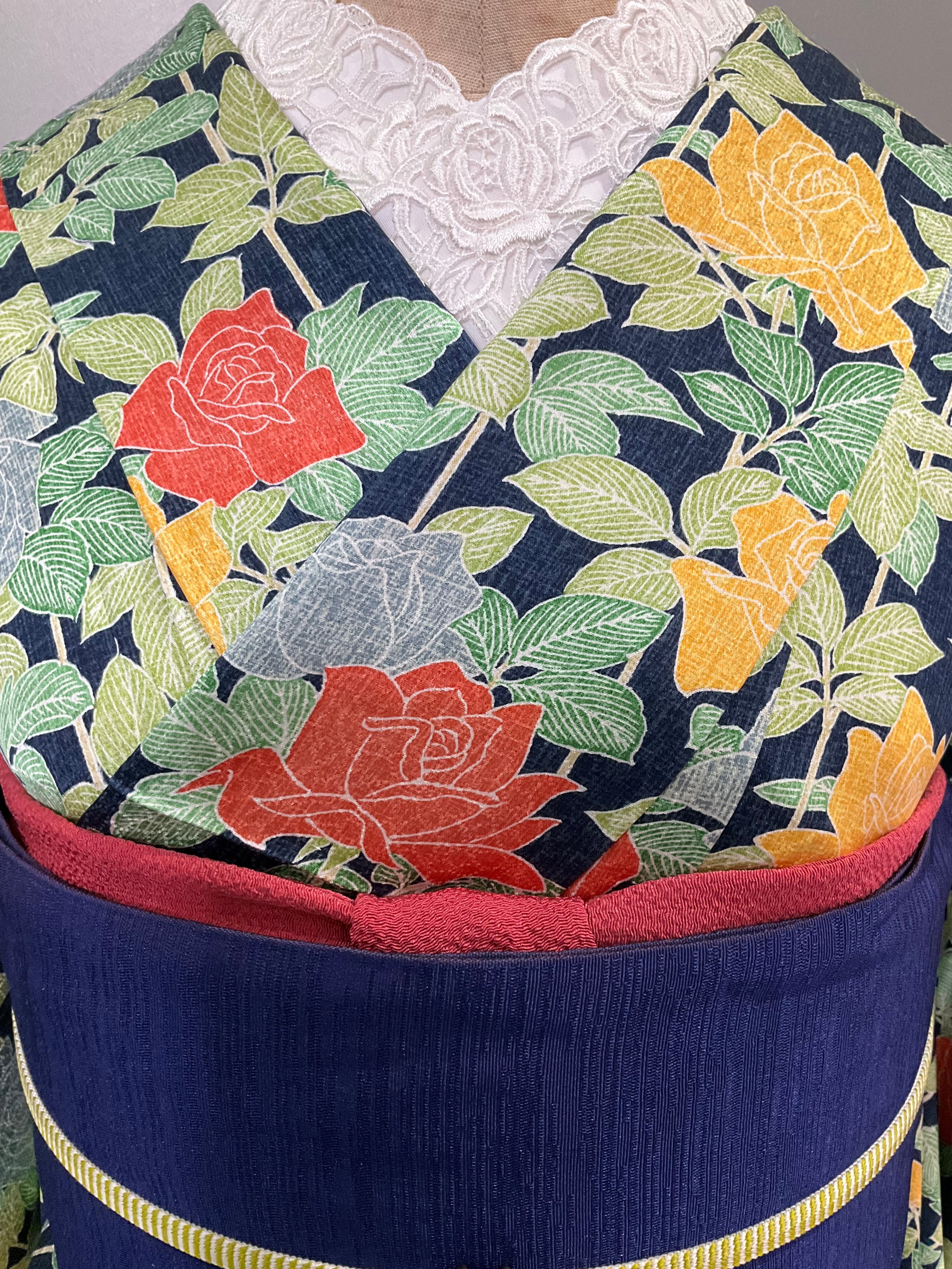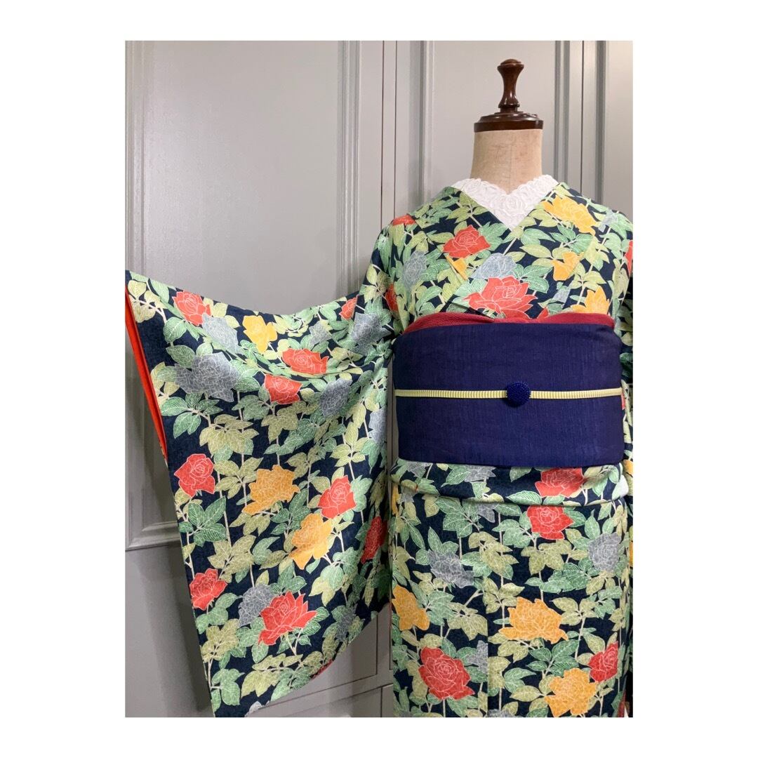 深いネイビーの地色に、たくさんの薔薇が描かれた、小紋着物です♪
