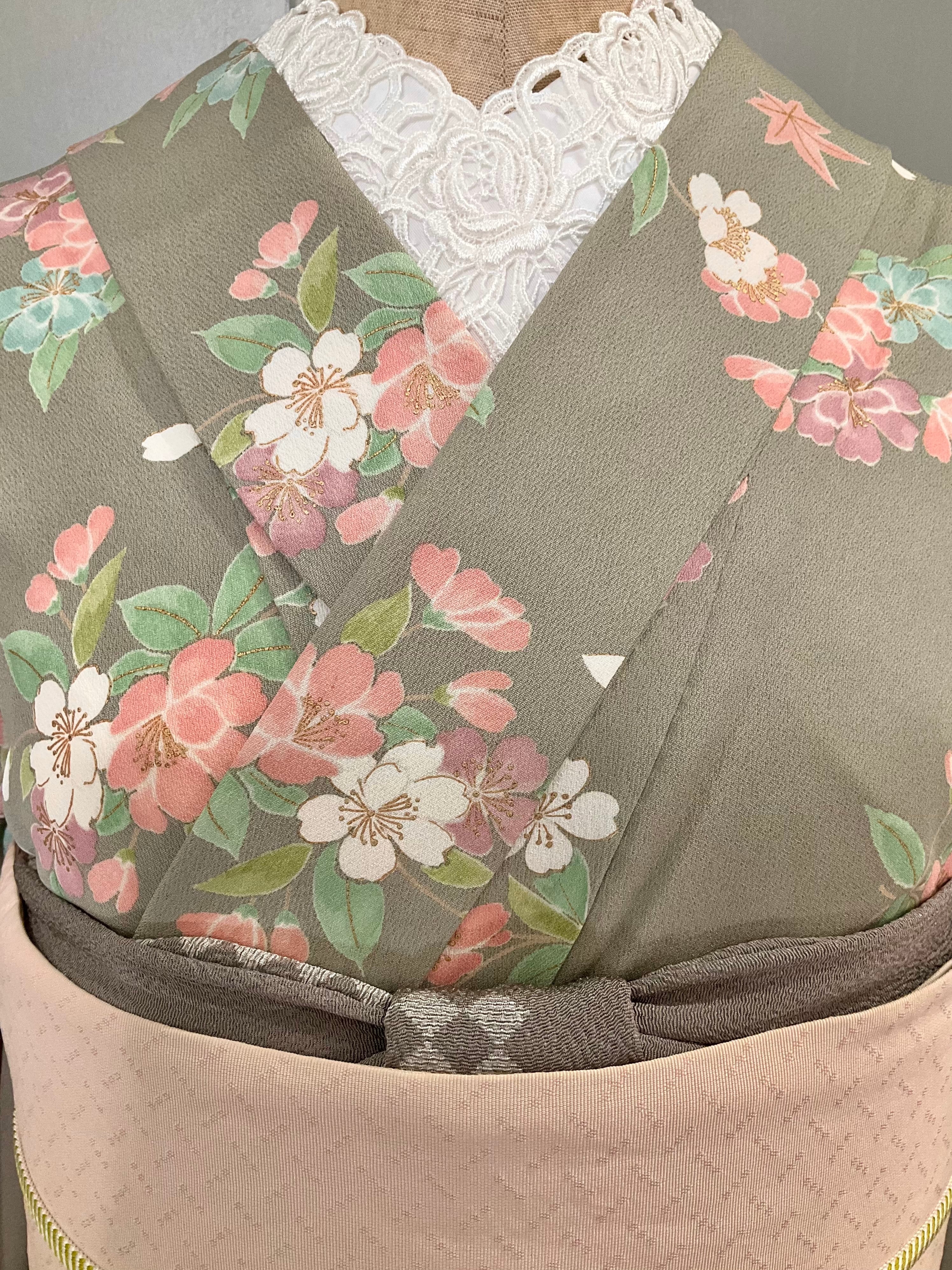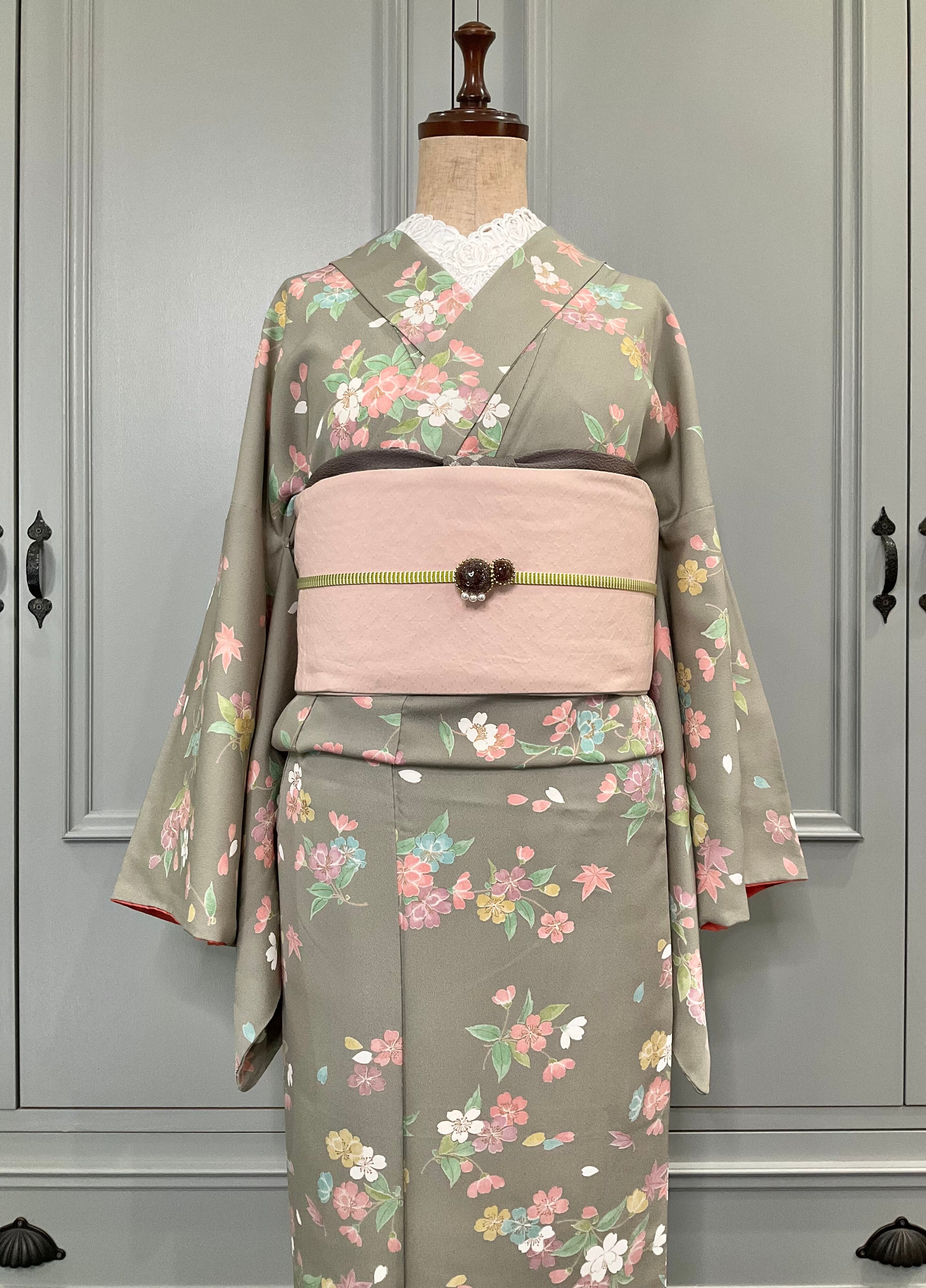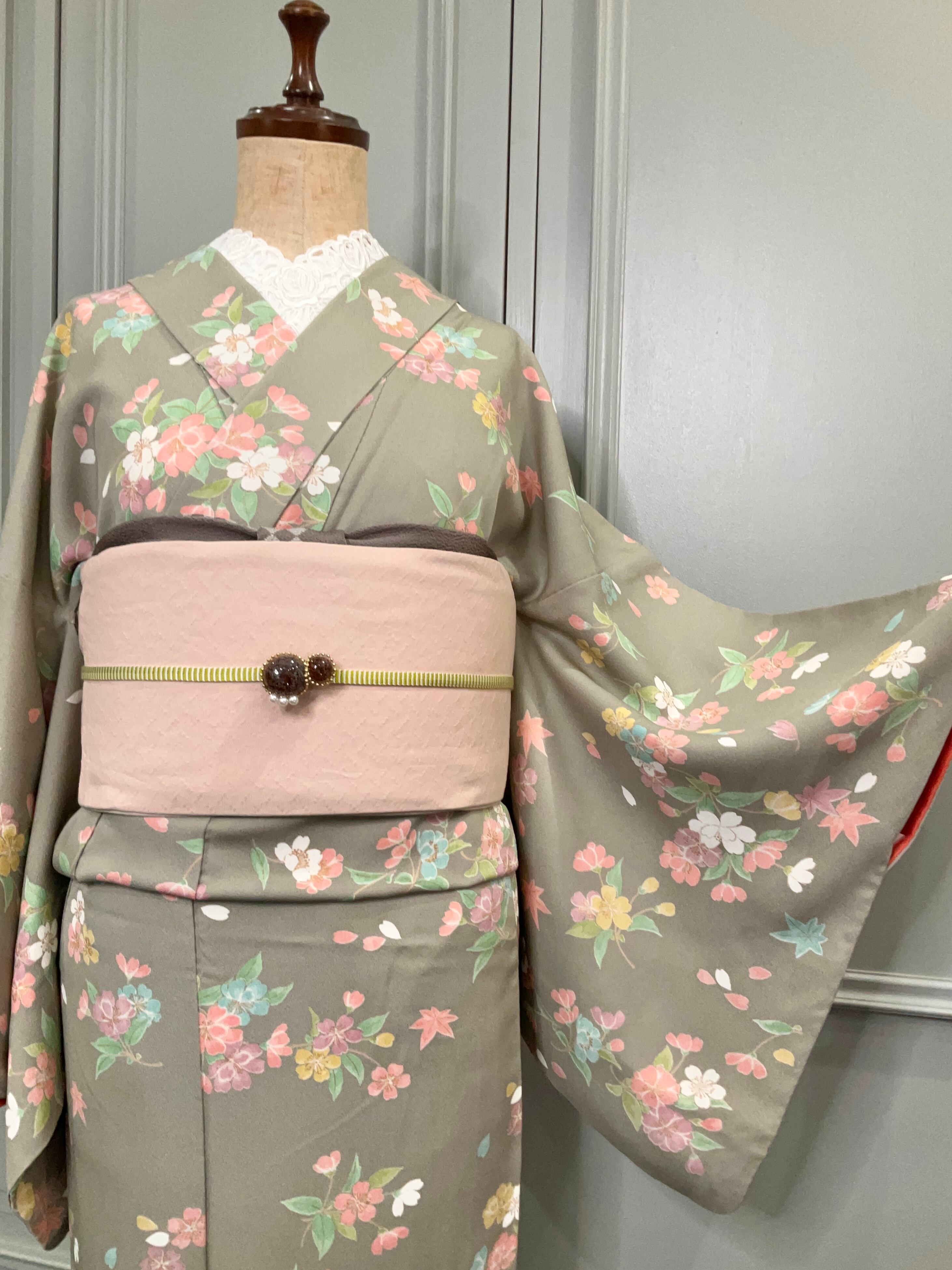 グレー系の地色に、パステルカラーの花模様が素敵な小紋着物です♪