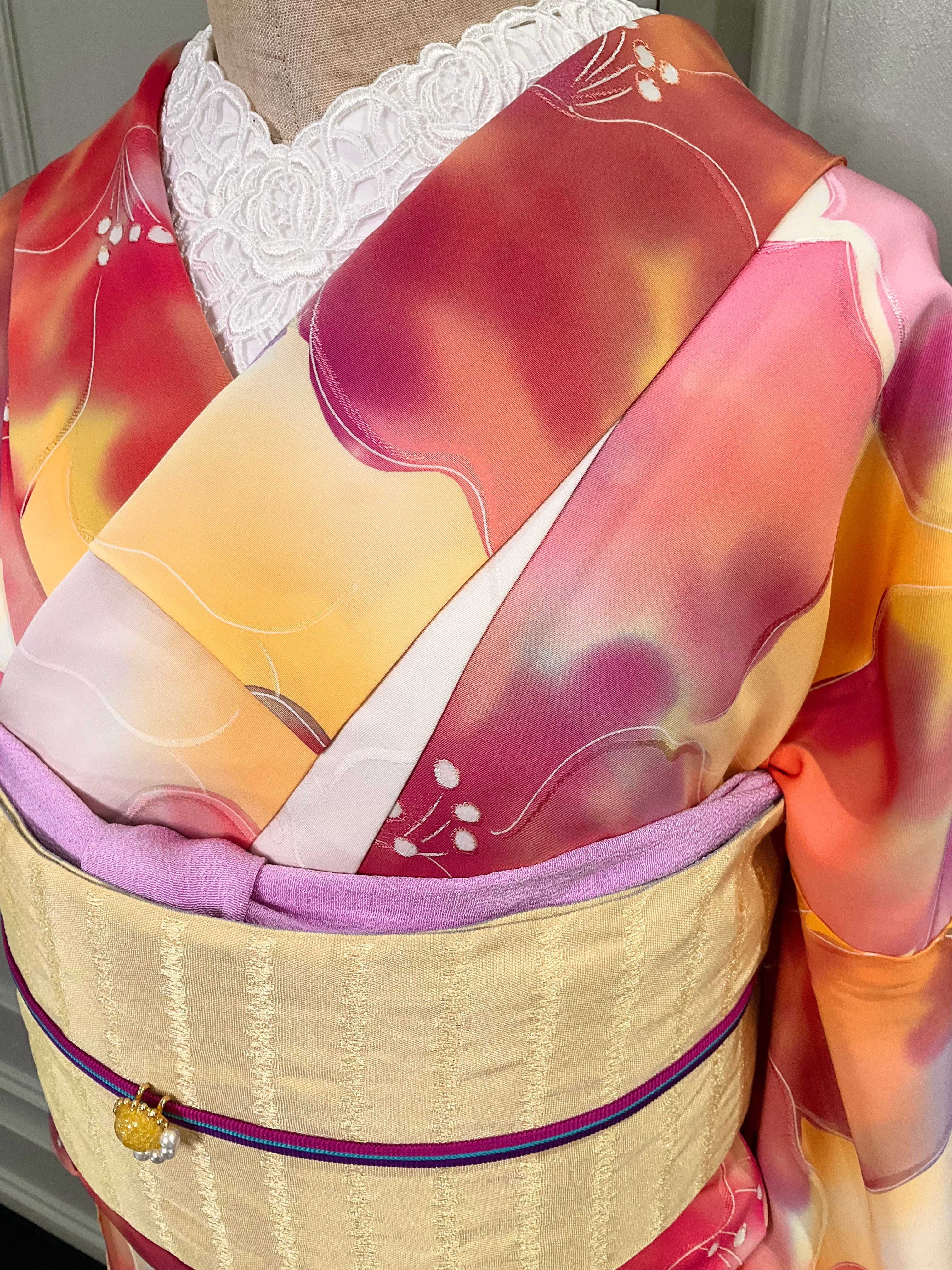 暖色系のグラデーションに、大輪の花模様がデザインされた小紋着物です♪