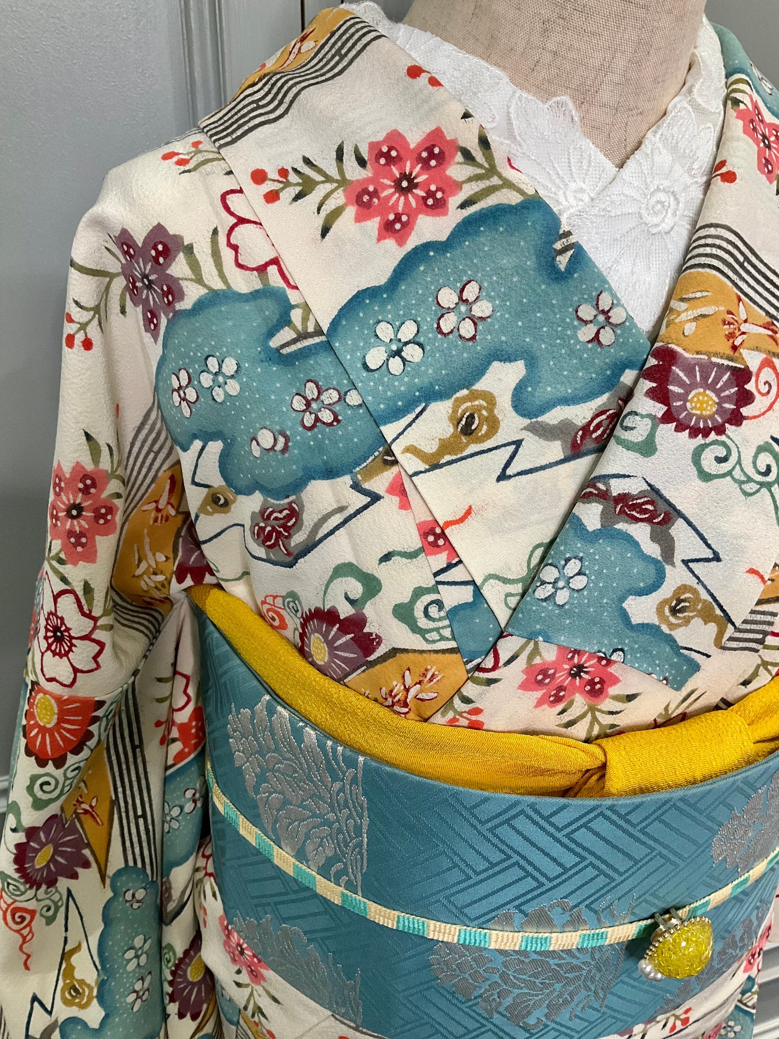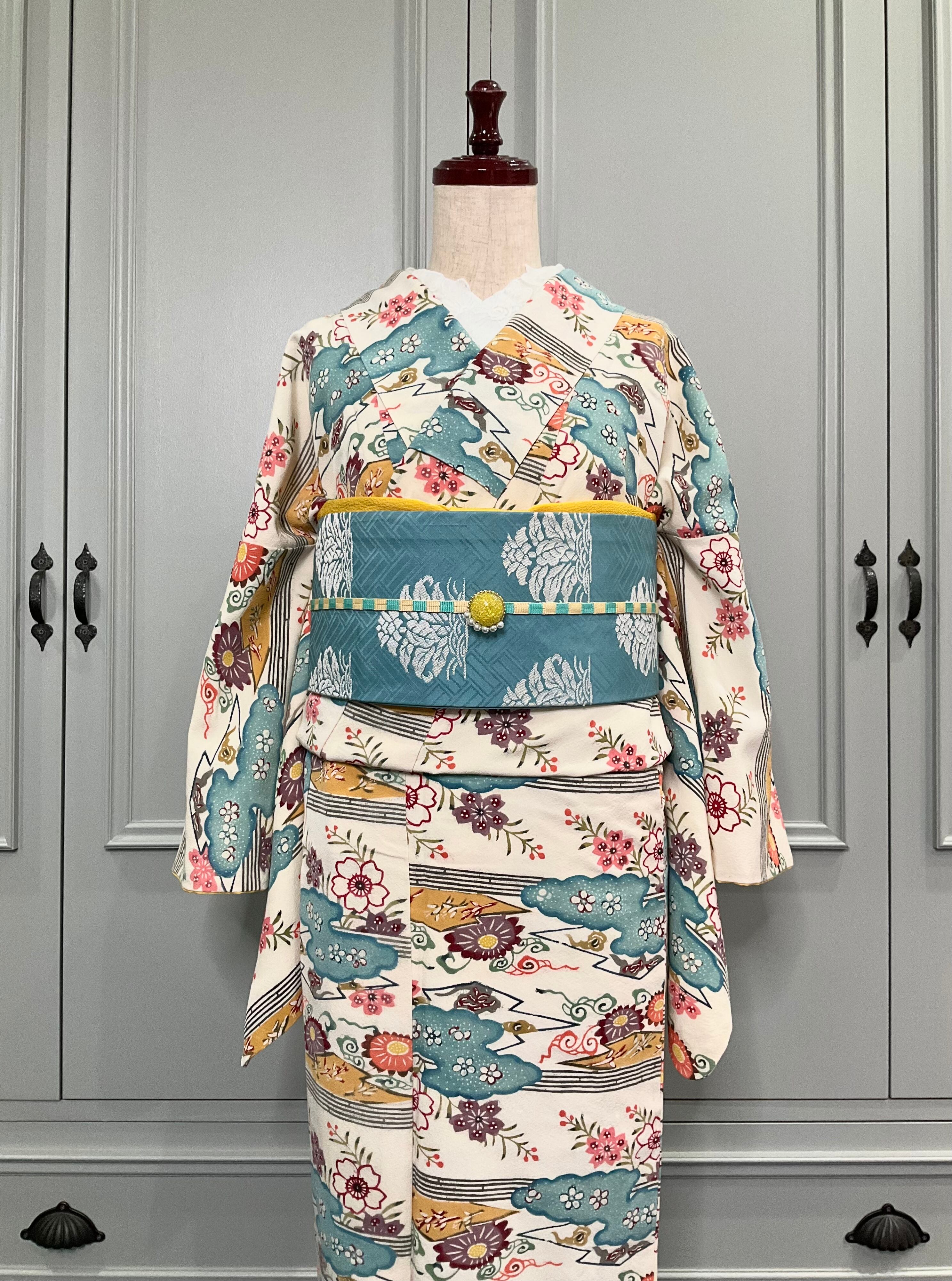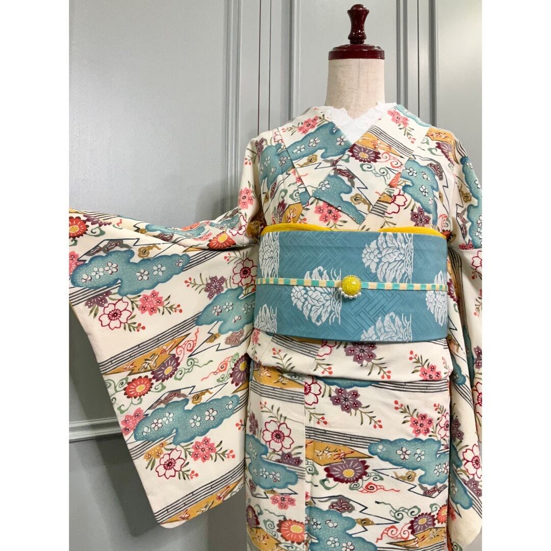 アイボリー系の地色に、紅型調のデザインが素敵な小紋着物です♪