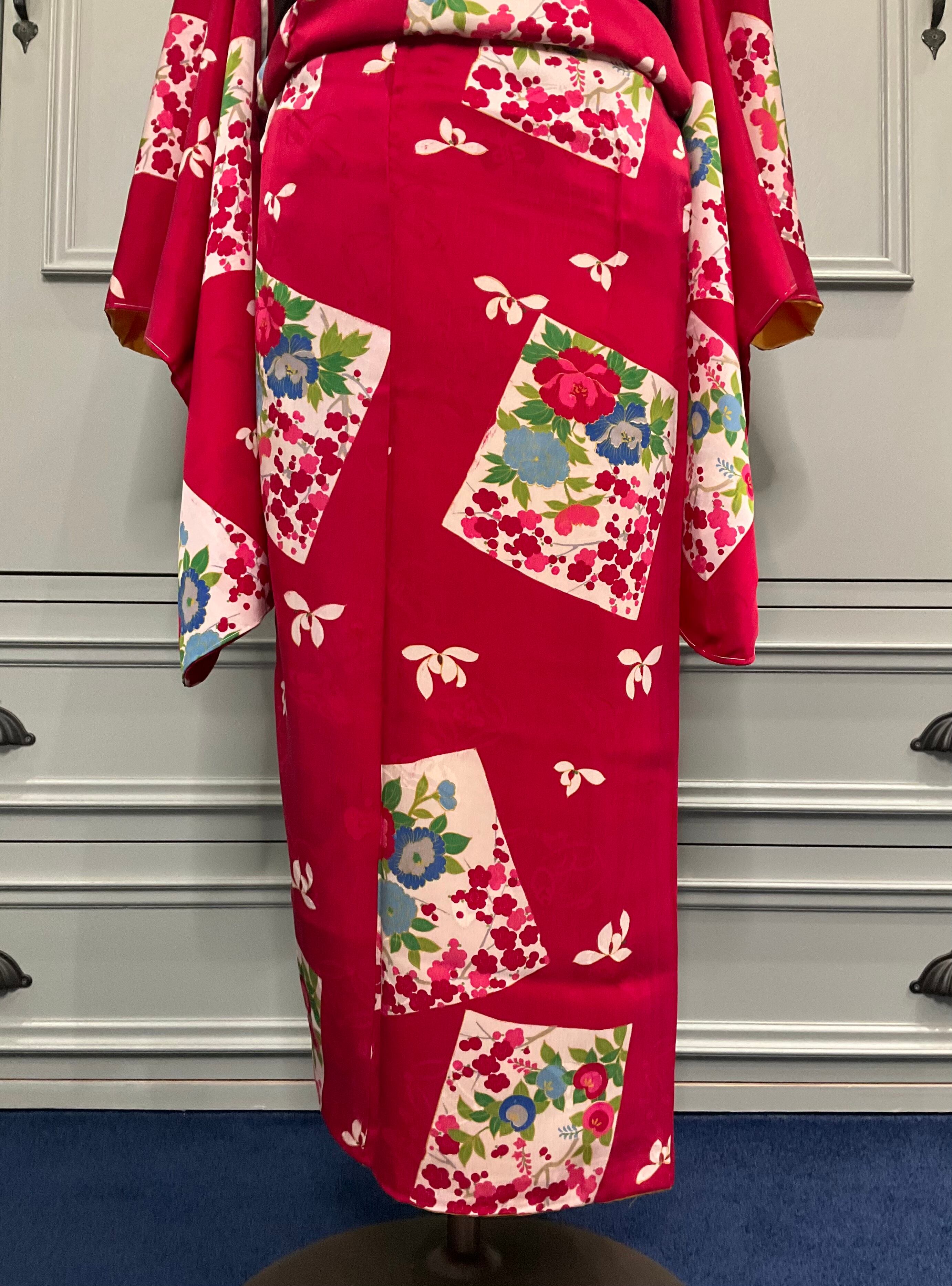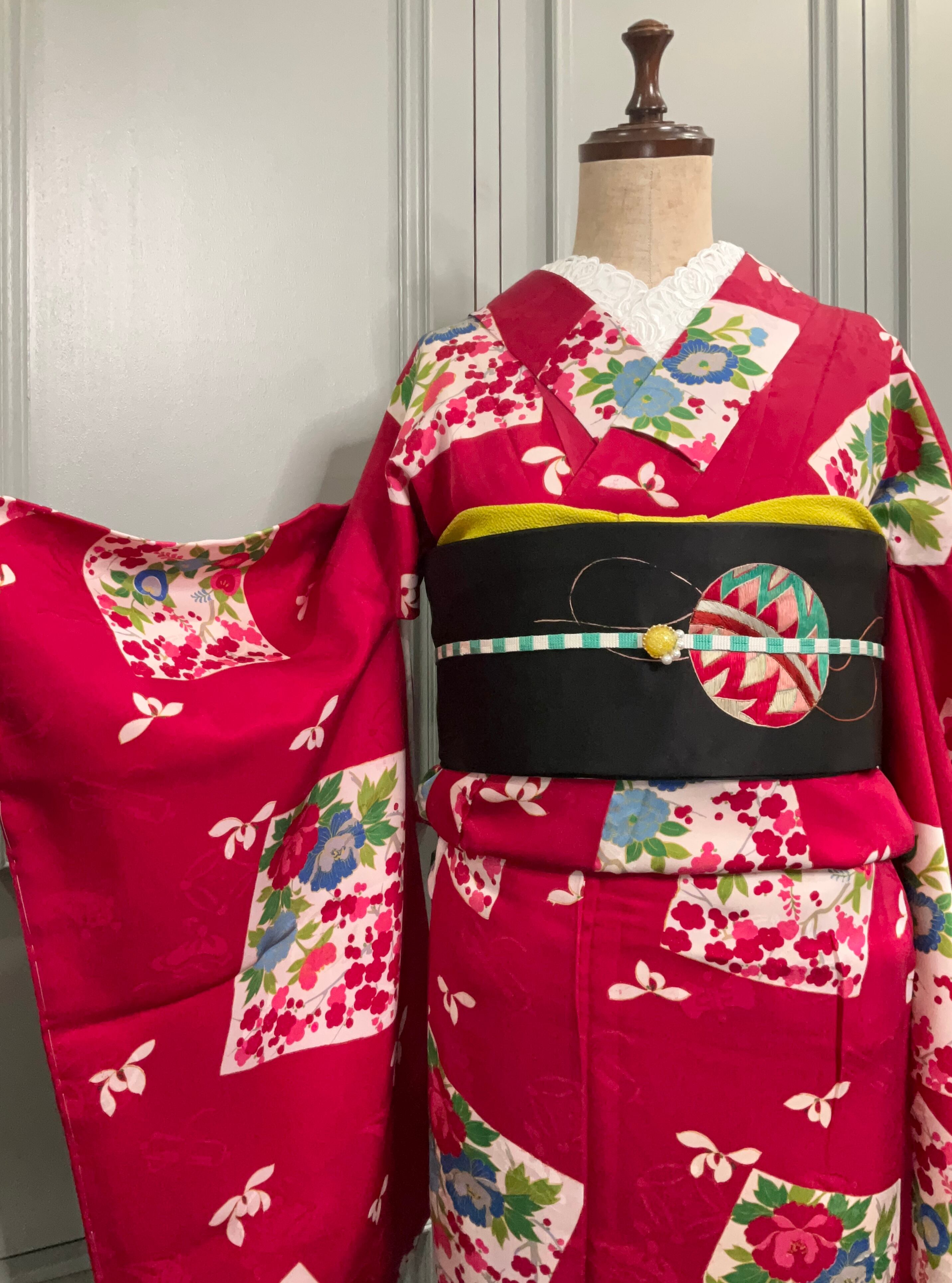 鮮やかな赤の地色に、色紙に花模様がデザインされたアンティーク小紋着物です♪