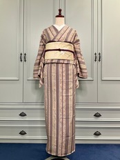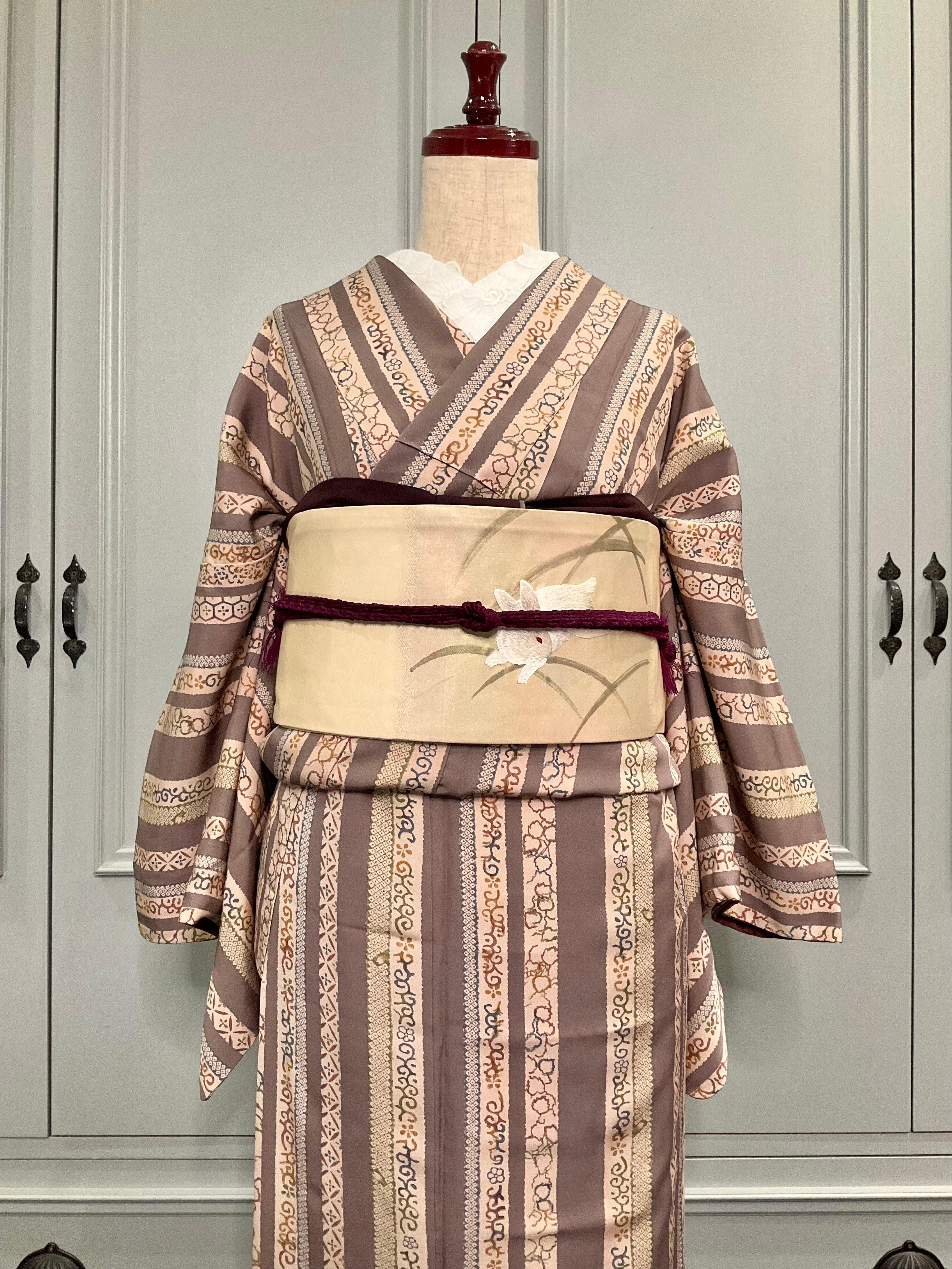 ブラウン系の縦ラインに、デザインされた花模様が素敵な小紋着物です♪