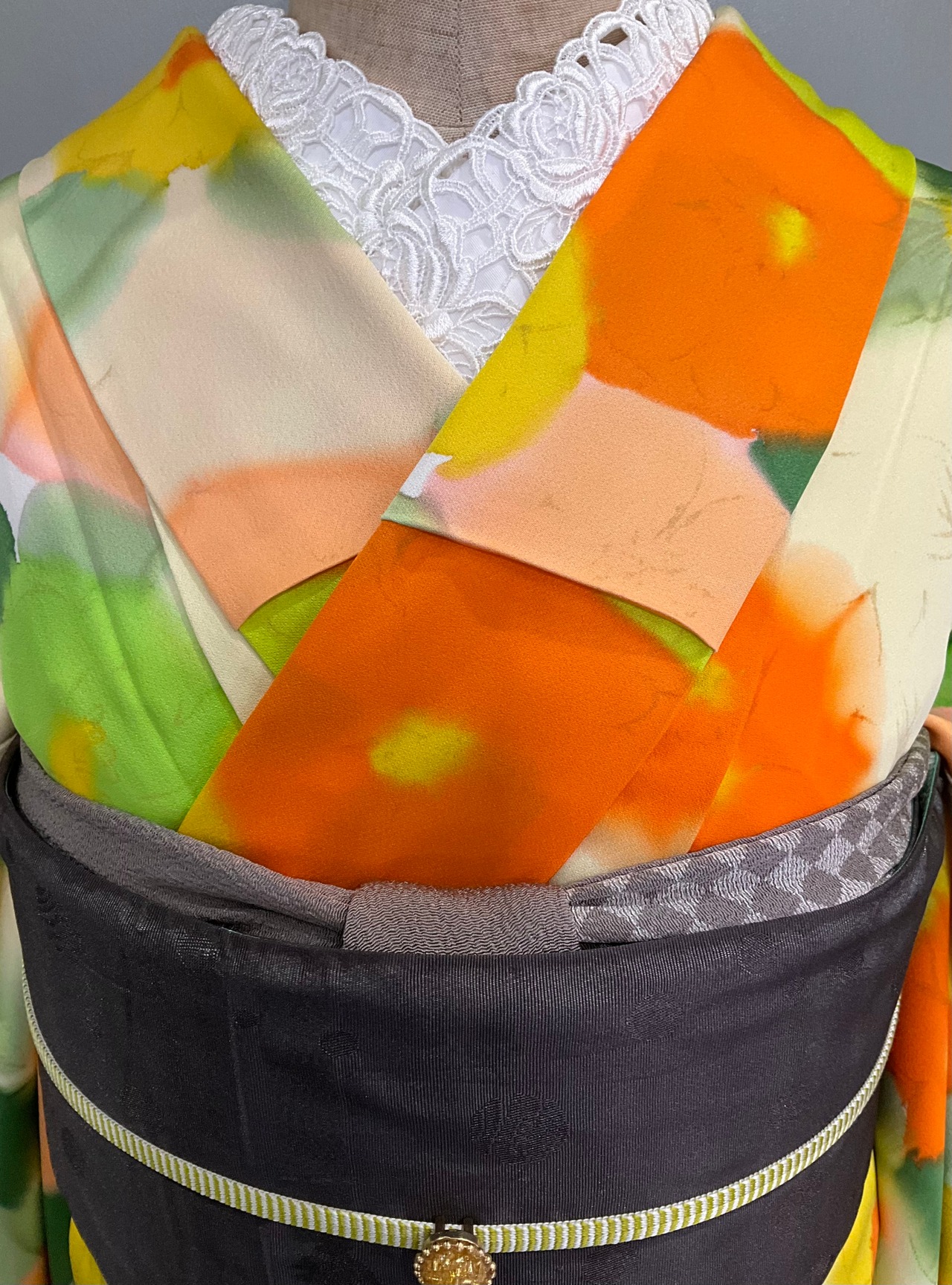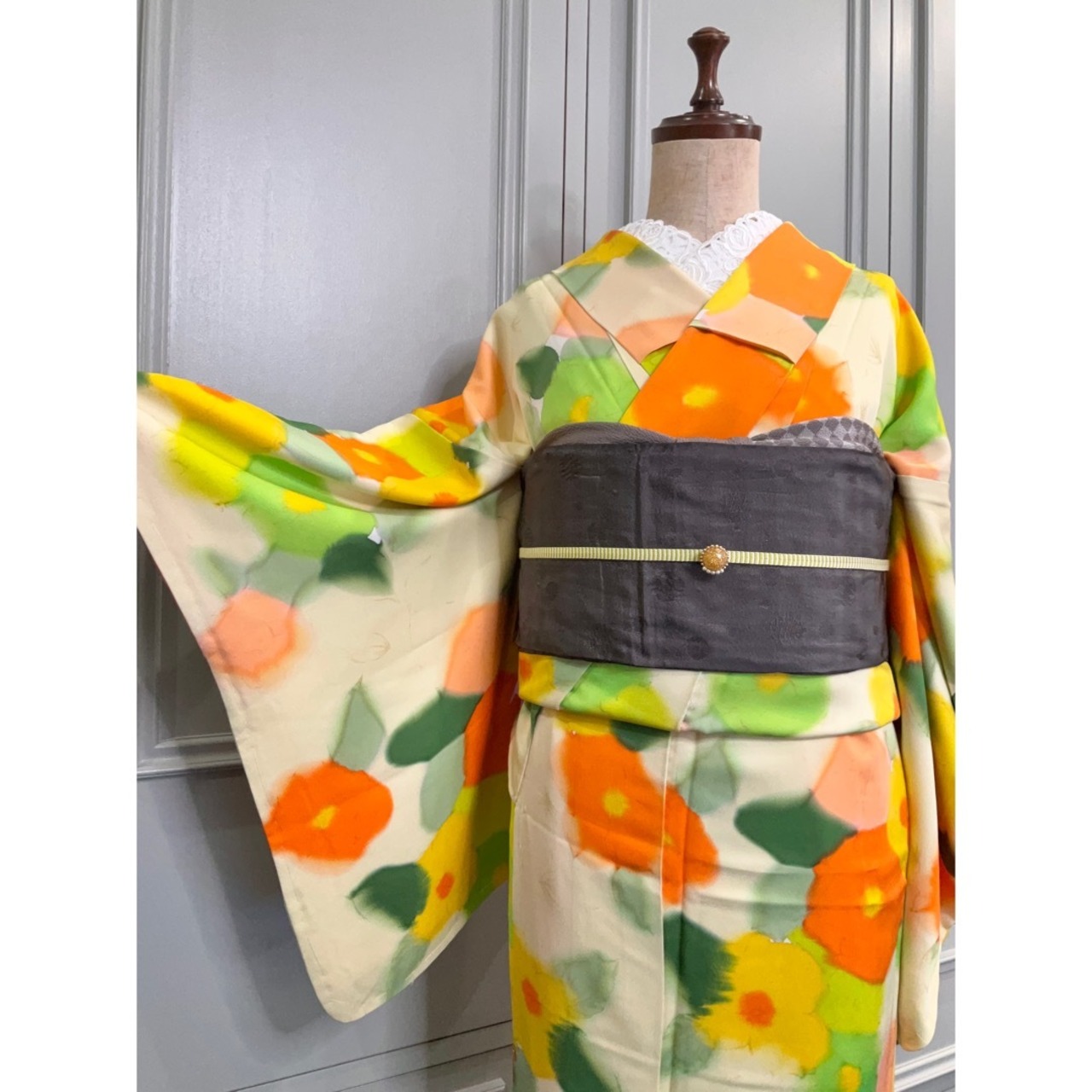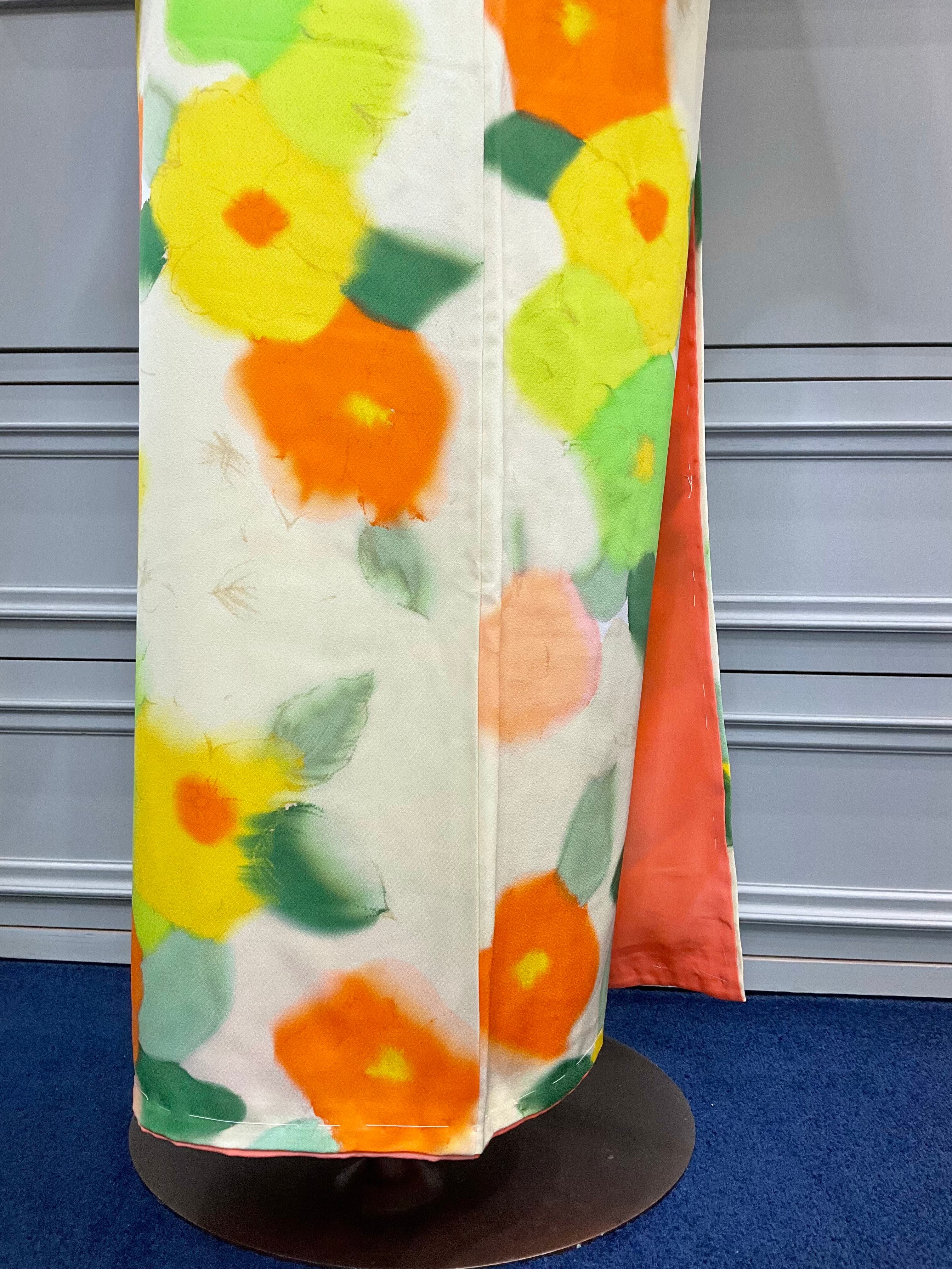 クリーム系の地色に、鮮やかな花模様が素敵な小紋着物です♪