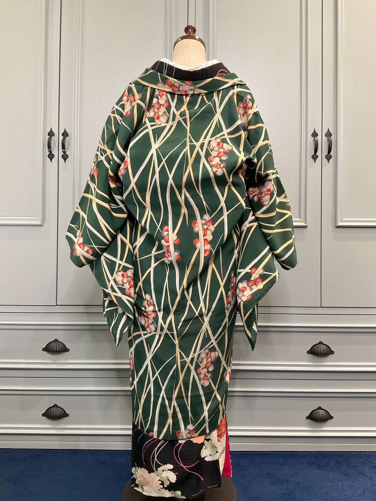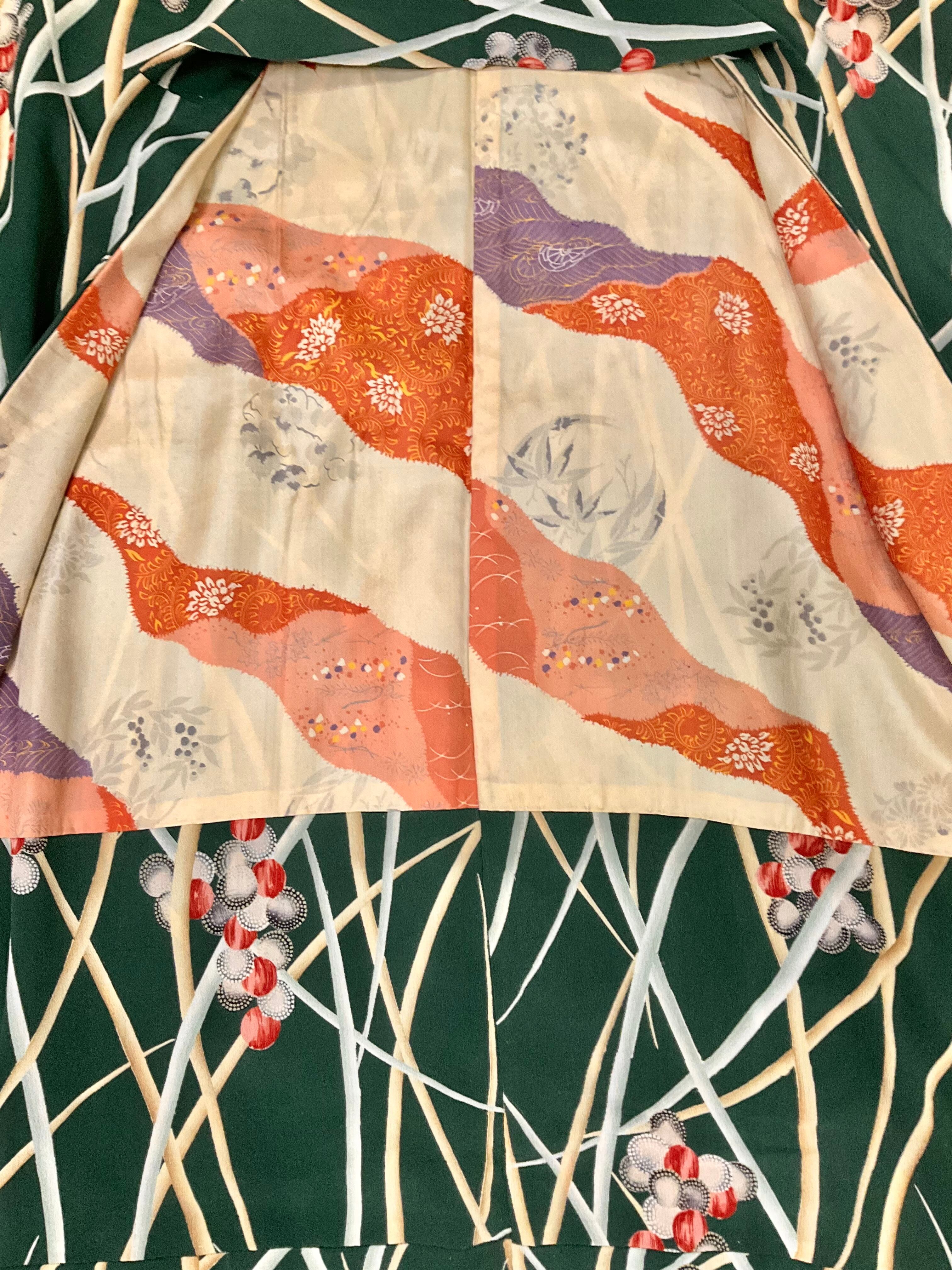 落ち着いた緑の地色に、葡萄柄がデザインされたアンティーク長羽織です。