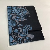 黒地に、ブルーや薄いブラウン系で鳥や草花がデザインされた洒落袋帯です♪