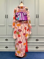 淡いピンクの地色に、立涌と花模様が素敵なアンティーク小紋着物です♪