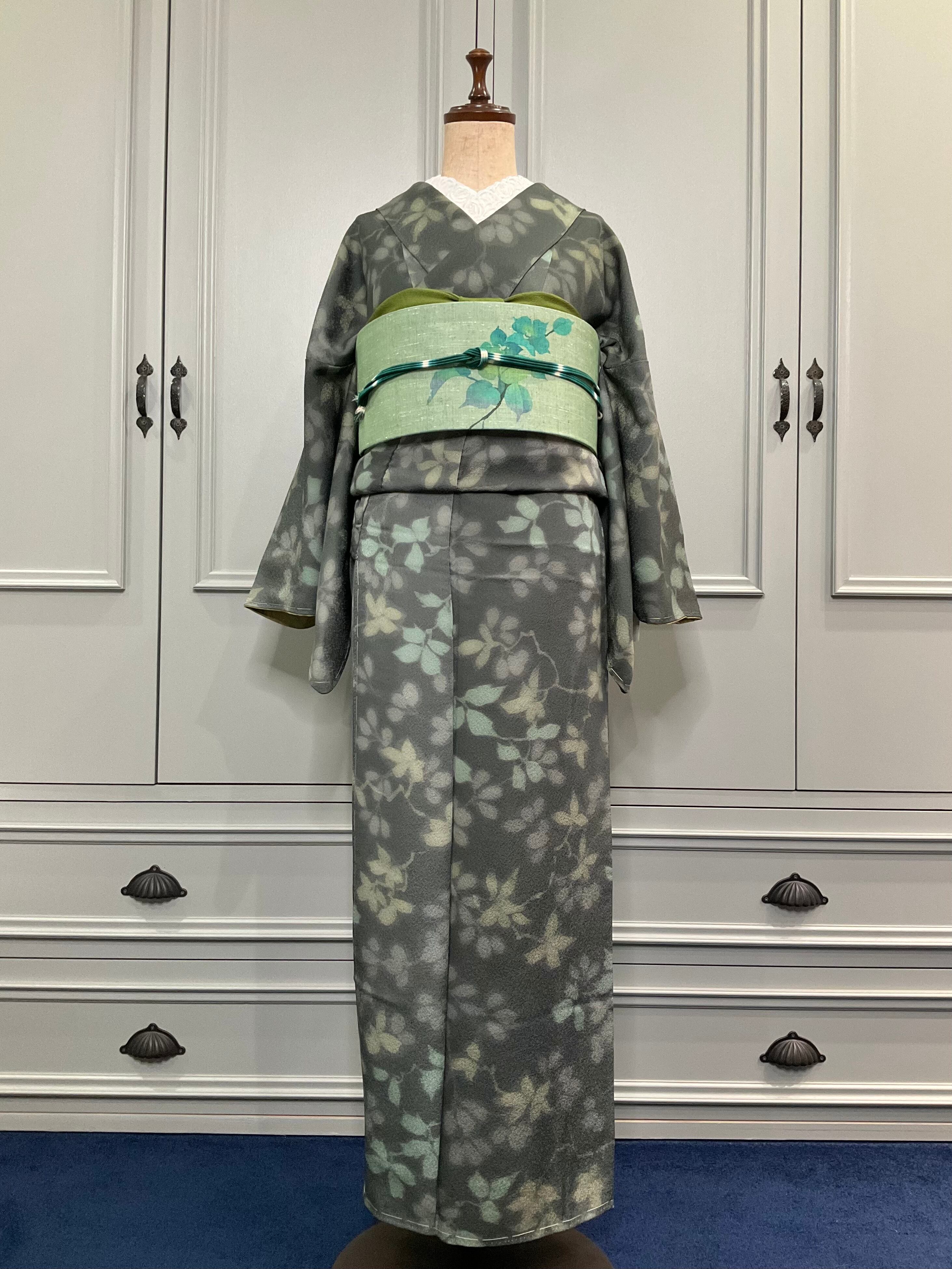 グリーン系の地色に、葉模様がデザインされた小紋着物です♪