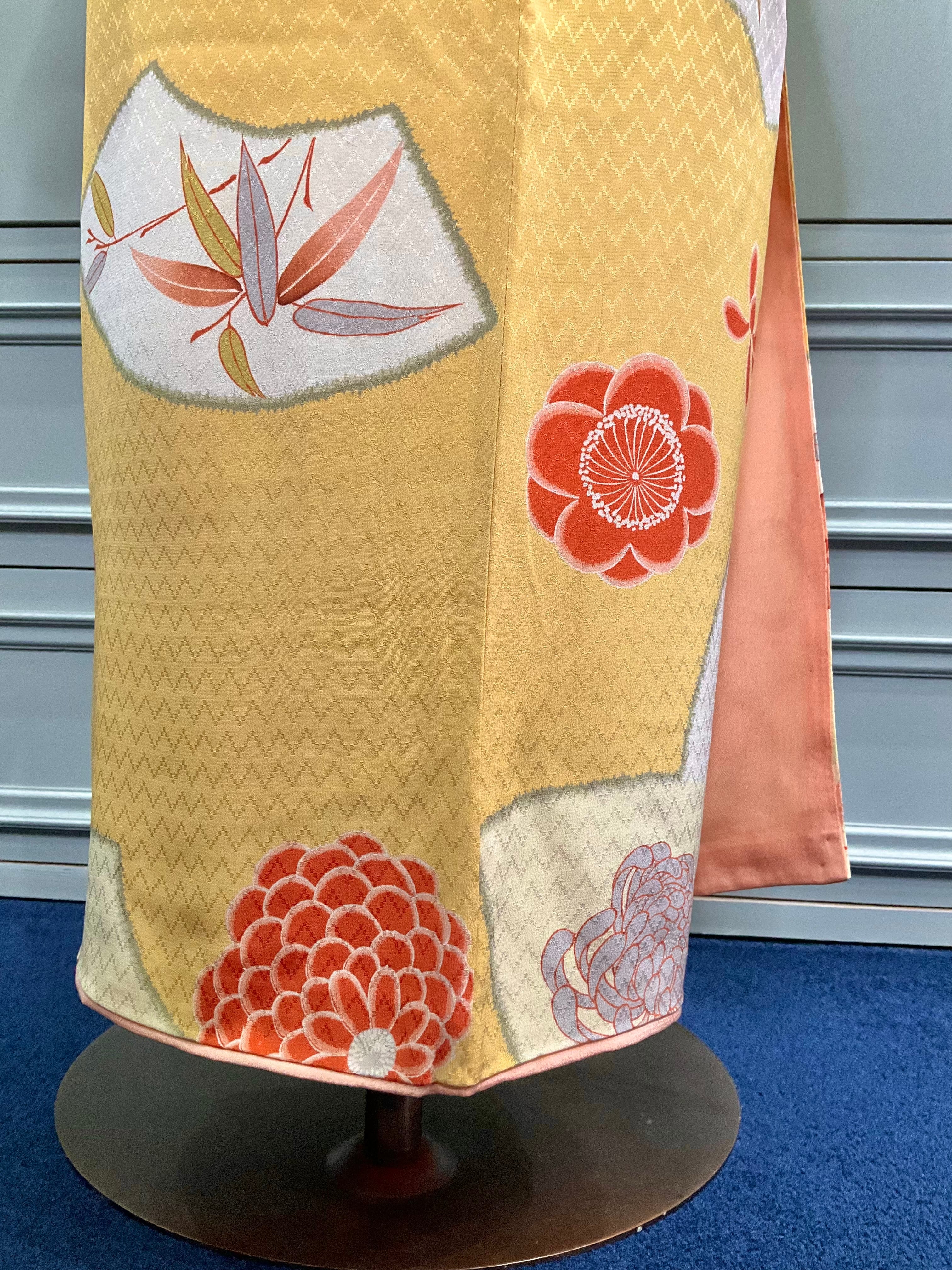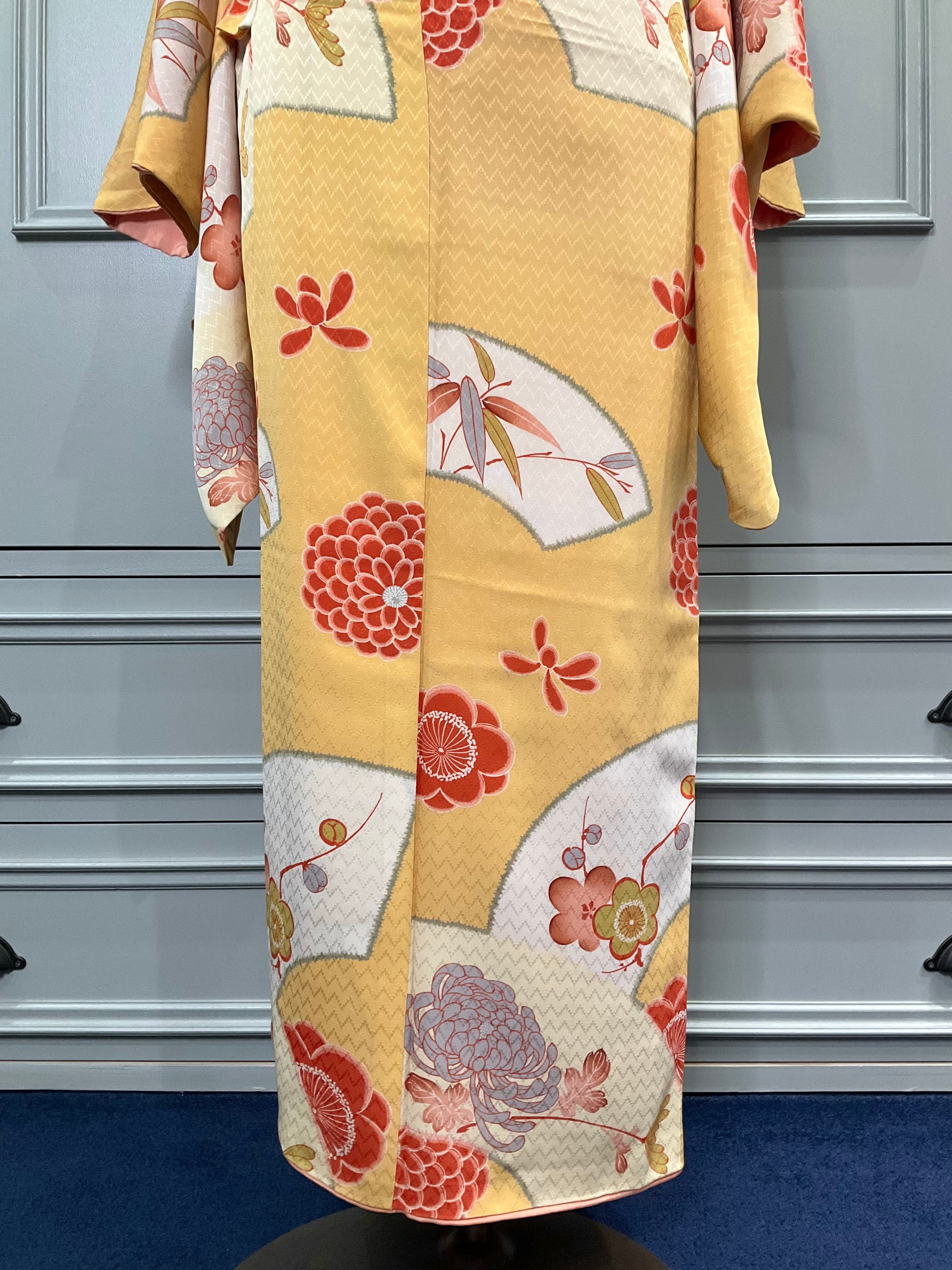 イエローの地色に、地紙模様と花模様がデザインされたアンティーク小紋着物です♪