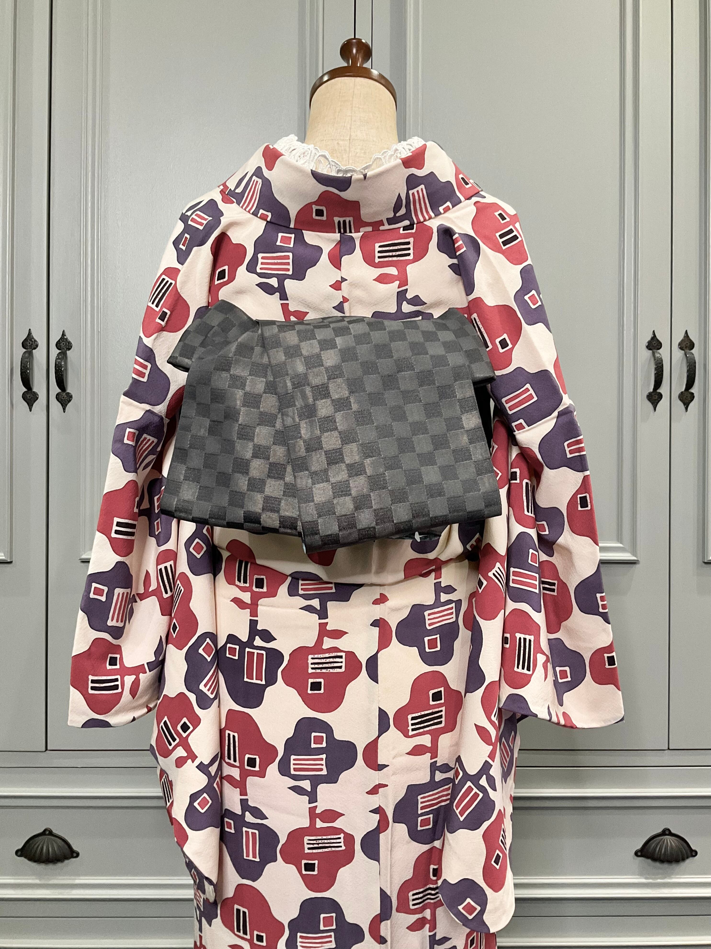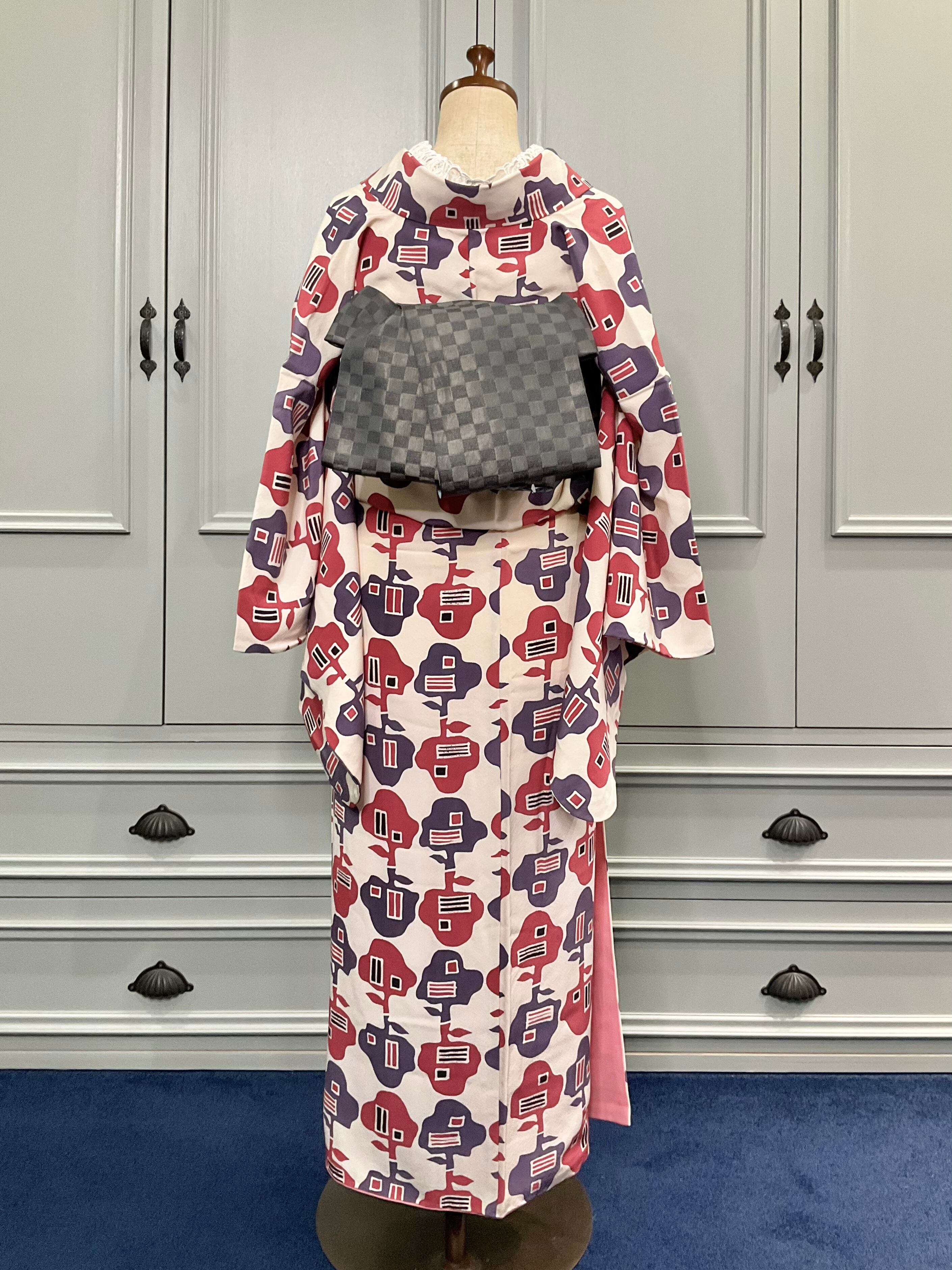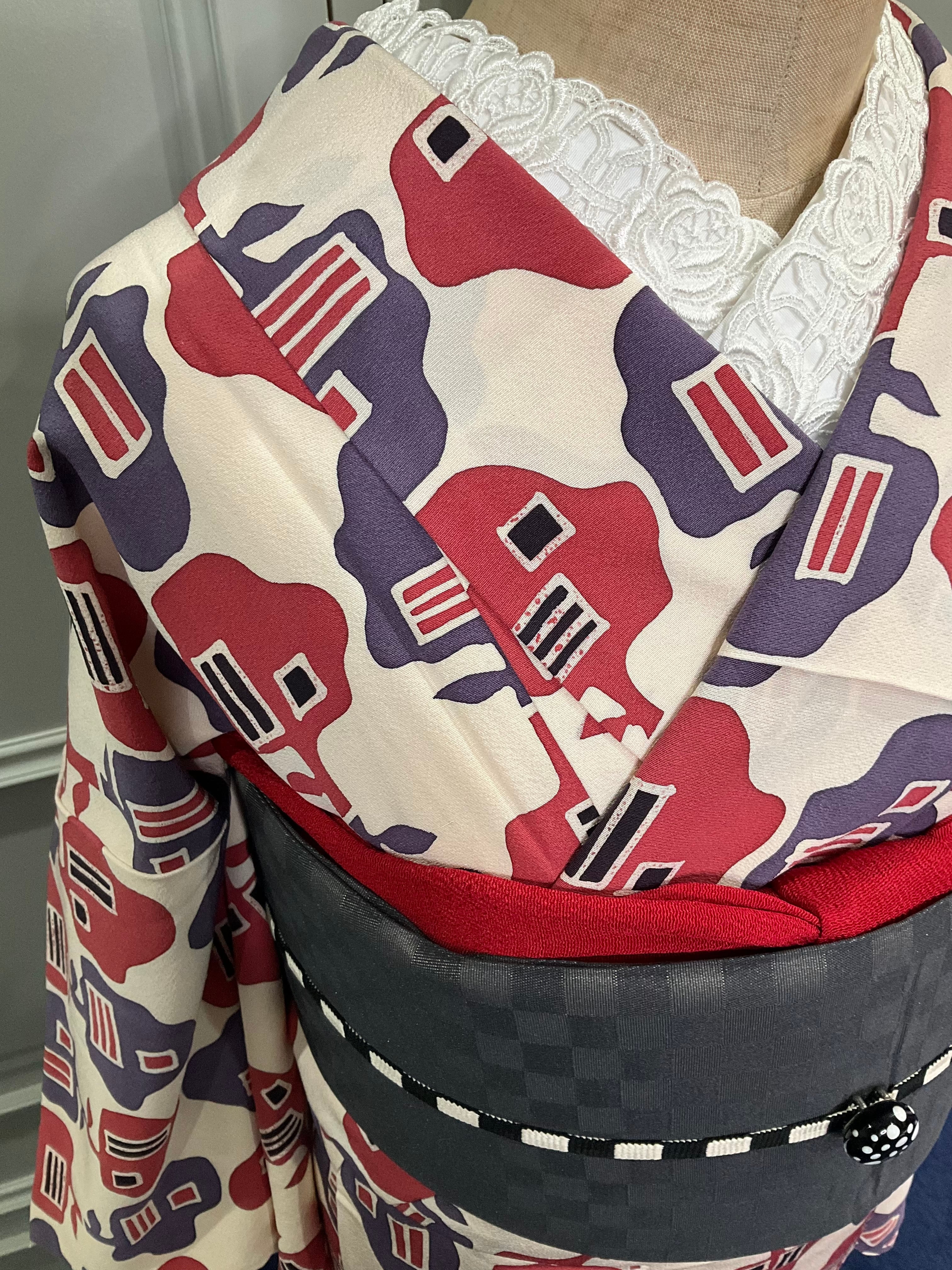 アイボリー系の地色に、レッド系×パープル系の抽象柄がデザインされた小紋着物です♪